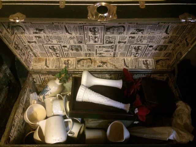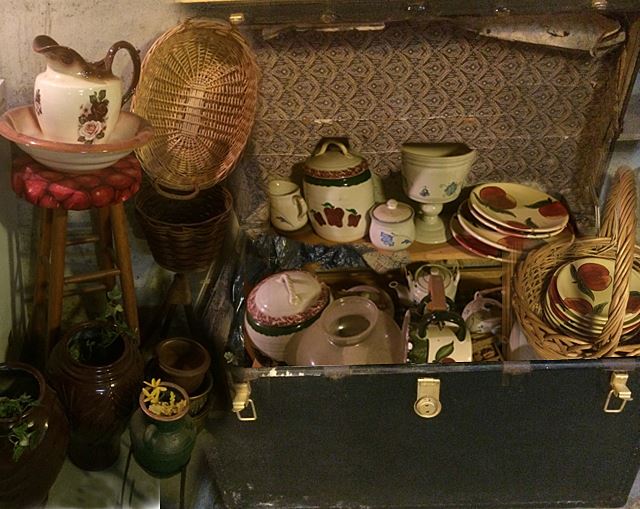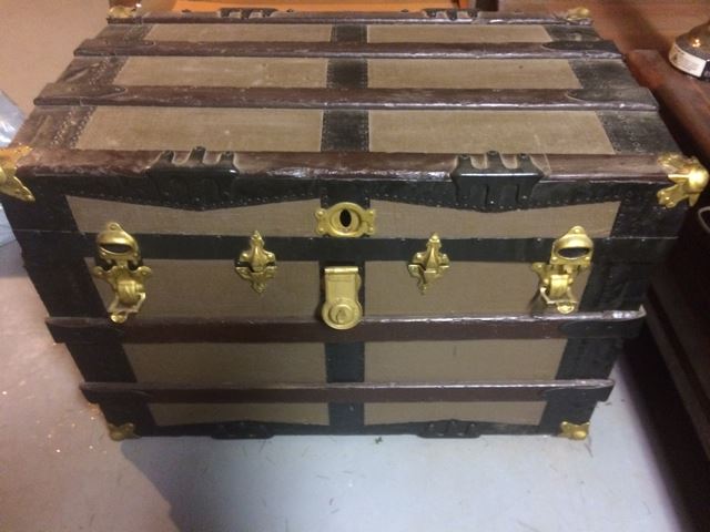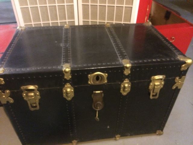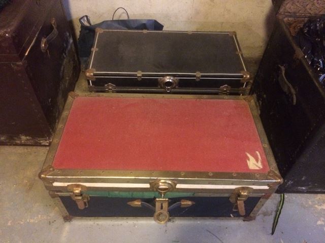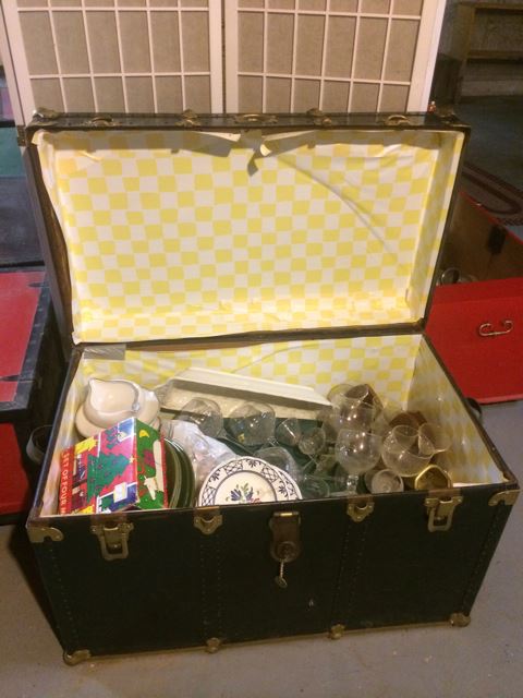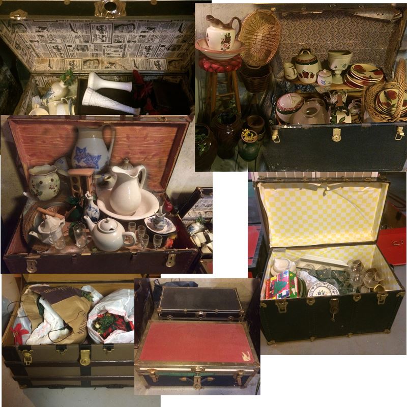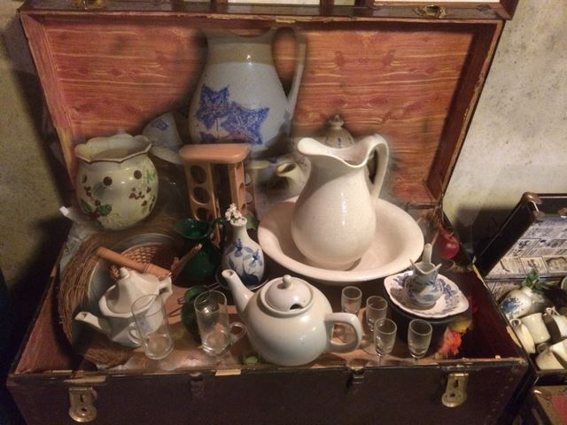 Very large estate lot includes 6 vintage trunks filled! Many items to be discovered, some items include pitchers and bowls, baskets, glassware, apple pattern dish set, vintage collectibles, and many many items yet to be discovered! Local buyer's take notice: These items are from a local estate and can be picked up in the Litchfield area. Being sold as is at the estate. Great opportunity on large discovery lot!