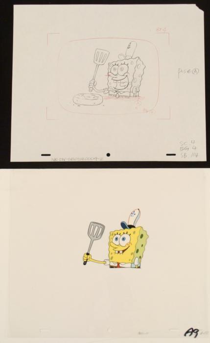 This original animation cel is from the Nickelodeon TV show SpongeBob Squarepants. The story takes place under the deep blue sea in Bikini Bottom, where SpongeBob resides. SpongeBob, who is a yellow, porous sponge, is your typical happy-go-lucky character, as he is always cheerful and enjoys making people laugh. Patrick Star, SpongeBob's neighbor who is a starfish, is your average children's show idiot, as he boasts knowing nothing and is often getting himself into ridiculous situations. Between the homes of these two lies the home of the miserable Squidward, a squid, who is known for being grouchy and playing tricks on SpongeBob and Patrick. Both SpongeBob and Squidward work at the Krusty Krab, a fast food business run by the greedy money-loving Mr. Krabs, a crab, the arch rival of the evil, possibly misunderstood, Plankton. Another neighbor, Sandy Cheeks, an athletic squirrel who normally wears an astronaut's space suit, was introduced in "Tea at the Treedome." She spends most of her time inventing and experimenting.SpongeBob is holding his trusty spatula. Original Production Animated Cel and Drawing Original "rough" animation drawing, in black and red pencil, with notations in black. Overall Size of Drawing: 10 1/2" x 12 1/2" Overall Size of Cel: 10 1/2" x 12 1/2" Excellent ConditionThis is an original hand-painted cel set-up used in the production of an episode of "SpongeBob SquarePants." Each one-of-a-kind set-up represents a slight change in position of the characters. When individually photographed and projected in rapid succession, the images appear to move.