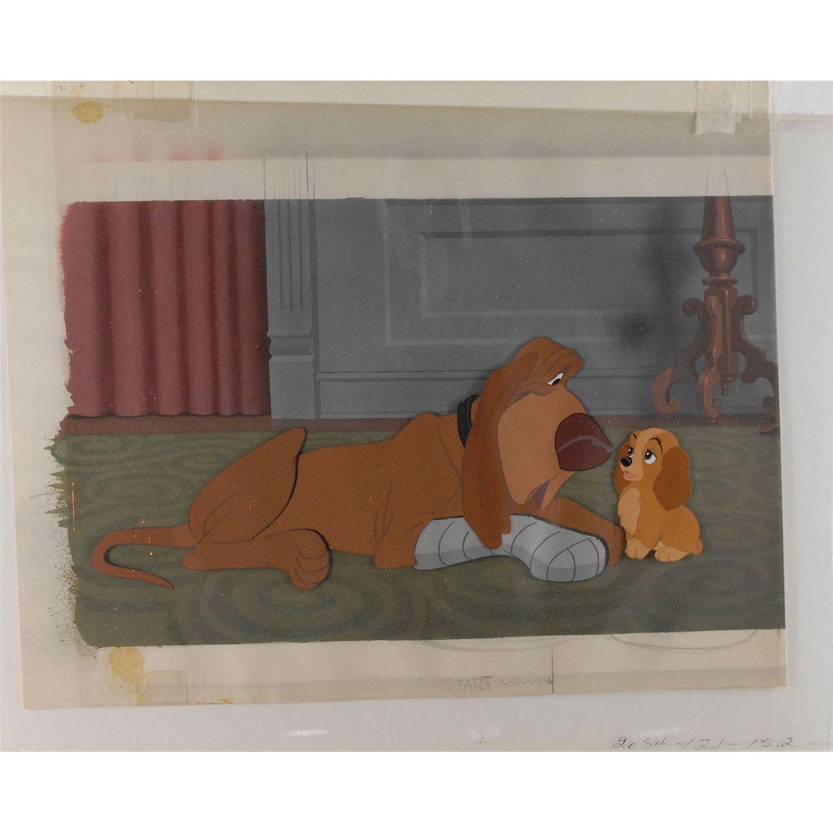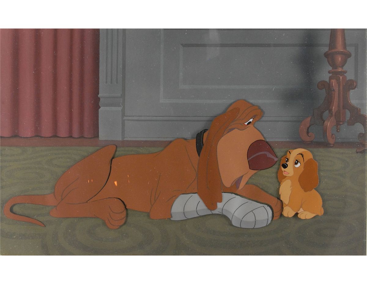 (Walt Disney Studios, 1955) Original production cel and production background featuring Trusty the Bloodhound and Baby Lady from Lady and the Tramp, showing them close together and looking at each other. The cel is placed on a non-matching hand-painted production background. Total image measures 11.75 x 5, with overall dimensions of 16.5 x 13.5. In fine condition. This is a wonderful setup composed entirely of production materials, and, though arranged later, is reminiscent of the heartwarming last Christmas scene when Trusty looks at the daughters of Lady and Tramp and says, ‘They’ve got their mother's eyes.’