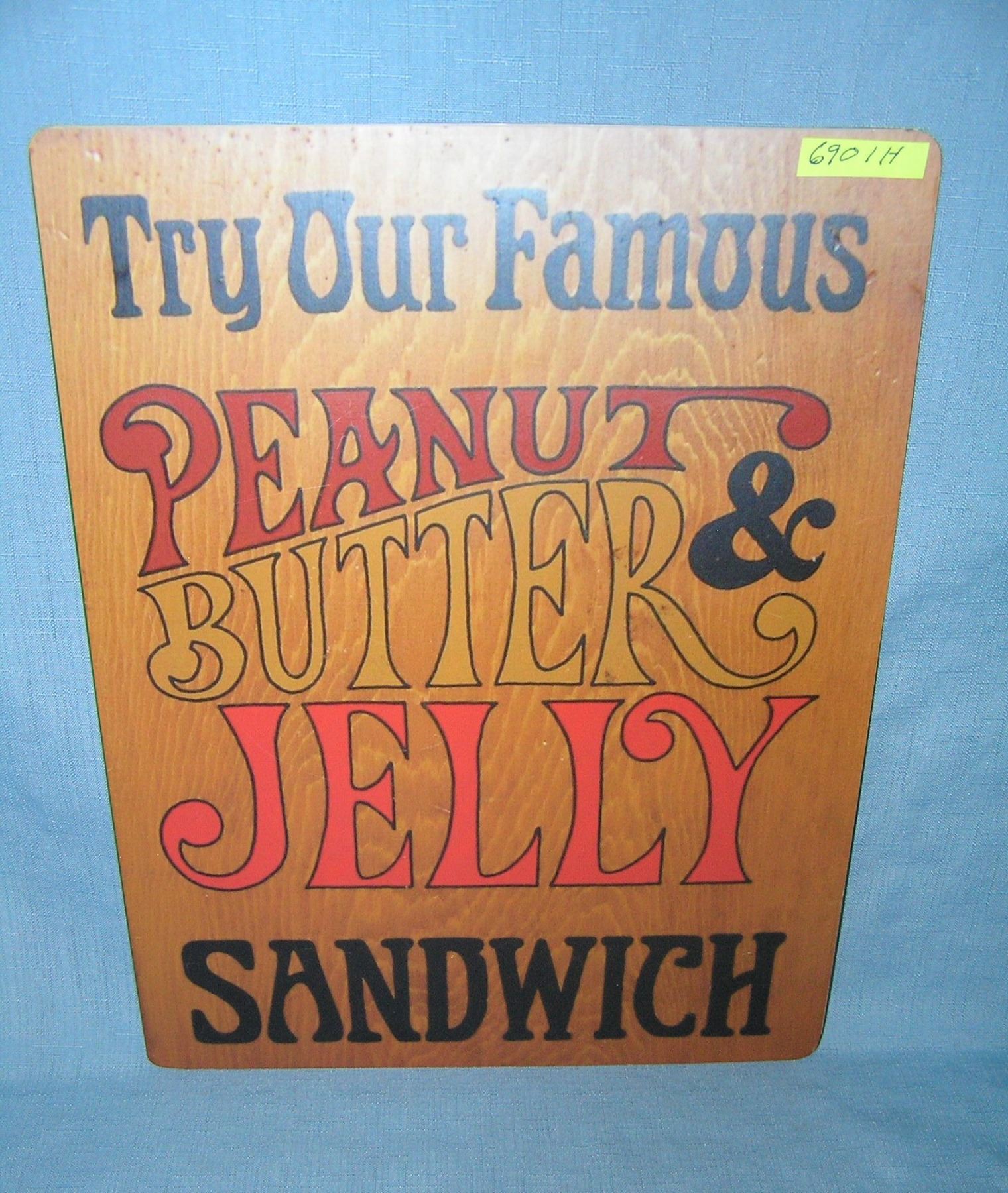 Try our famous peanut butter and Jelly sandwhich retro style advertising sign printed on PVC hardboard these signs are auctioned for their decorative and display purposes 12 inches by 16 inches est. value $50.00-$60.00