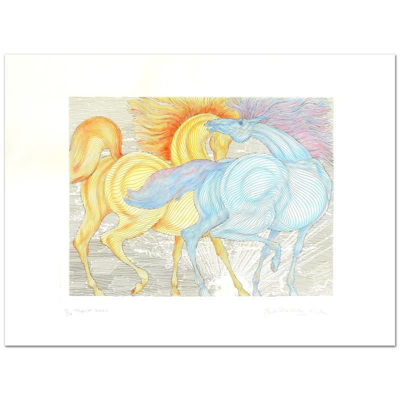 "Tryst" is a limited edition hand-watercolored etching on paper by Guillaume Azoulay! This piece is numbered and dated (2015), and hand signed by the artist. Includes Certificate of Authenticity! Measures approx. 29.5" x 22.5" (with border), 20" x 15" (image).