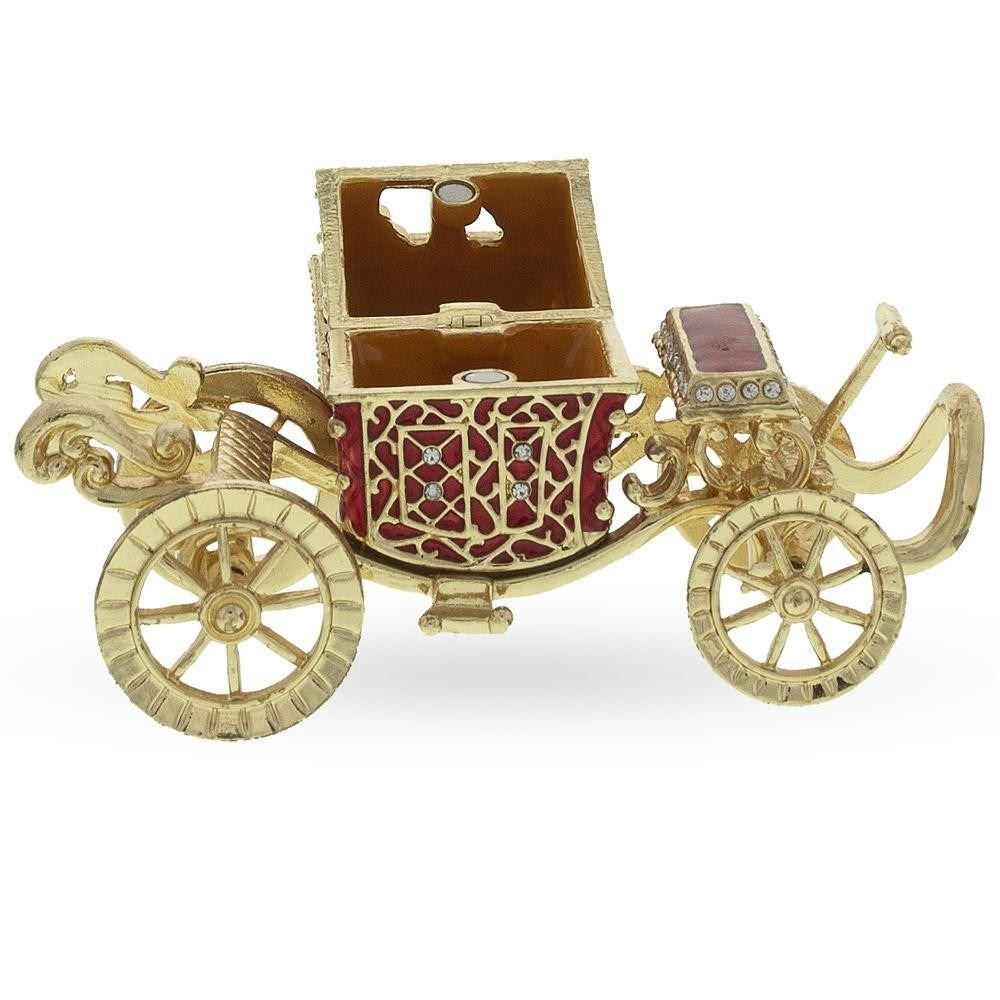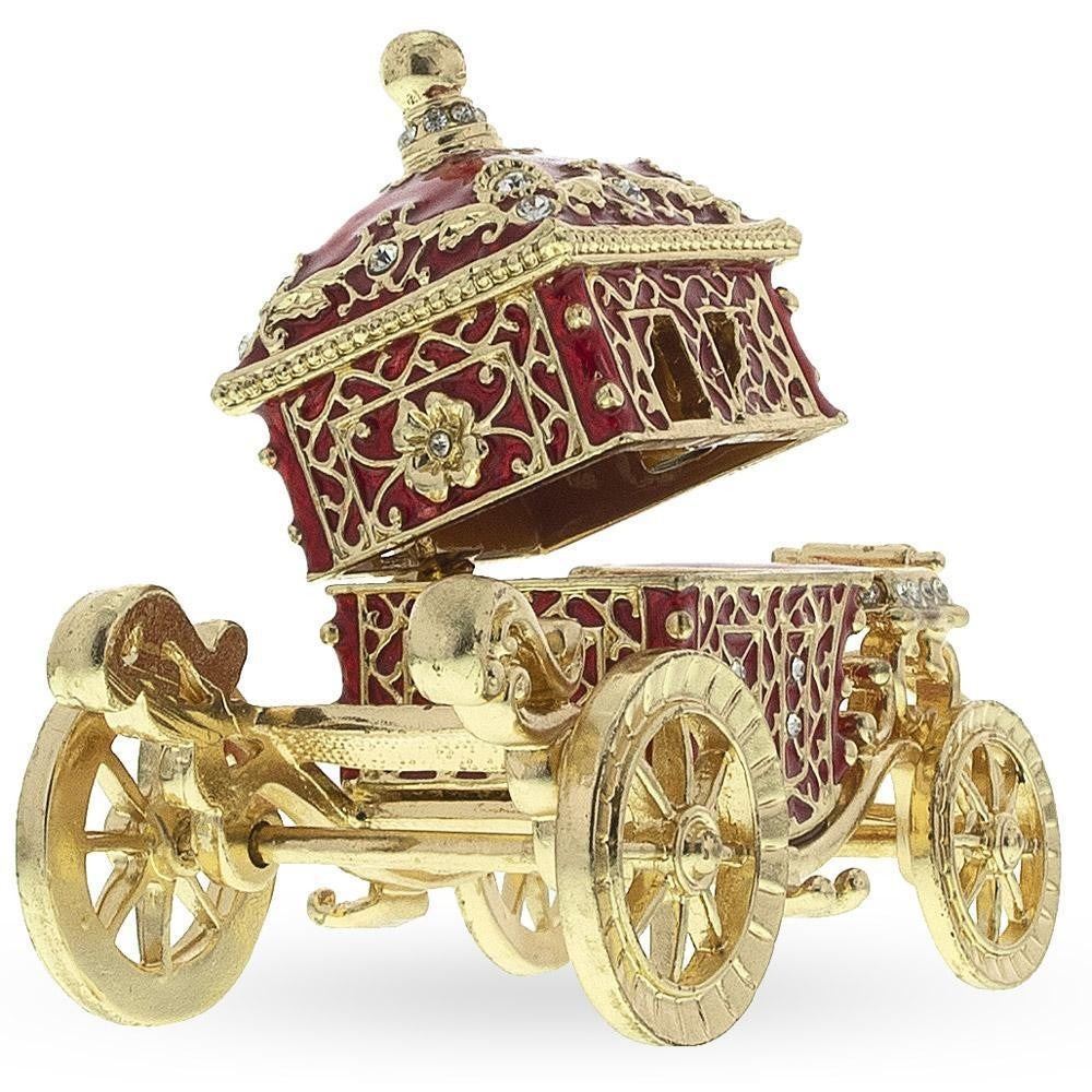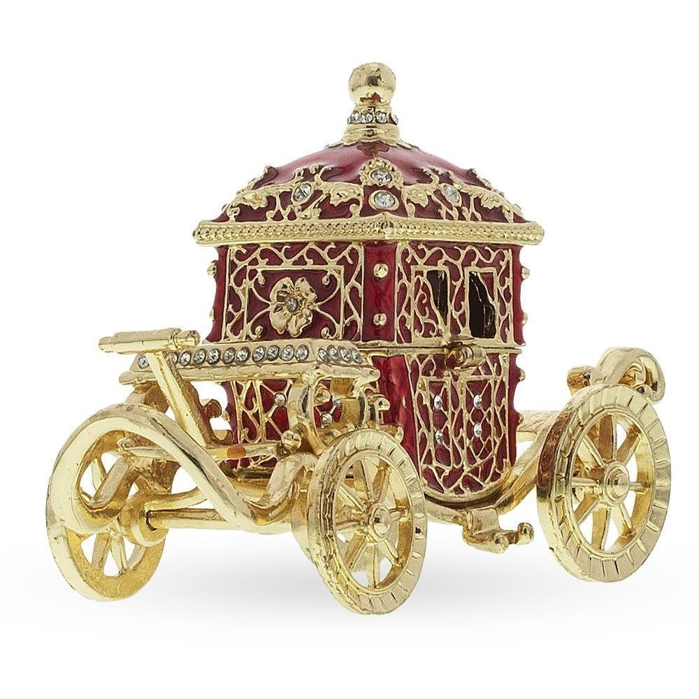 Tsar Coronation Coach Russian Trinket Jewelry Box 2.8 Inches Tall x 4.4 Inches Long 7.11 cm Tall x 11.18 cm Long Enameled Gold Plated Pewter Hand Painted Gift Boxed This hand-painted sparkling jewelry trinket box is adorned with a high-polished red enamel with golden trim. The trinket box opens on a hinge and closes shut with a magnet, to keep the box securely shut. The piece comes in a beautiful gift box.