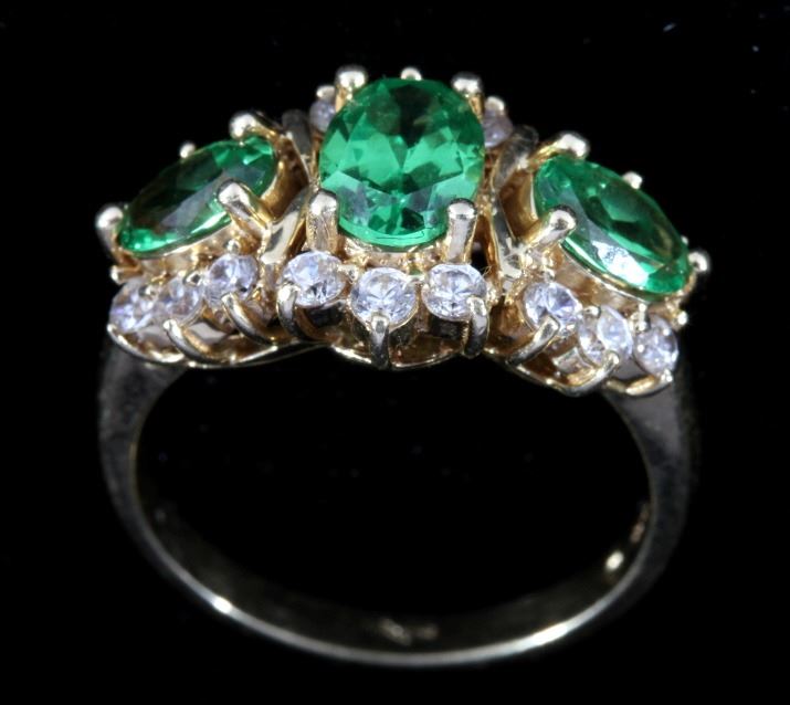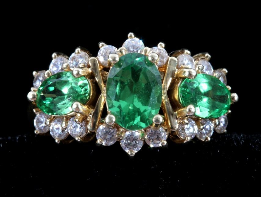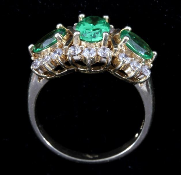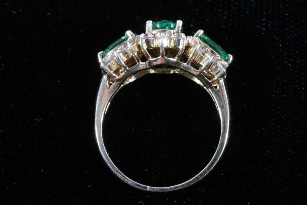 This is a 14k yellow gold ring with excellent Tsavorite Green Garnet stones surrounded by round brilliant Diamonds. The ring has a wonderful design and is in good condition. The ring is marked K14. Ring is a size 5.5 to 6.