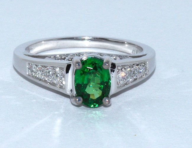 14k White Gold, Tsavorite 1.04ct Excellent Oval Cut Great Color Green, .28ctw Round Diamond G-H color VS-SI clarity, great detail all ring with diamond, Appraised Retail Value $13,500.00