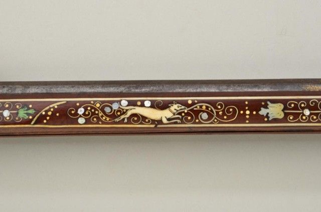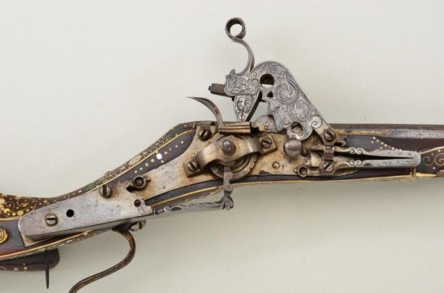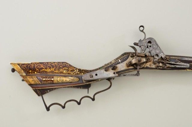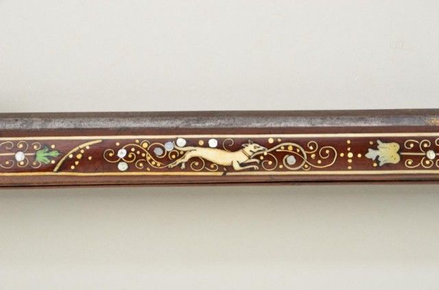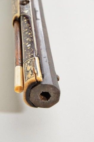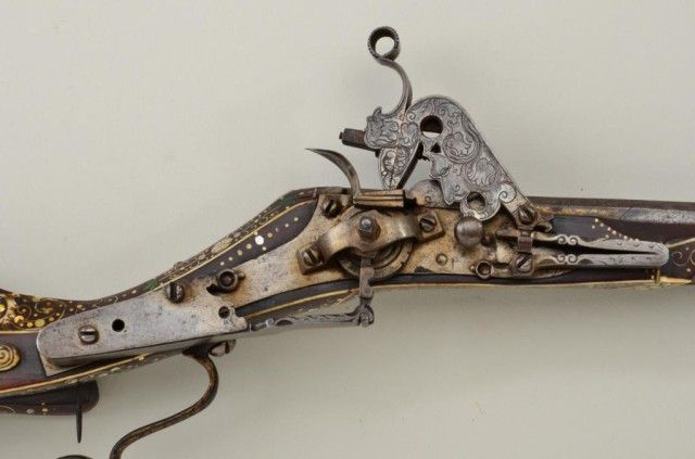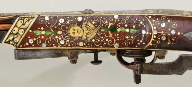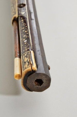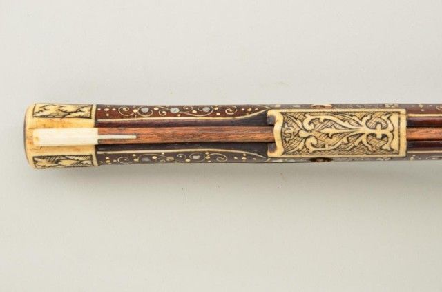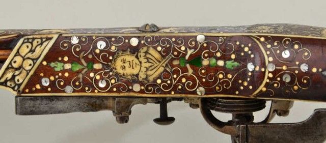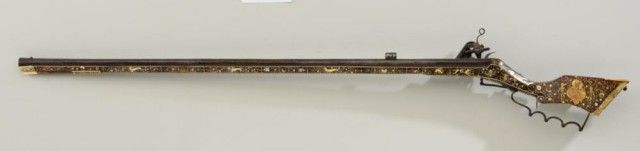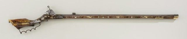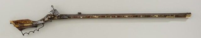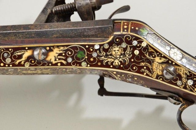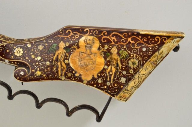Tshinke style wheel lock rifle from Czechoslovakia region, circa mid 17th century with fully and ornately bone inlaid stock with pearl and dyed accents and nicely engraved hammer. The arm measures 48”overall with 36-1/2” barrel of approx 32 cal with rifled bore. The inlay shows dogs, florals, rabbits, scrolls, portrait of noble and a coat of arms on cheek piece with two angels in attendance. 90% of inlays areoriginal and 10% are restorations using a dyed composite material which is detectable but difficult to spot. There are some faint traces of gold in the engraved three panels on the barrel and the hammer is nicelyengraved. A bone tipped ram rod is included and a couple small inlays are missing. The metal is in good condition with a dark patina, minor pinprick pitting. A collection number or museum number 324 is stamped inthe stock by the front of trigger guard. The replaced inlays are acceptable for display but a sophisticated collector would replace them with shin bone from a cow which is what they were originally. From an old N.Y.