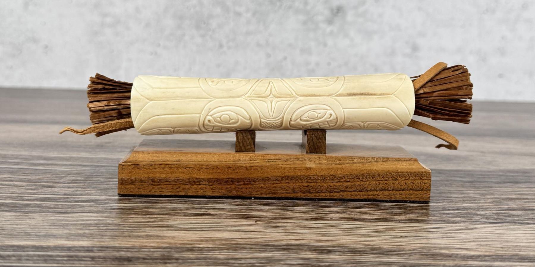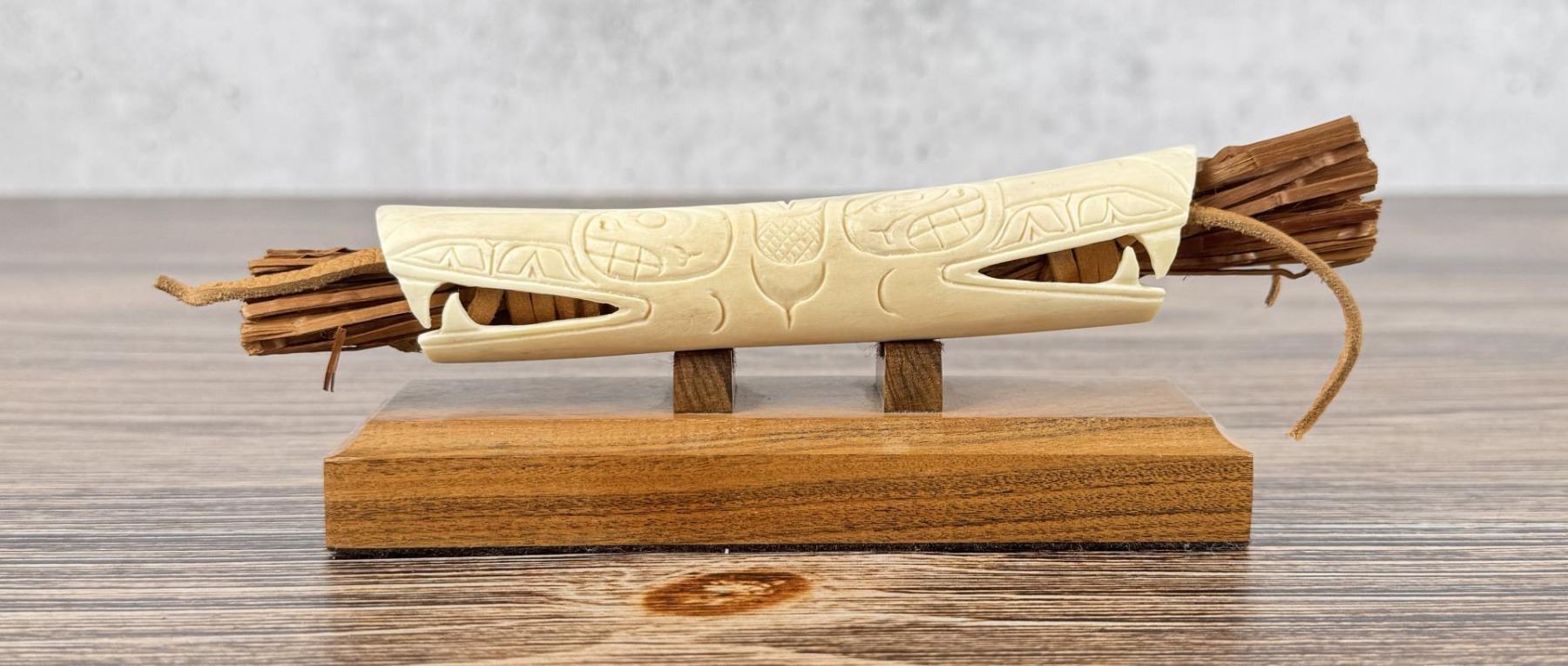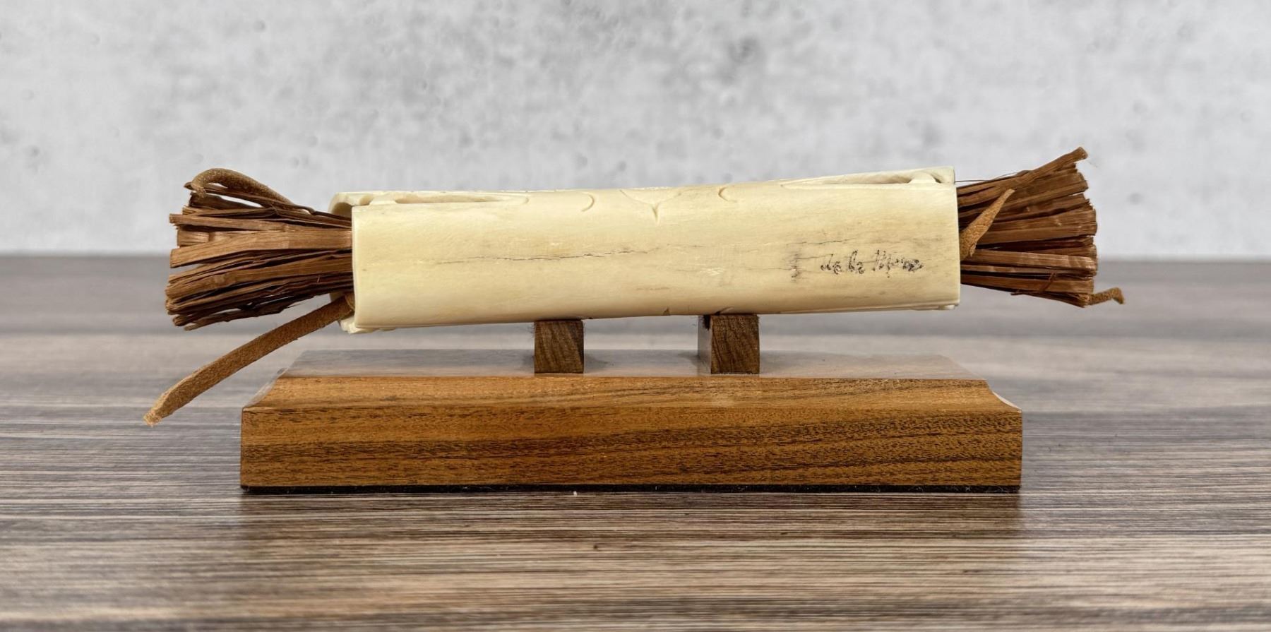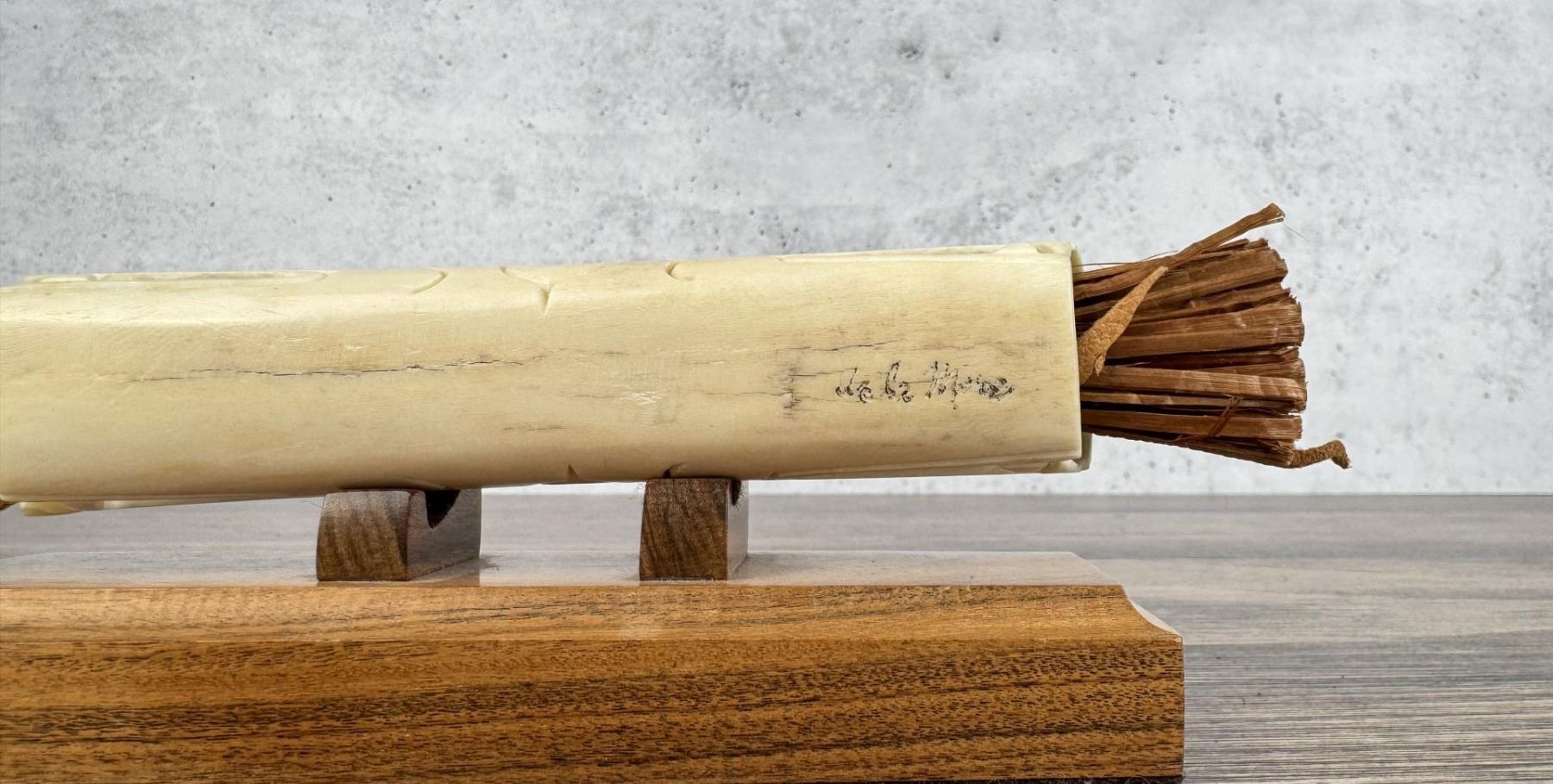 Signed as shown. 8" by 2 3/8" by 2" on stand.