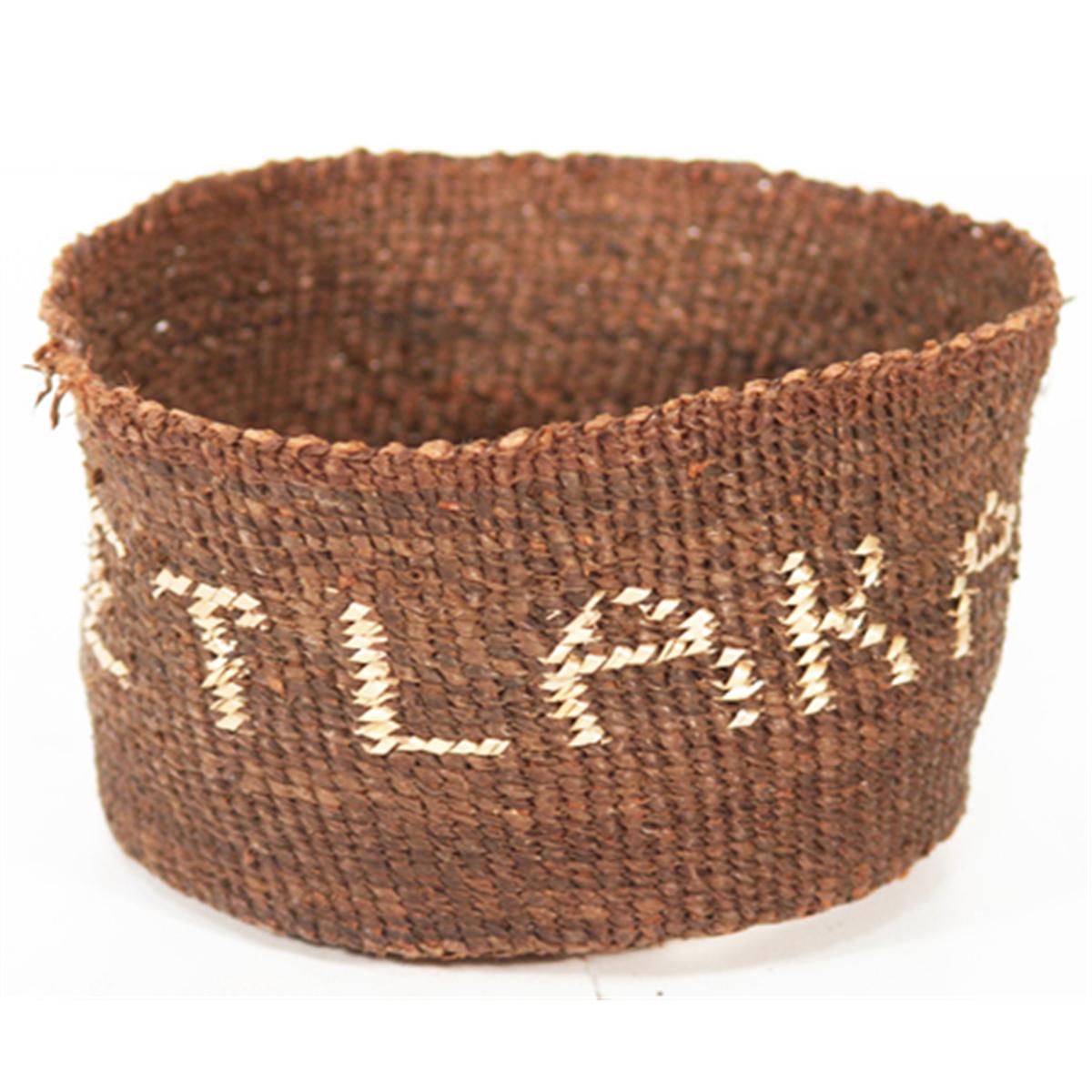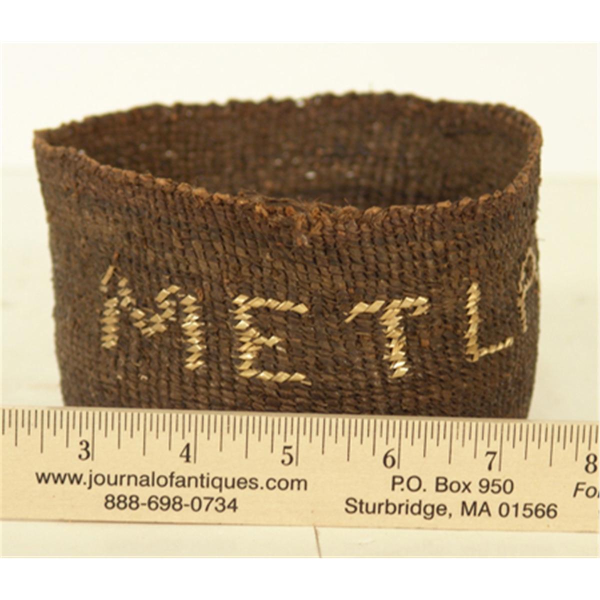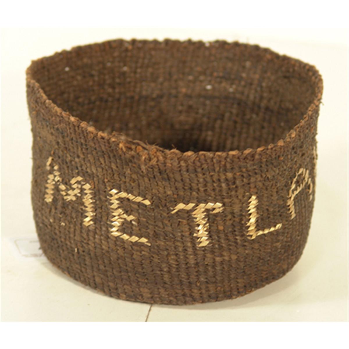Unique custom made soft weave bowl with the word "Metlakhtla" done in imbricated gold stitch around the sides. Condition: very good. 3-1/2" x 6-1/2"