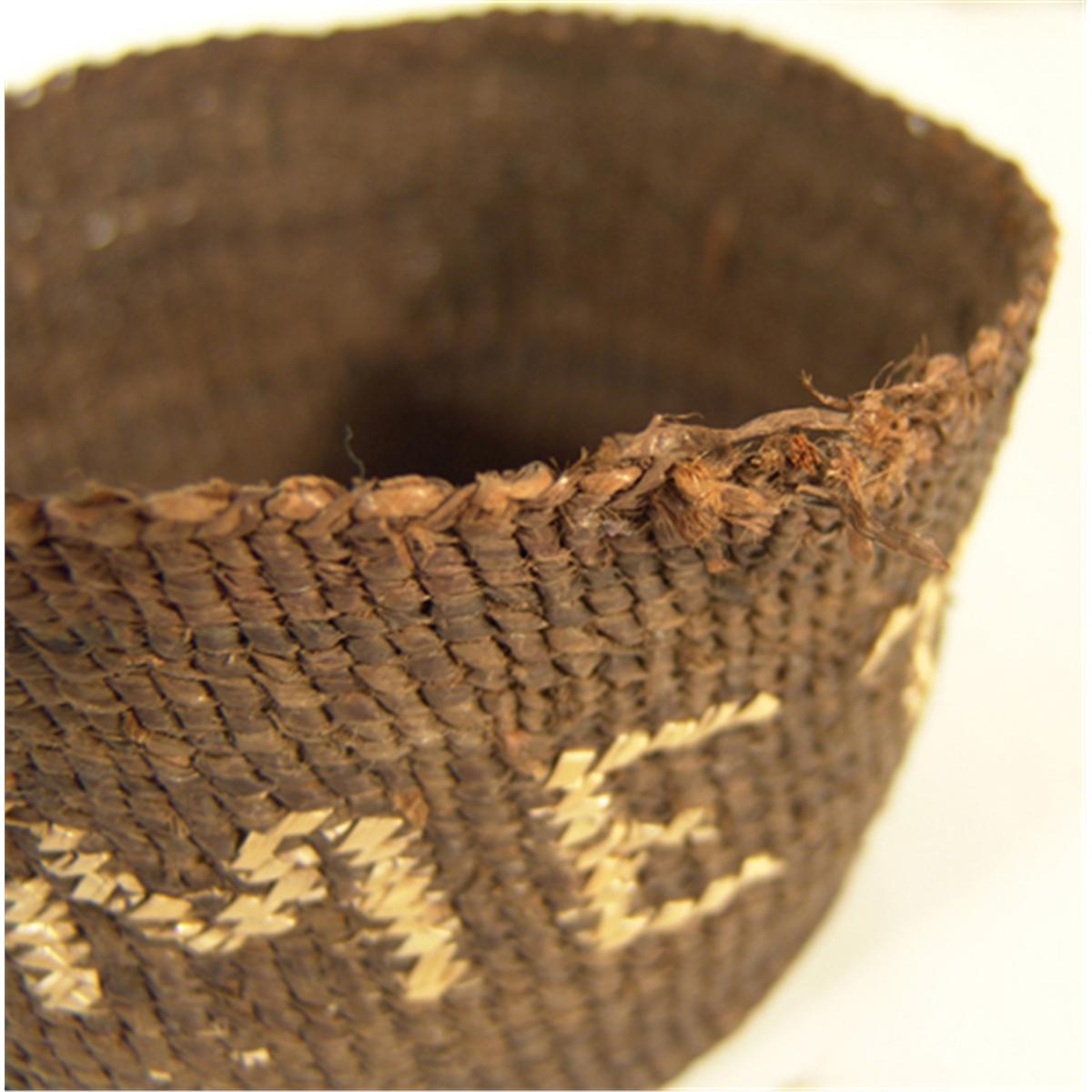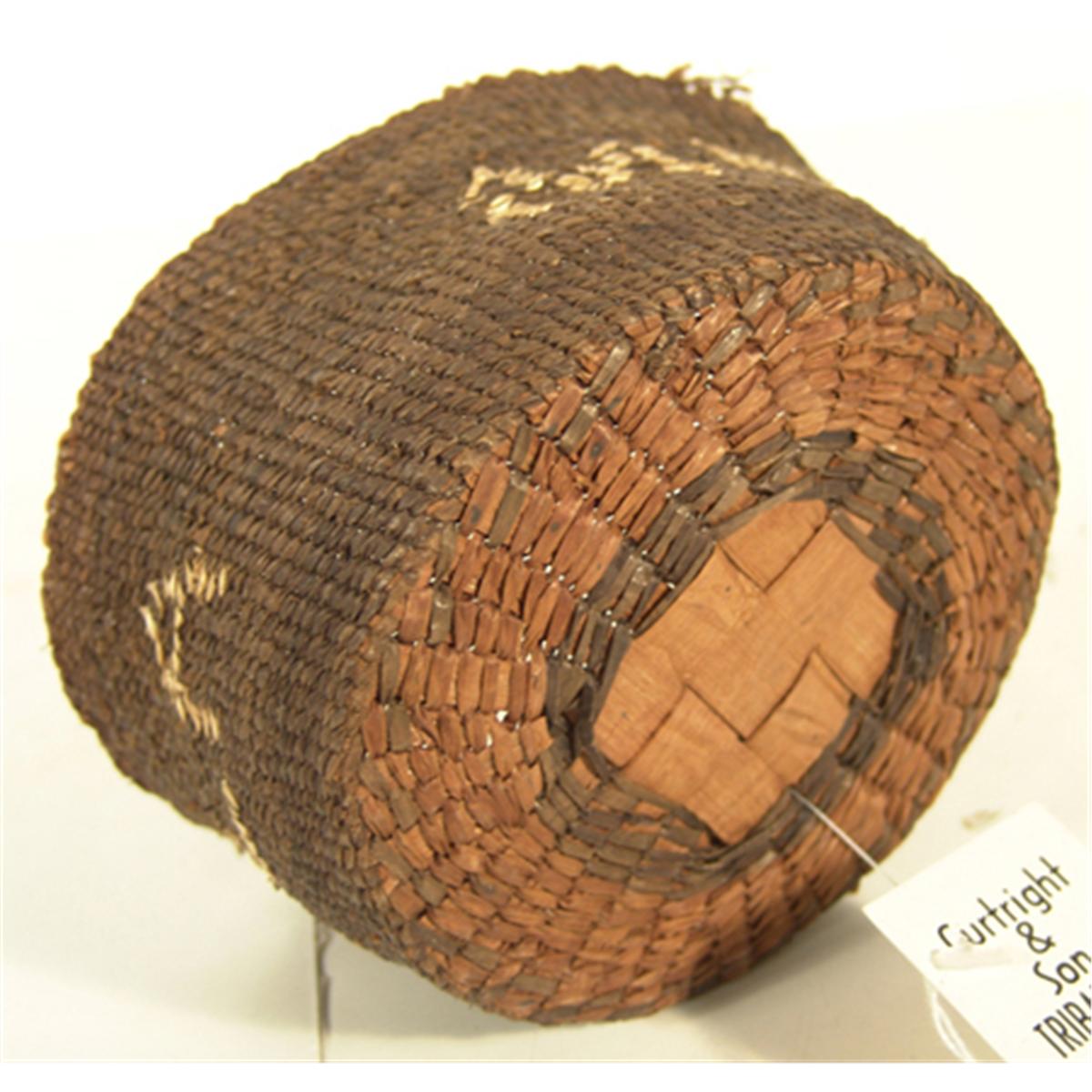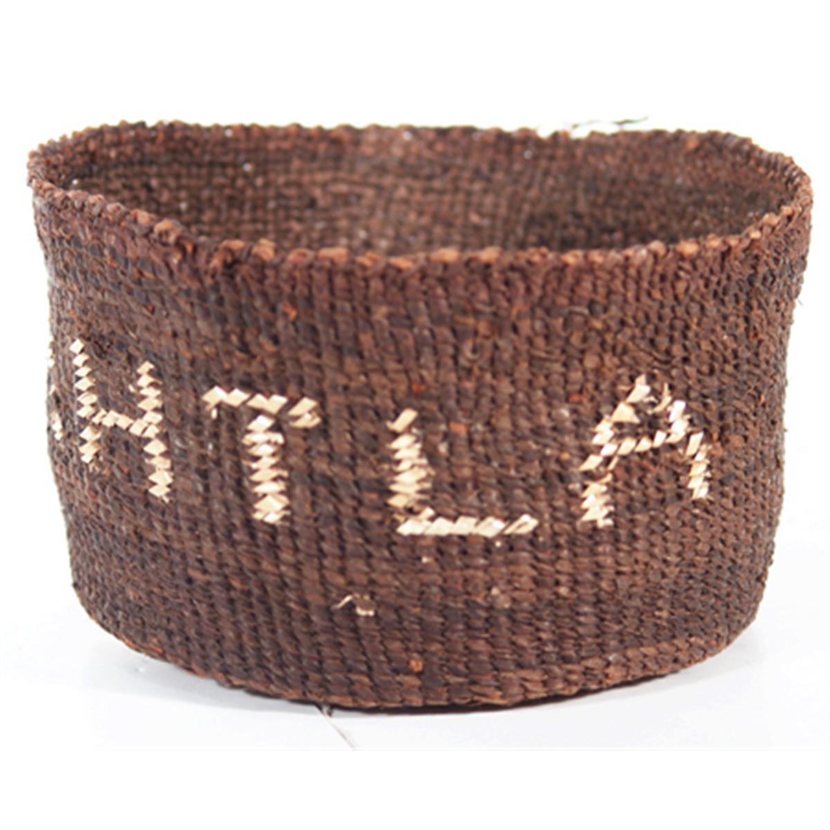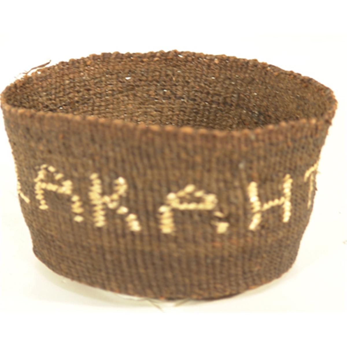 Unique custom made soft weave bowl with the word "Metlakhtla" done in imbricated gold stitch around the sides. Condition: very good. 3-1/2" x 6-1/2"