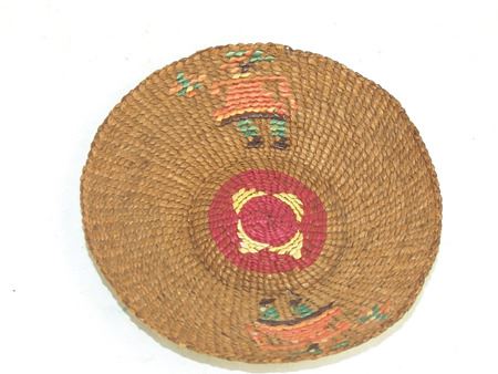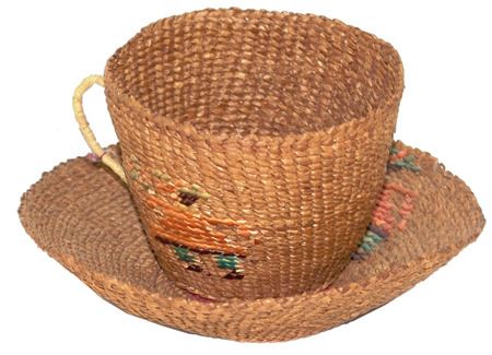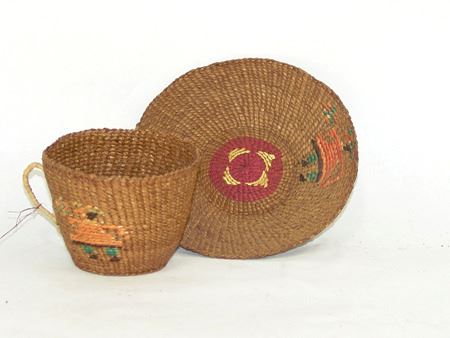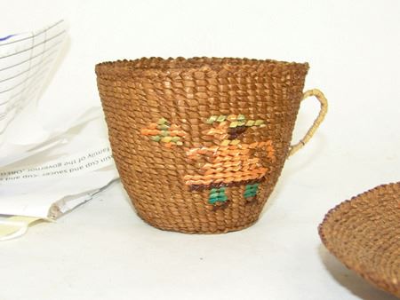 Mid 1900s, Unique twined weave basketry cup and matching saucer, both with matching imbricated human figures. Very good condition. Ex. Arthur Erickson Collection. 1" x 6" & 2-3/4" x 3"