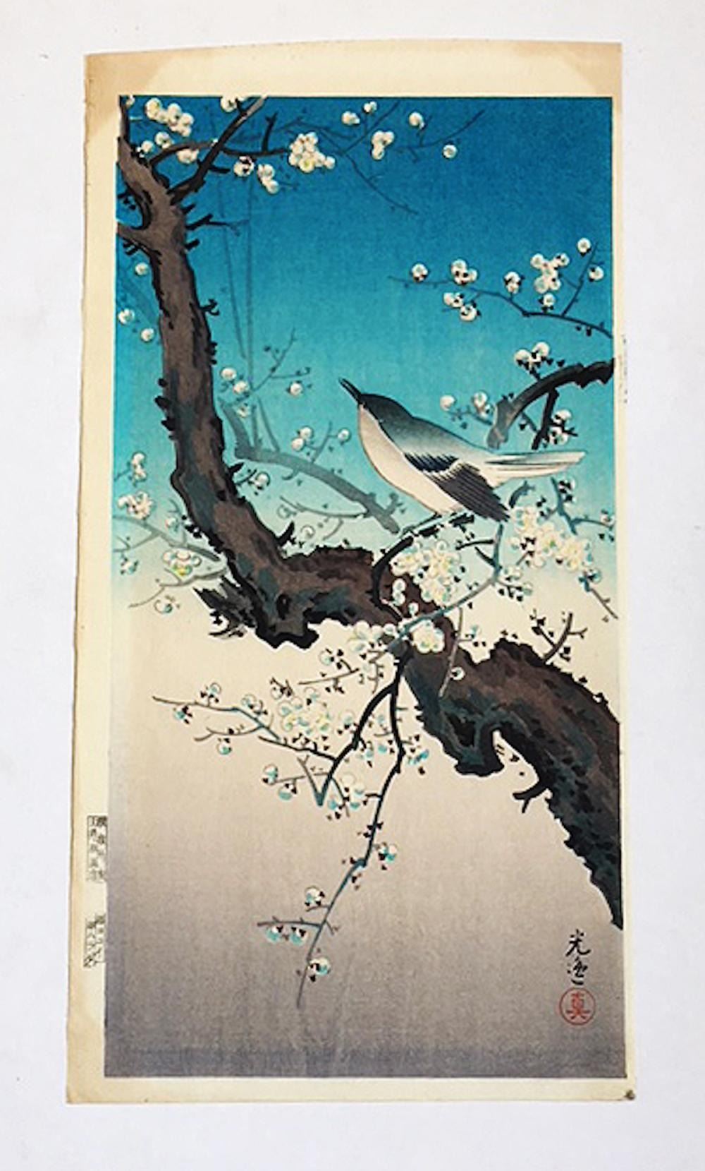 Tsuchiya Koitsu- Plum Warbler. Circa: 1940's. Publisher: Doi Hangaten. Format: Mitsugiri, 18.2 x 35 Cm (approximately 15 x 8 inches). FINE CONDITION