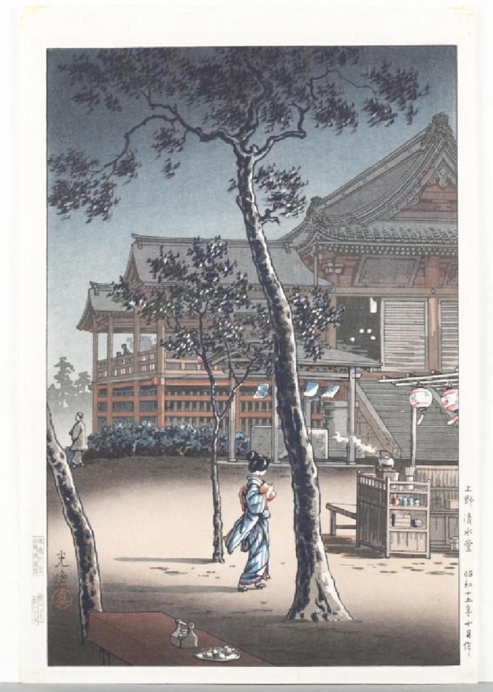 A Japanese woodblock print. Tsuchiya, Koitsu (Japan, 1870-1949). Kiyomizudo (Temple) In Ueno. 1940. Oban, approx. 15"h x 10"w. FINE CONDITION