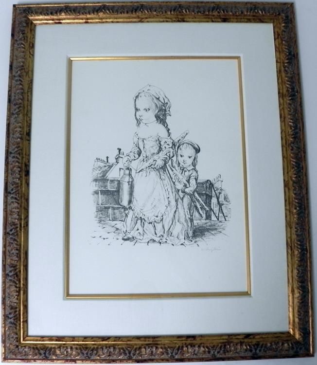 Artist: Tsugouharu (Leonardo) Foujita - Edogawa Tokyo 1886-1968 Zurich (French/Japanese)Title: Two Children Carrying Bread and Milk, circa 1954Medium: Lithograph on vellum paperSignature: In pencil, lower right corner; signed FoujitaEdition: Printers Proof on vellumImage size: 13 1/2" x 18 1/2"Frame size: 23 1/2" x 28 1/2"Condition: Very good, some wear to the frameBiographyTsugouharu Foujita was born in Japan and studied at the Imperial School of Fine Arts in Tokyo. By 1910 he had received several medals and prizes; the Japanese Emperor even purchased one of his paintings. On a trip to Korea in 1911, he was asked to paint the king. Foujita seemed destined for a career in the Orient until he traveled to London in 1912 and then, in 1913, went to live in Paris. He discovered European contemporary art, much as the French, in the nineteenth-century, had discovered Japanese prints. He then returned to Paris where he continued to paint and occupied himself with charitable functions as president of the Association of Japanese Artists. Foujita died in Zurich at the age of eighty-one and was buried in the cathedral city of Rheims, where he had decorated a chapel after embracing Catholicism. As one of the oldest members of the School of Paris, Foujita was a friend to Braque, Picasso, and Rousseau, all of whom subtly influenced his style. Foujita bridged the gap between Eastern and Western art in his narrative works, executed in a clear, flowing line and with paint applied in thin, very smooth layers of soft colors tending to grays, mauves, pale ochers, and blacks. Even in the liveliest of his narratives his mood and effects are dreamily quiet, almost timeless in their clarity. *retrieved from: http://www.dropbears.com/a/art/biography/Tsuguharu_Foujita.html