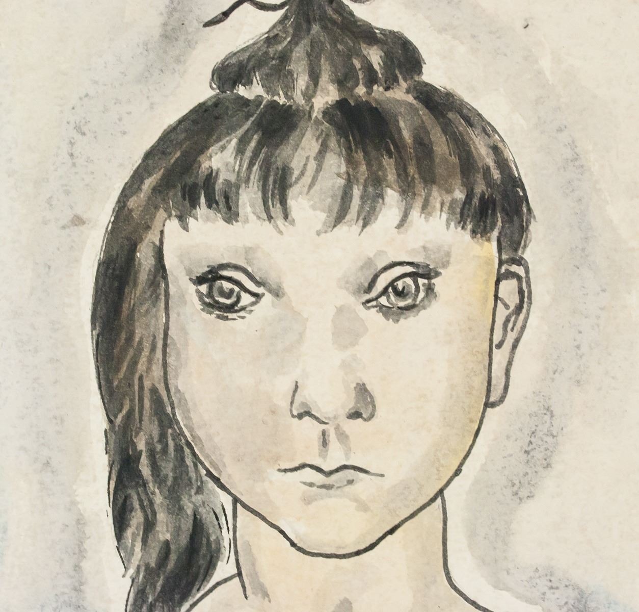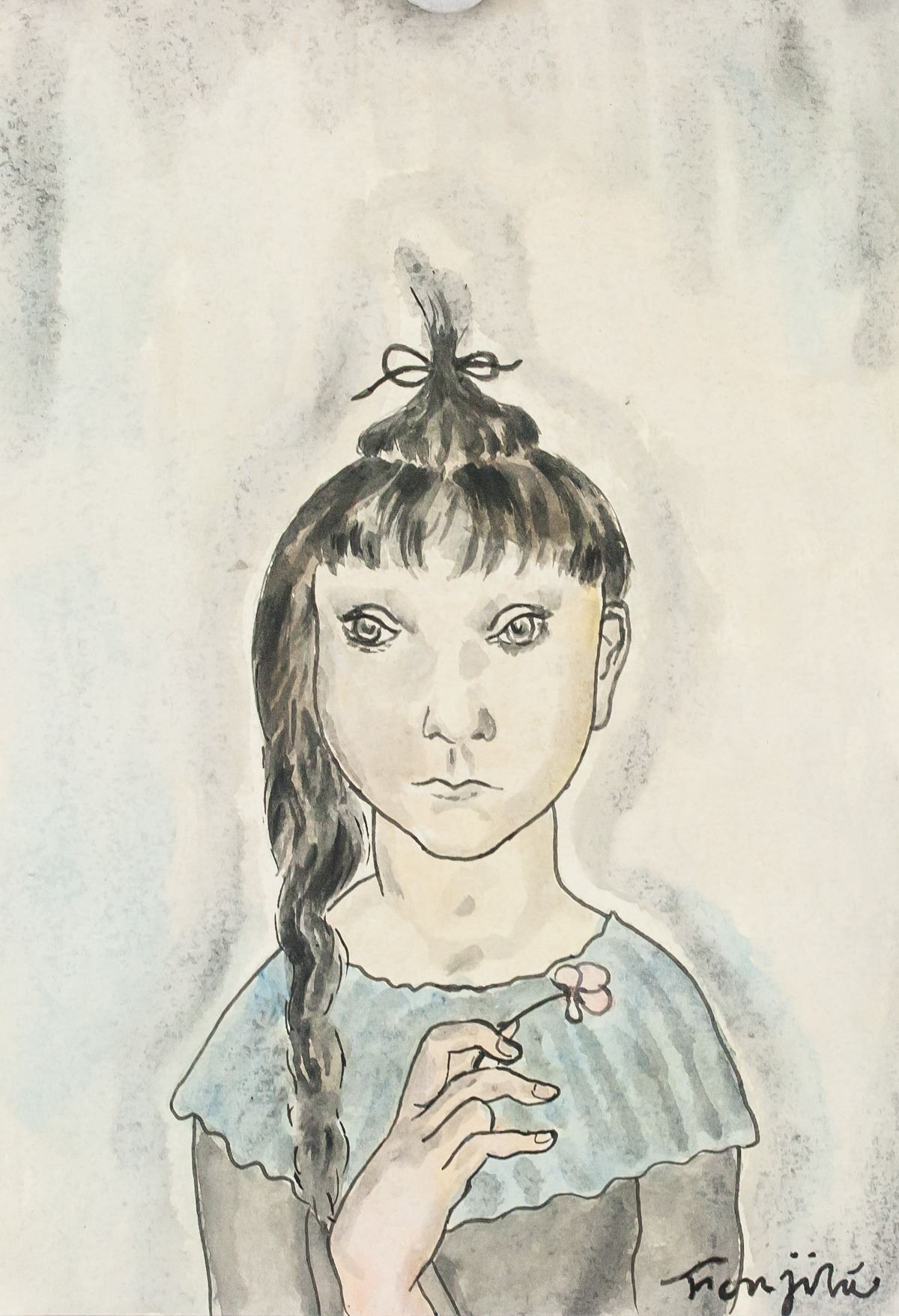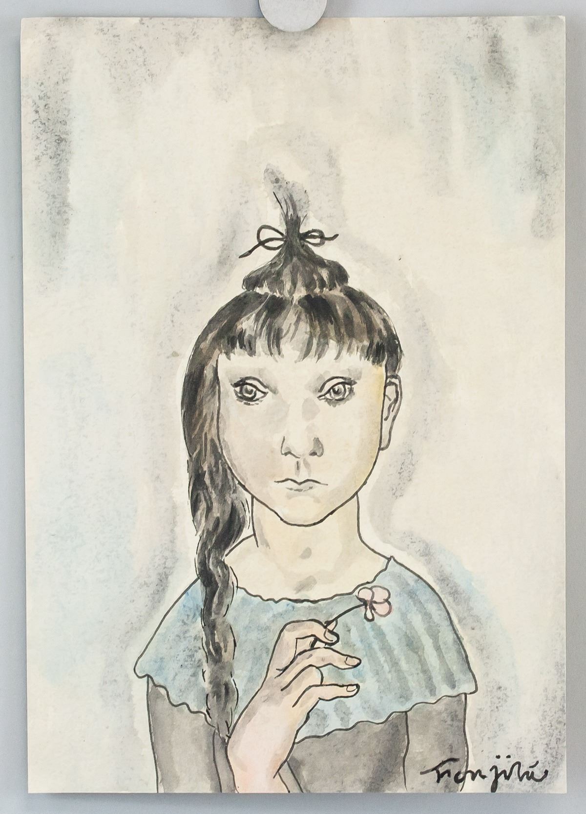 Watercolor on paper. Featuring portrait of a black haired woman holding a small pink flower in her hand. Signed "Foujita" in the bottom right corner. "TF 45" inscribed on verso. Stamped with "29 Rue d'Astorn [illegible]" on verso. Attributed to Tsuguharu Foujita (1886-1968, French-Japnese). 20 x 28 cm (8 x 11.3 in). Provenance: This lot carries limited provenance from a Southern Ontario estate