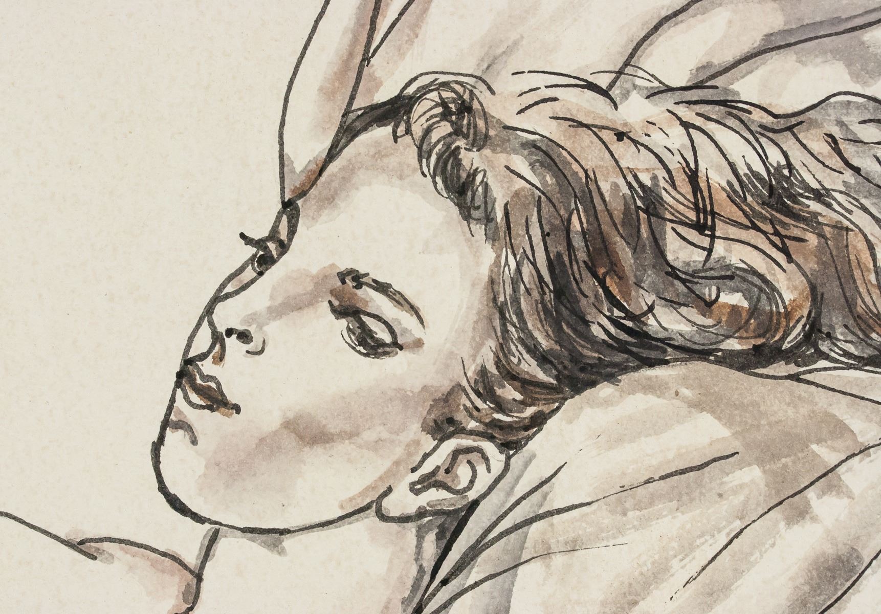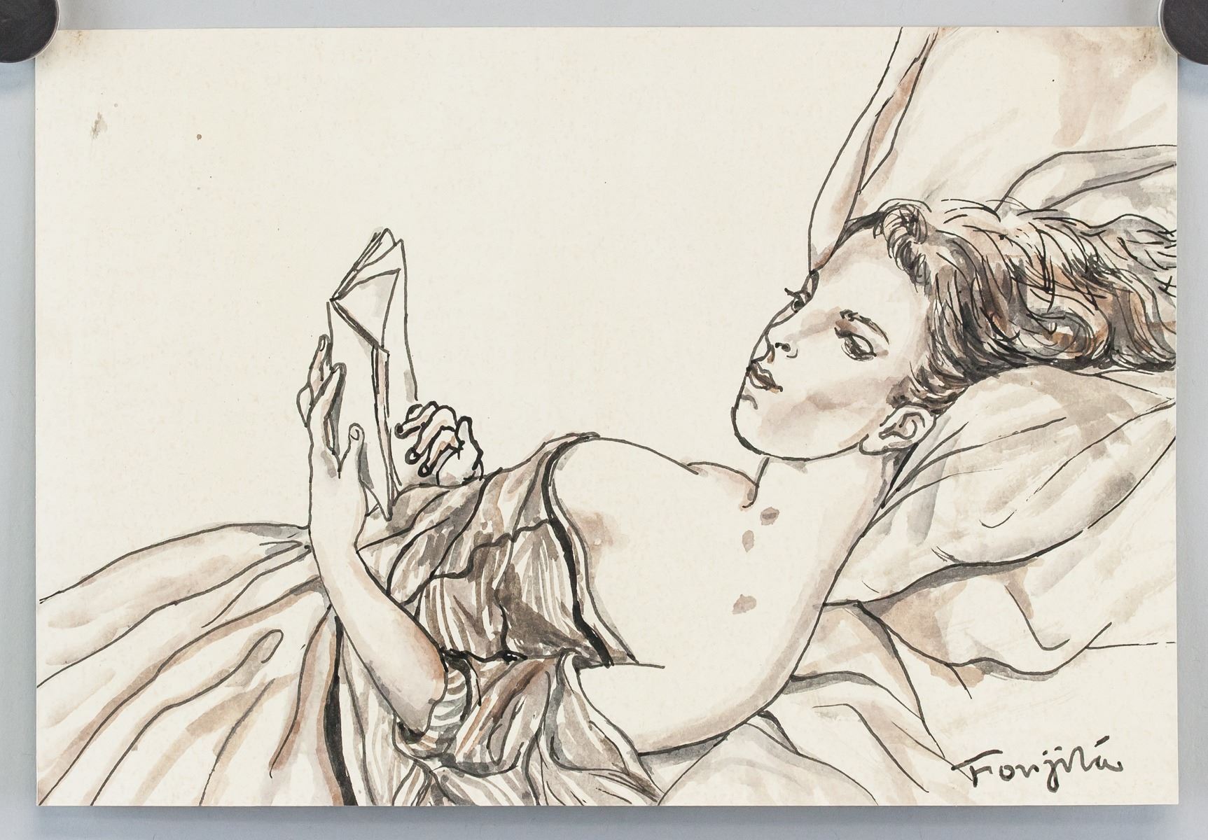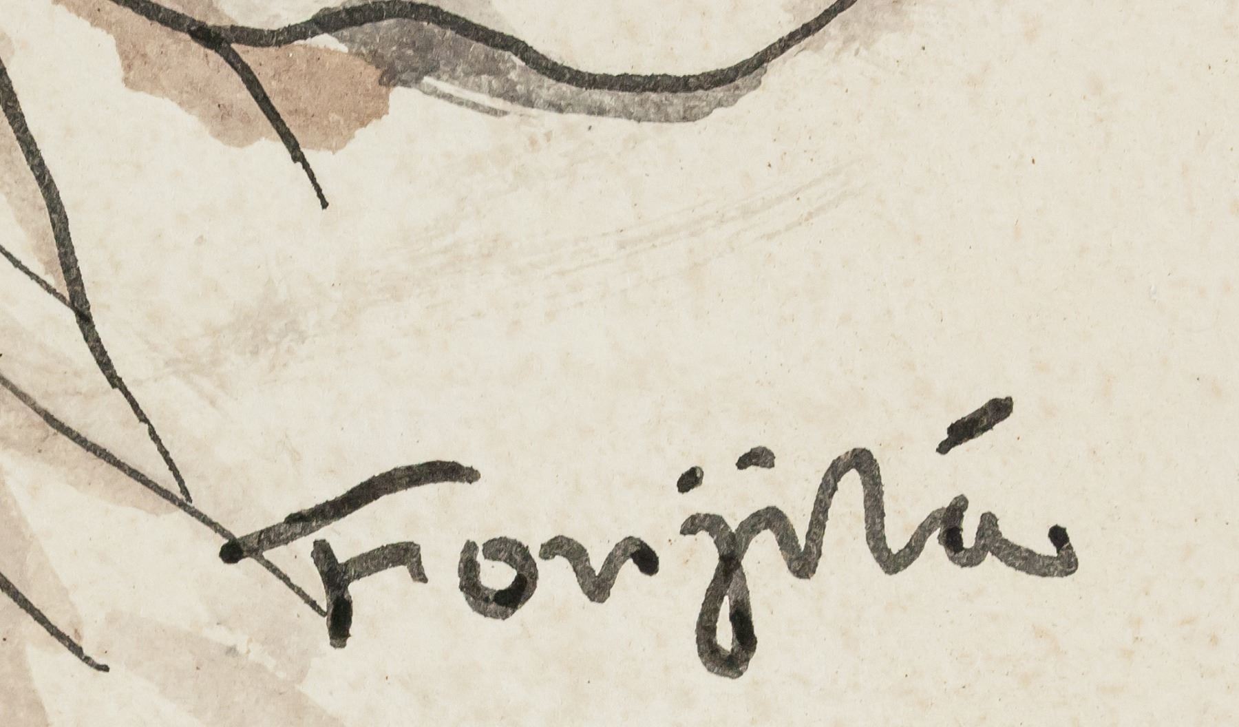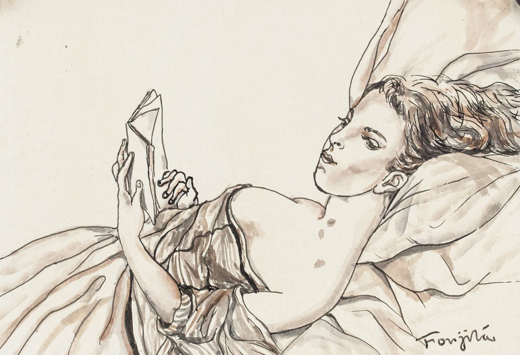 Watercolor and ink on paper. Featuring sketch of a woman laying back and reading a book. Signed "Foujita" in the bottom right corner. "DURET" stamped on verso. "TF12" inscribed on verso. Attributed to Tsuguharu Foujita (1886-1968, Japanese-French). 19.5 x 28 cm (7.75 x 11.25 in). Provenance: This lot carries limited provenance from a Southern Ontario estate.