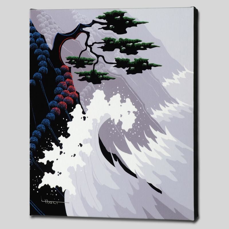 Larissa Holt, a student of distinguished artist Eyvind Earle(1916-2000), uses bold colors and breathtaking scenery to create images of Nature in her own unique style. "Tsunami" is a limited edition giclee on stretched canvas by Holt, numbered and bearing Holt's authorized signature. This piece comes gallery wrapped with a black border, and is ready to hang. Includes Certificate of Authenticity! Measures approx. 10" x 12.5" x 1.5" (image).