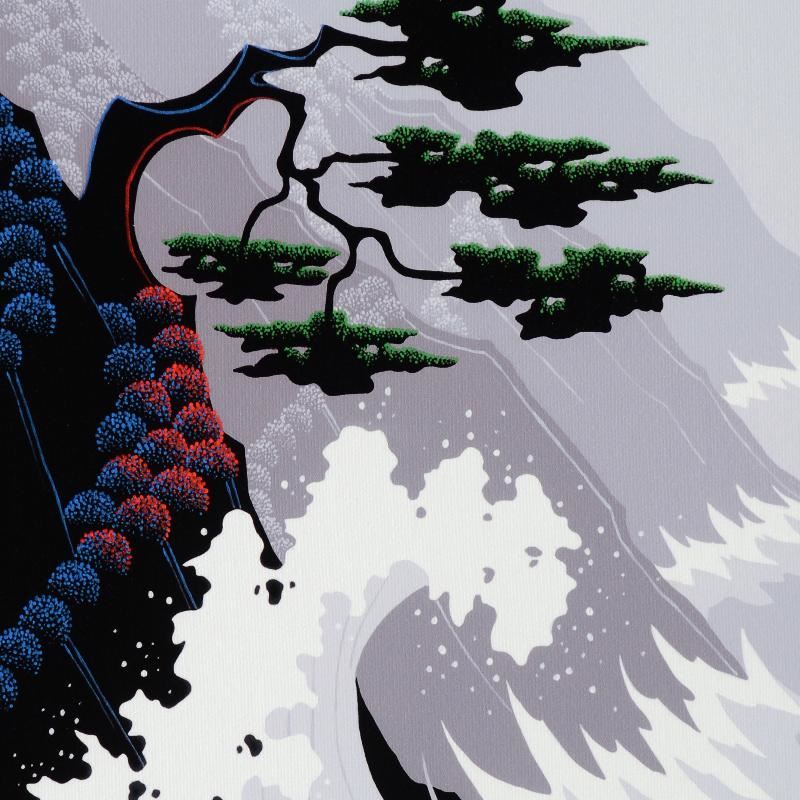 Larissa Holt, a student of distinguished artist Eyvind Earle(1916-2000), uses bold colors and breathtaking scenery to create images of Nature in her own unique style. "Tsunami" is a limited edition giclee on stretched canvas by Holt, numbered and bearing Holt's authorized signature. This piece comes gallery wrapped. Includes Certificate of Authenticity! Measures approx. 10" x 12.5" x 1.5" (image).