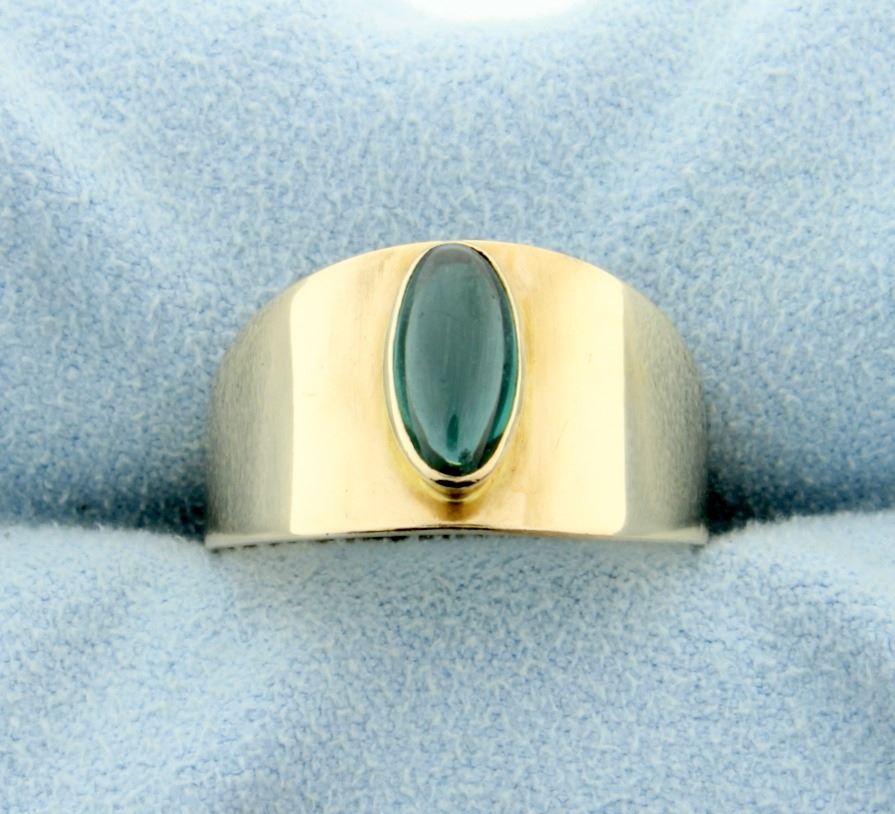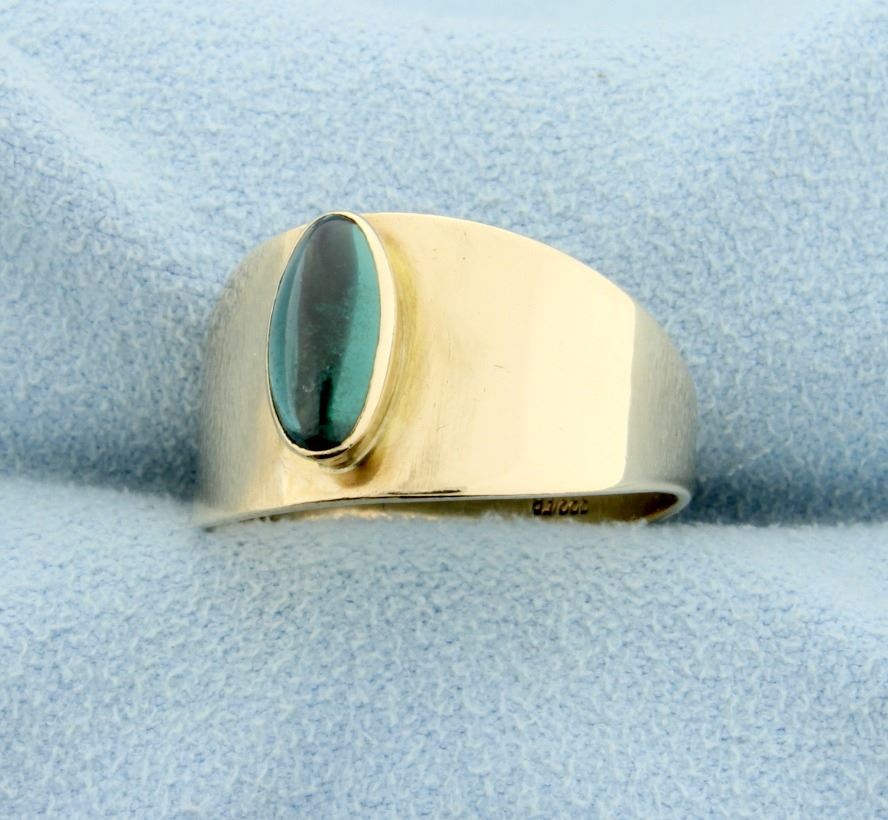 8ct yellow gold, it contains a 10mm oval cabochon Tsvorite Garnet with great clarity and color. Size 8 3.6g