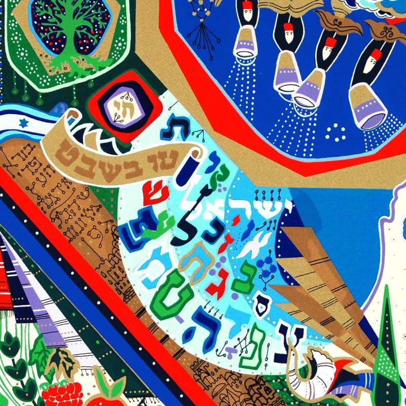 "Tu B'Shvat" is a limited edition serigraph on by Raphael AbecassisThe piece is numbered, hand signed by the artist, and includes a certificate of authenticity. Measures approx. 15.5" x 23.5" (with border), 13.5" x 19.5" (image).