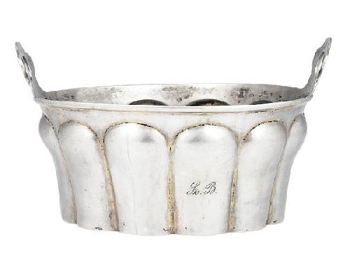 Silver, 302 g, with the rest of gilt inside. Round, fluted body divided into twelve parts, with handles at the rim. On the side there are the engraved initials of the owner: cursive Sz. B. Marked: Pest, 1863, Laky Károly. Brestyánszky: 171, 266. Size: 11 cm Diameter: 18 cm