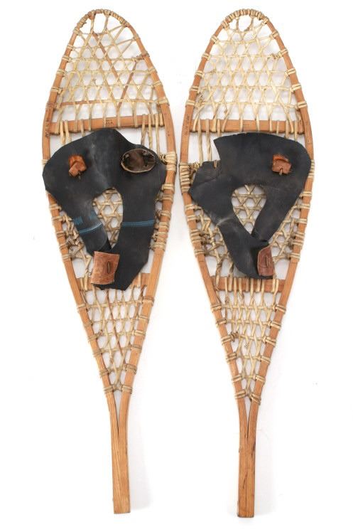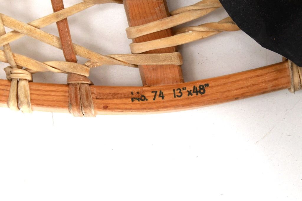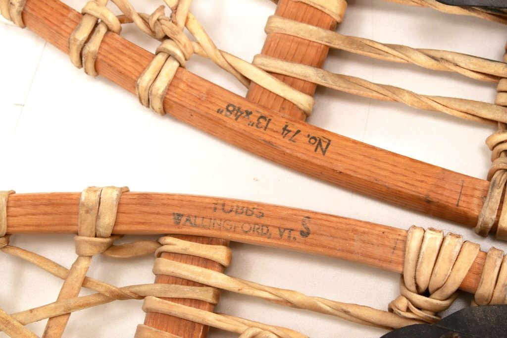 Featured in this lot is this Tubbs Wallingford, Vermont wooden and rawhide snowshoes circa early 1900's. The pair of snowshoes features a wonderfully and professionally crafted wooden and rawhide construction that shows rubber bindings and is marked as follows: Tubbs Wallingford, VT - No. 74 13" x 48" - Made in U.S.A. The condition of this pair of snowshoes is well preserved with a addition binding constructed from rubber but otherwise shows a well preserved condition. The measurements of this pair of snow shoes is 48 3/4" x 13". The collective weight of this pair of snow shoes is 5lb 8oz.