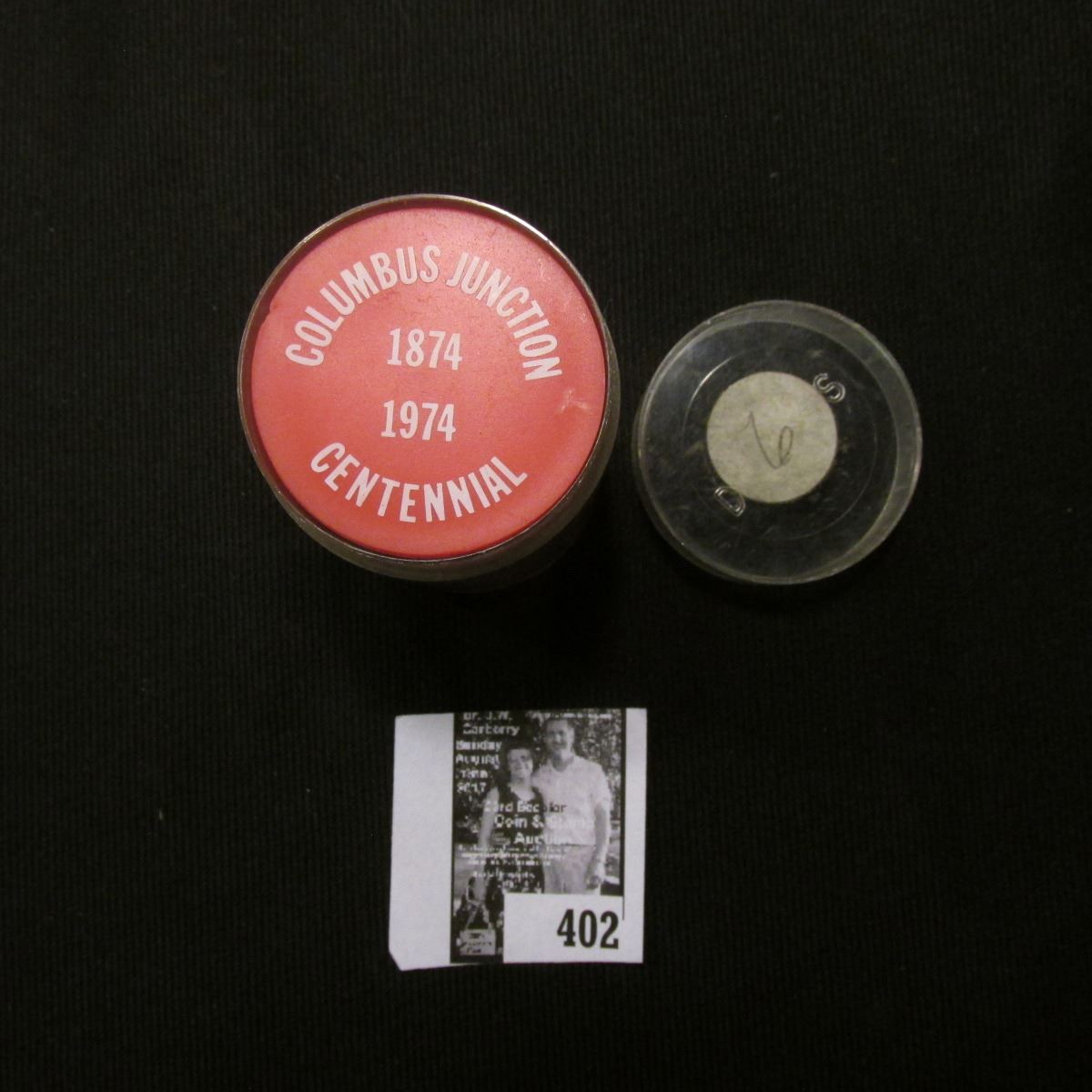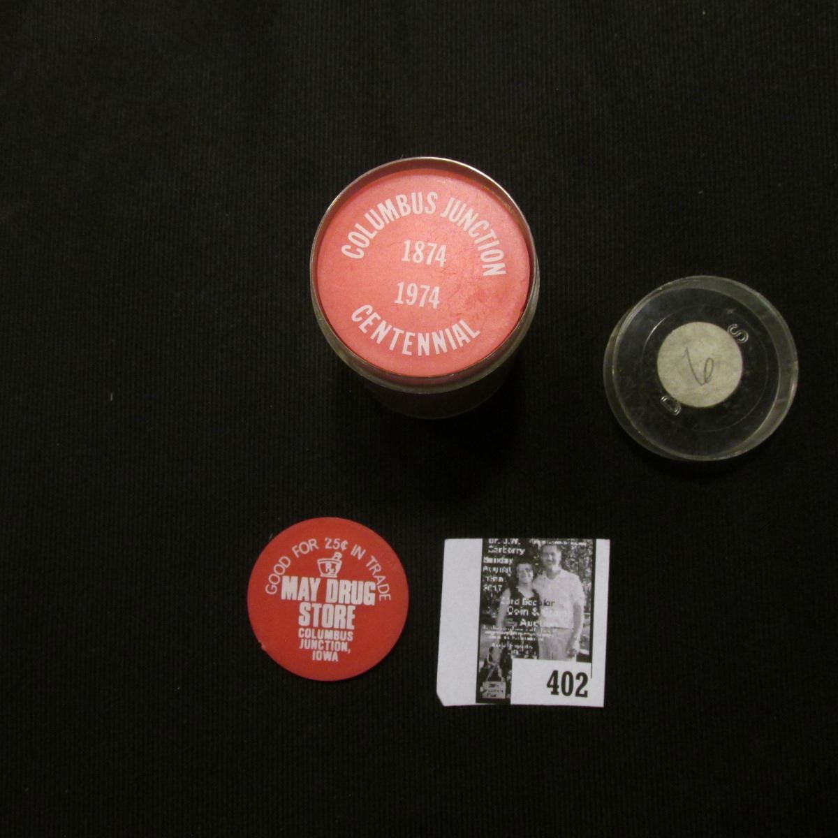 Tube of (26) "Good For 25c In Trade/May Drug/Store/Columbus/Junction,/Iowa", "Columbus Junction/1874/1974/Centennial".