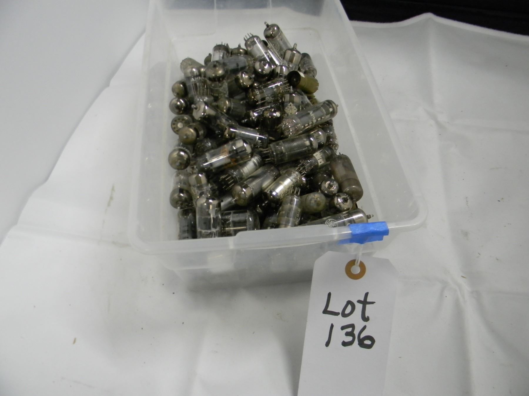 Tub of many miniature British and European pulls; includes Telefunken, Siemens, Amperex, Bugle Boy, Mullard, etc.