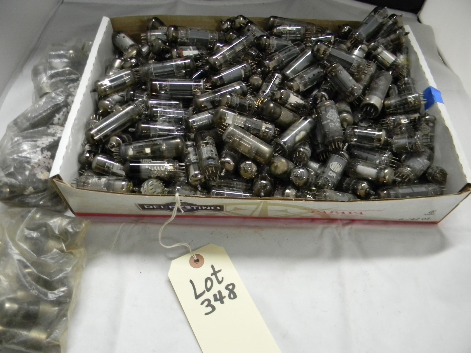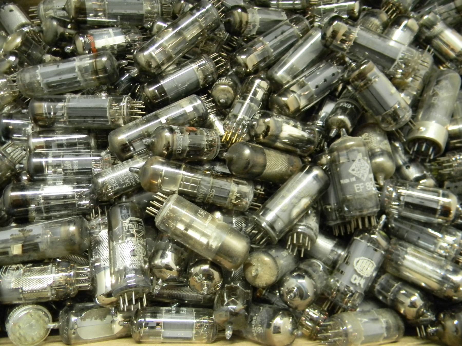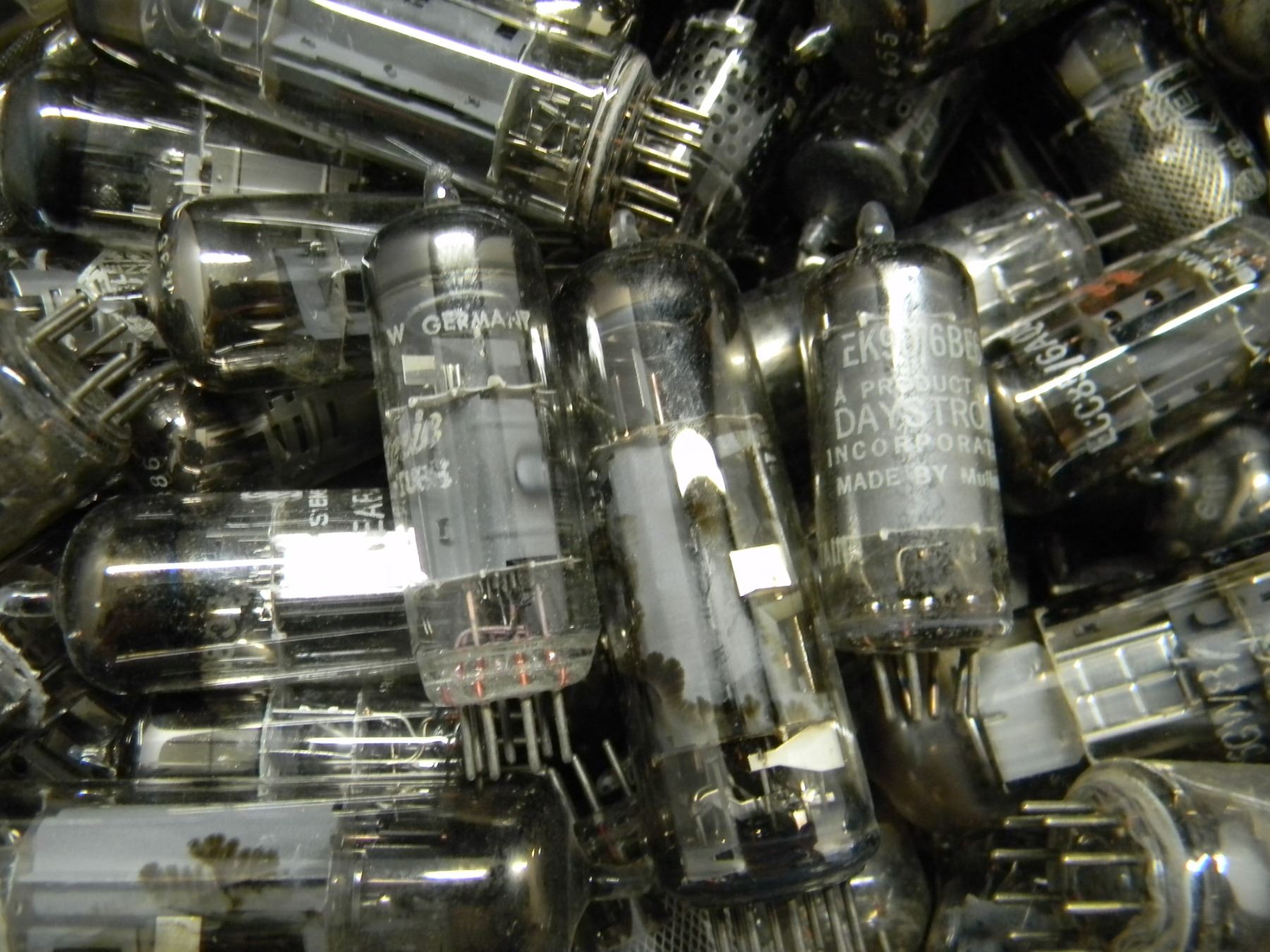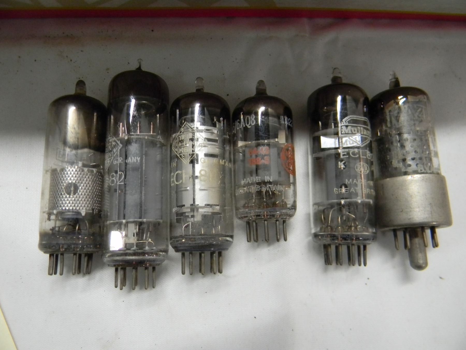 Flat of European and British made miniature tubes; includes Mullard, Telefunken, Mazda, Siemen, Valvo, Bugle Boy, etc.