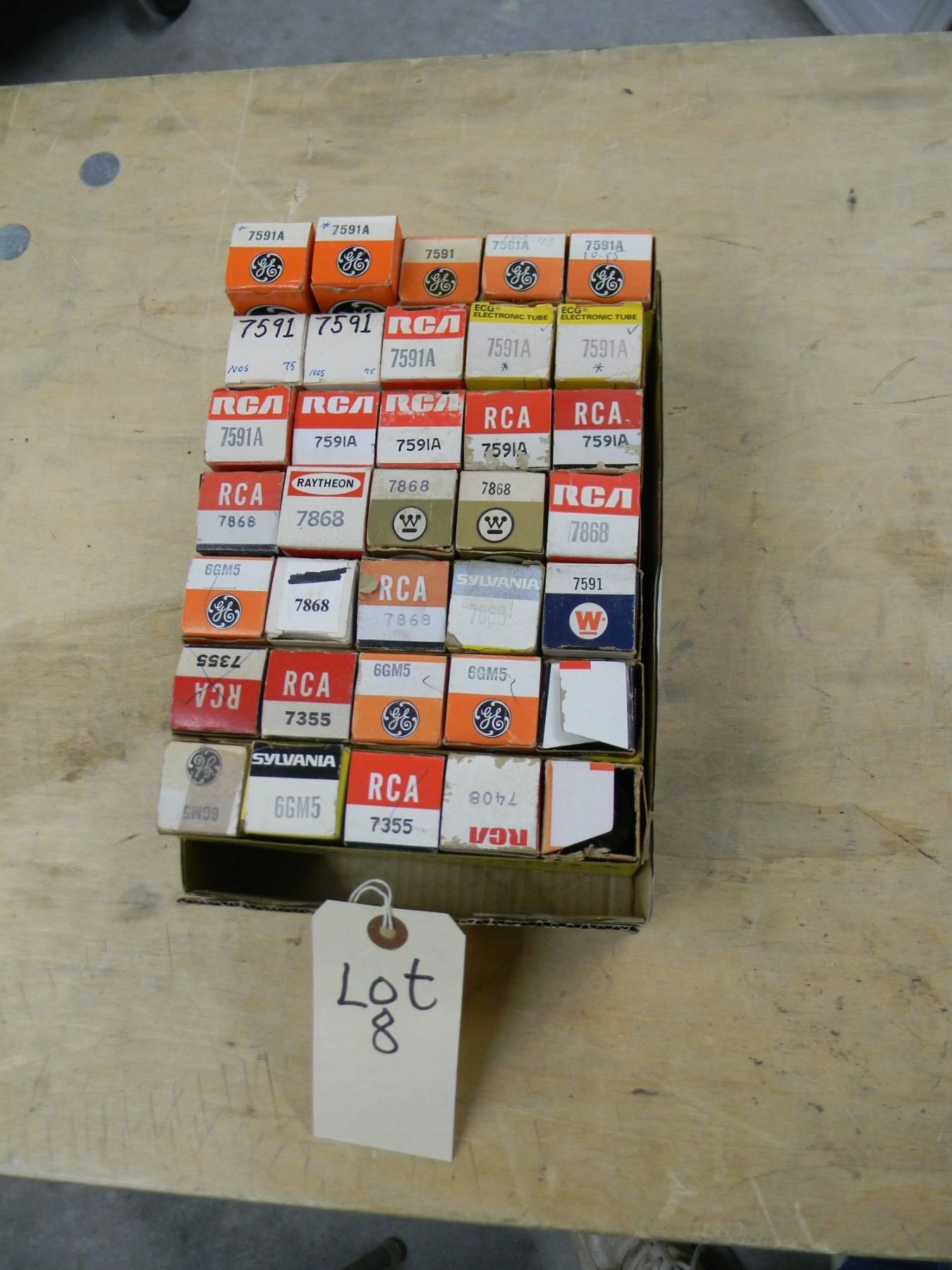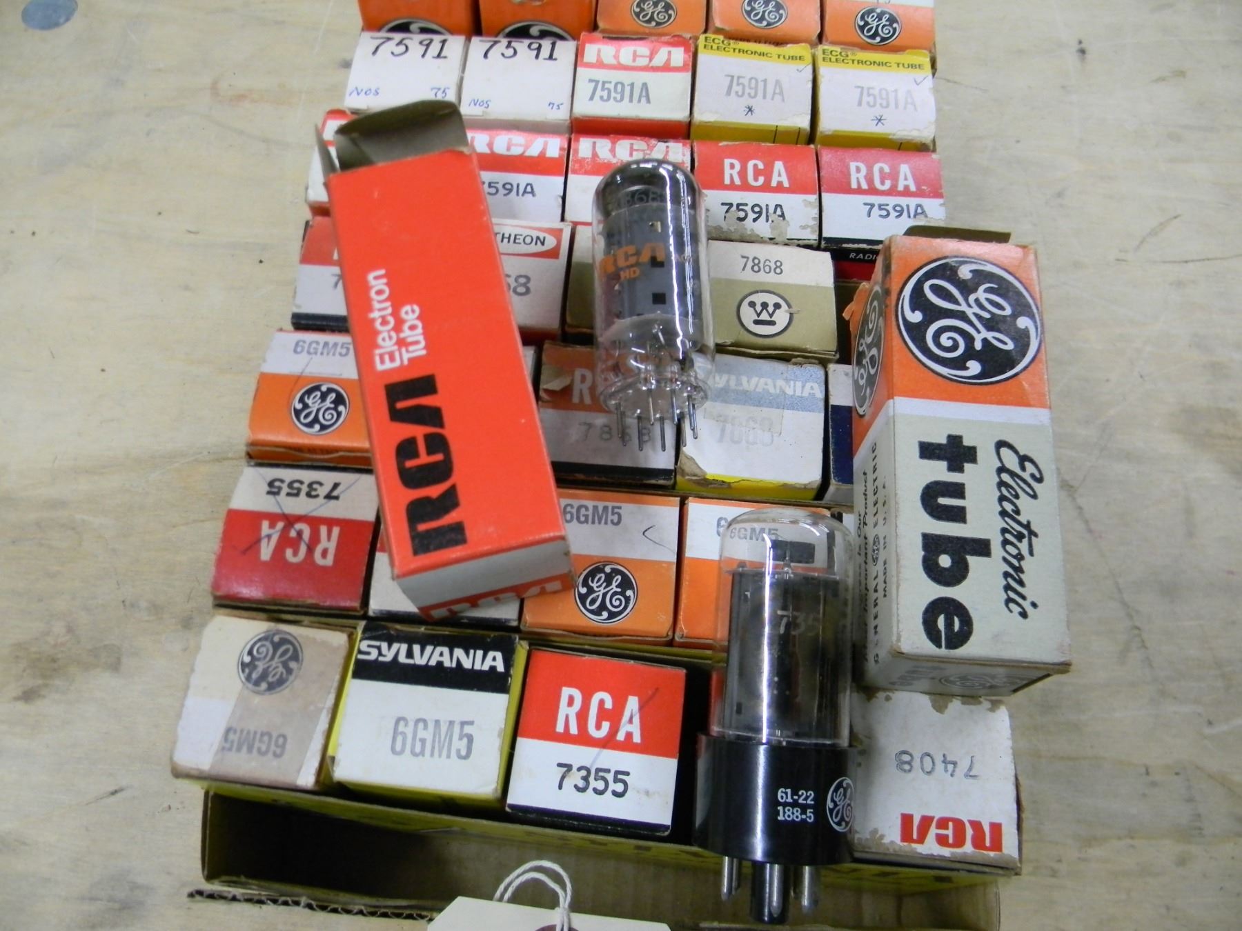Flat of tubes; 35 mostly NOS audio output tubes, including 7591A, 7868, 7355, 7408, and 6GM5