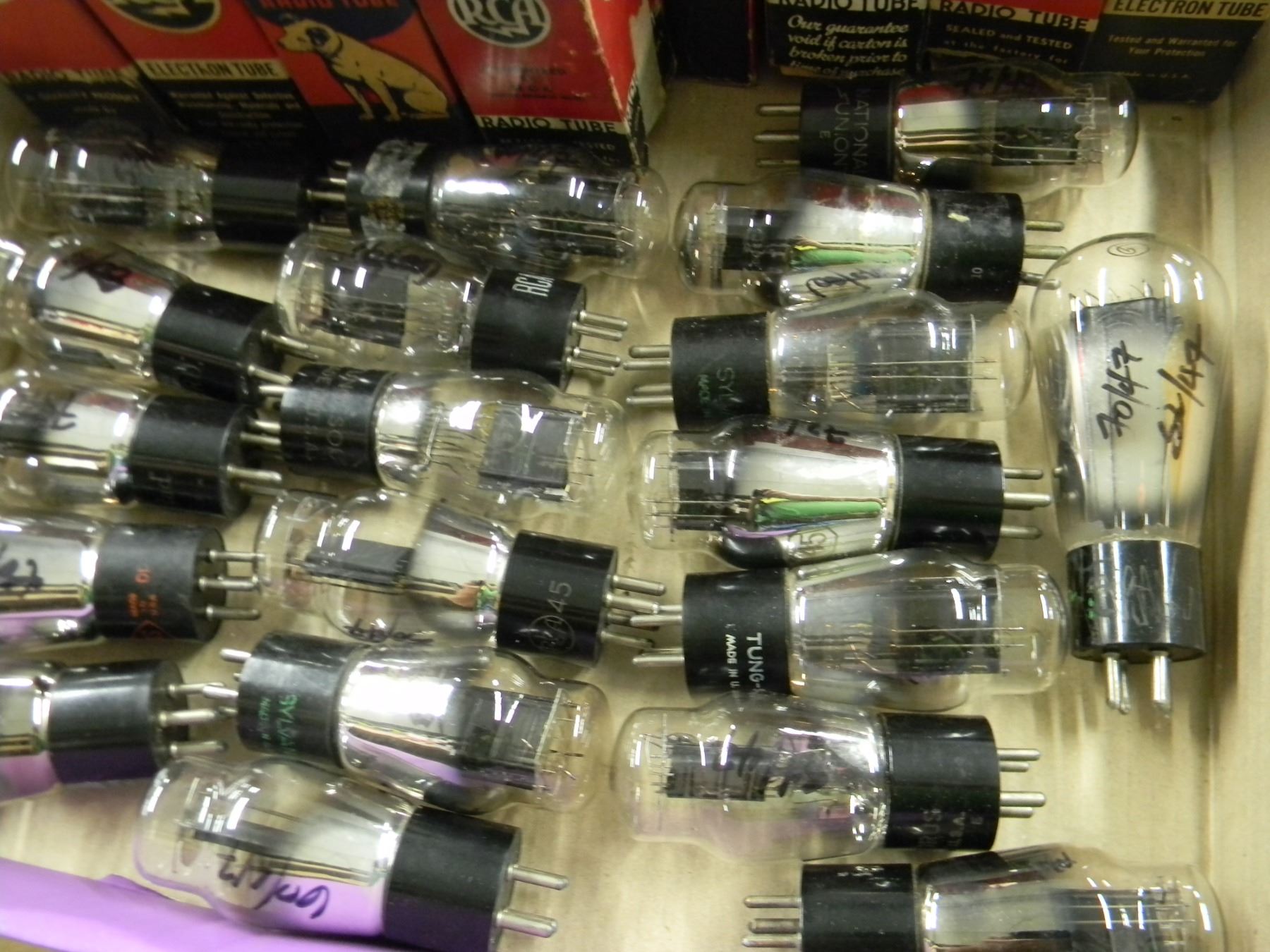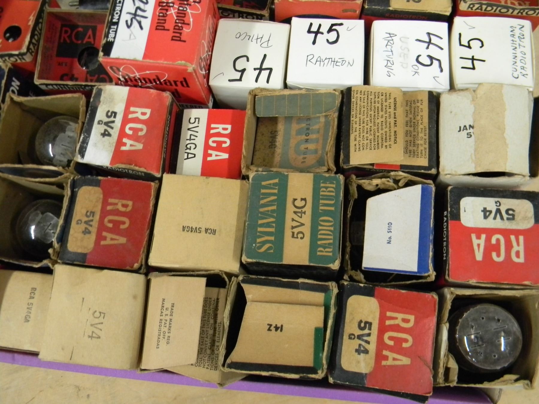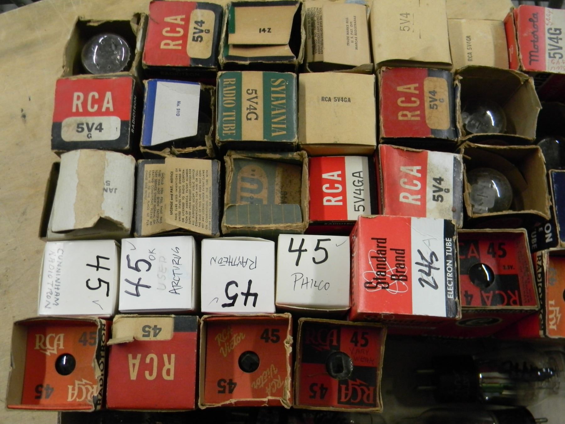 Large flat of tubes; new and good tested used; type 45, 5V4; approximately 55