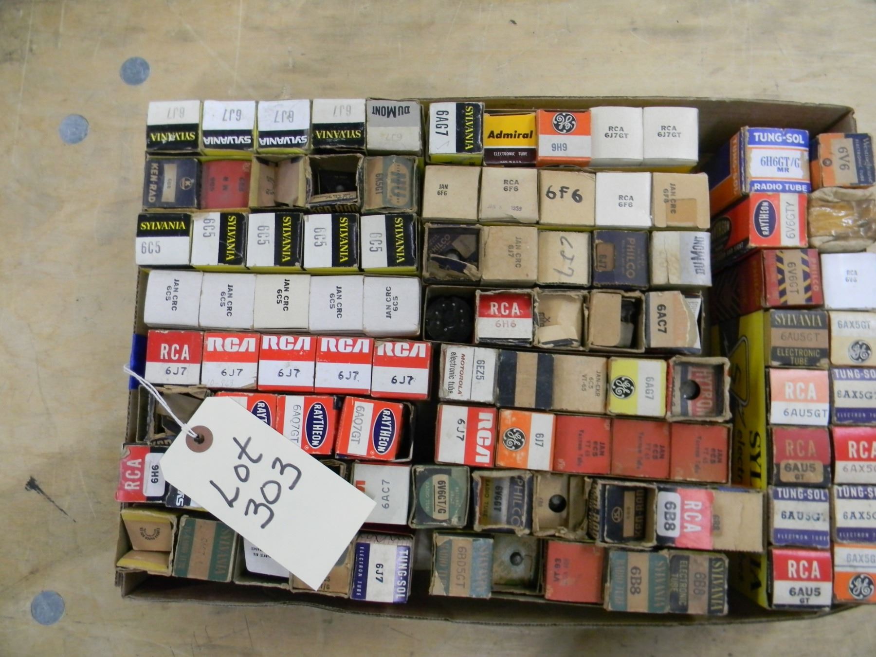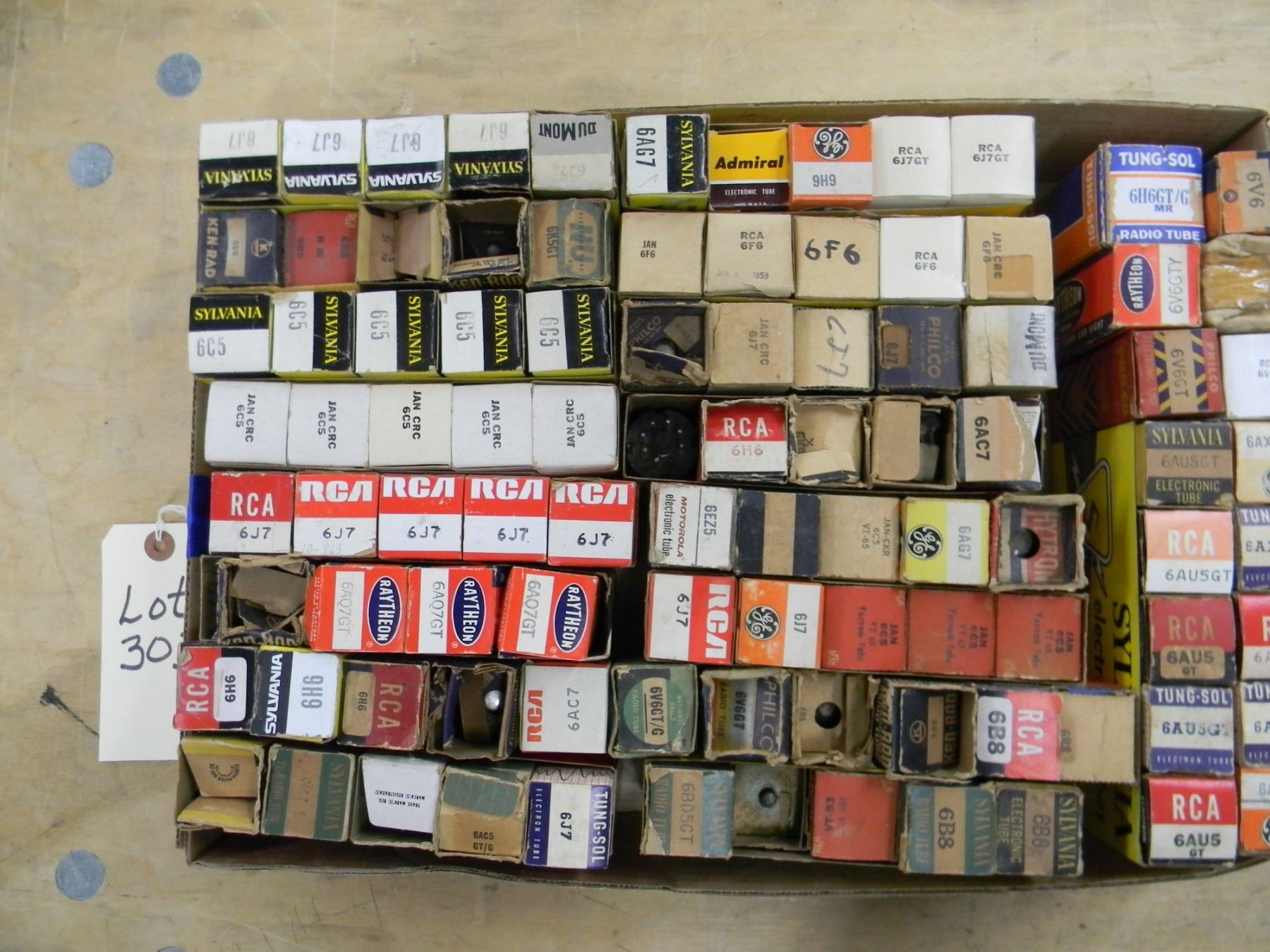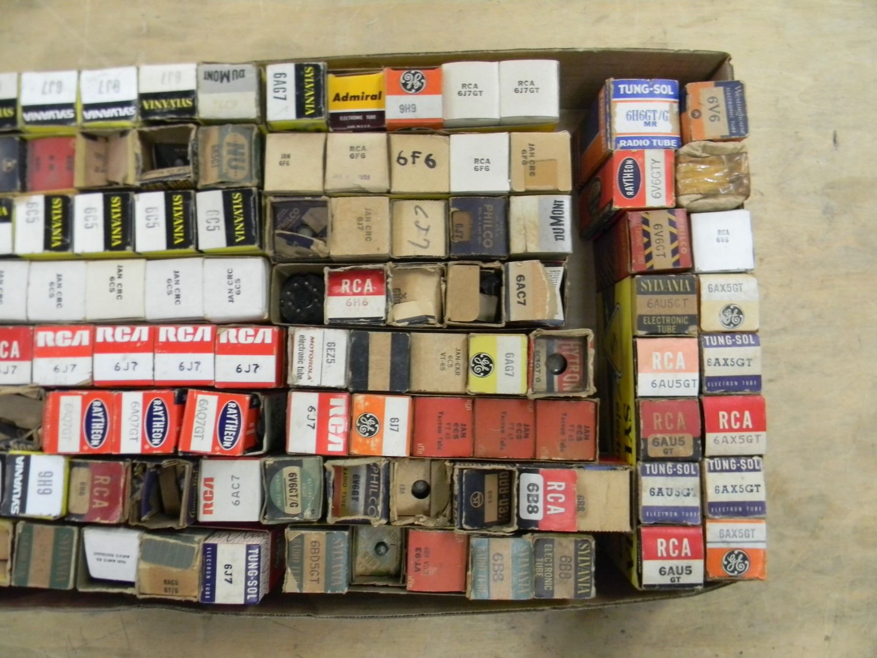 Flat of tubes; mostly NOS; including 6V6, 6F6, 6J7, etc.; approximately 90+