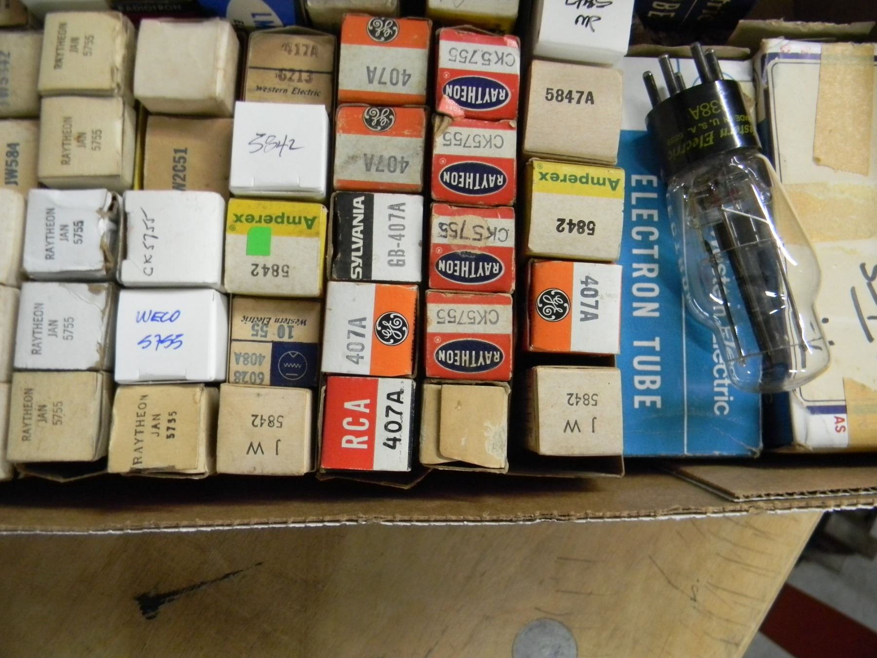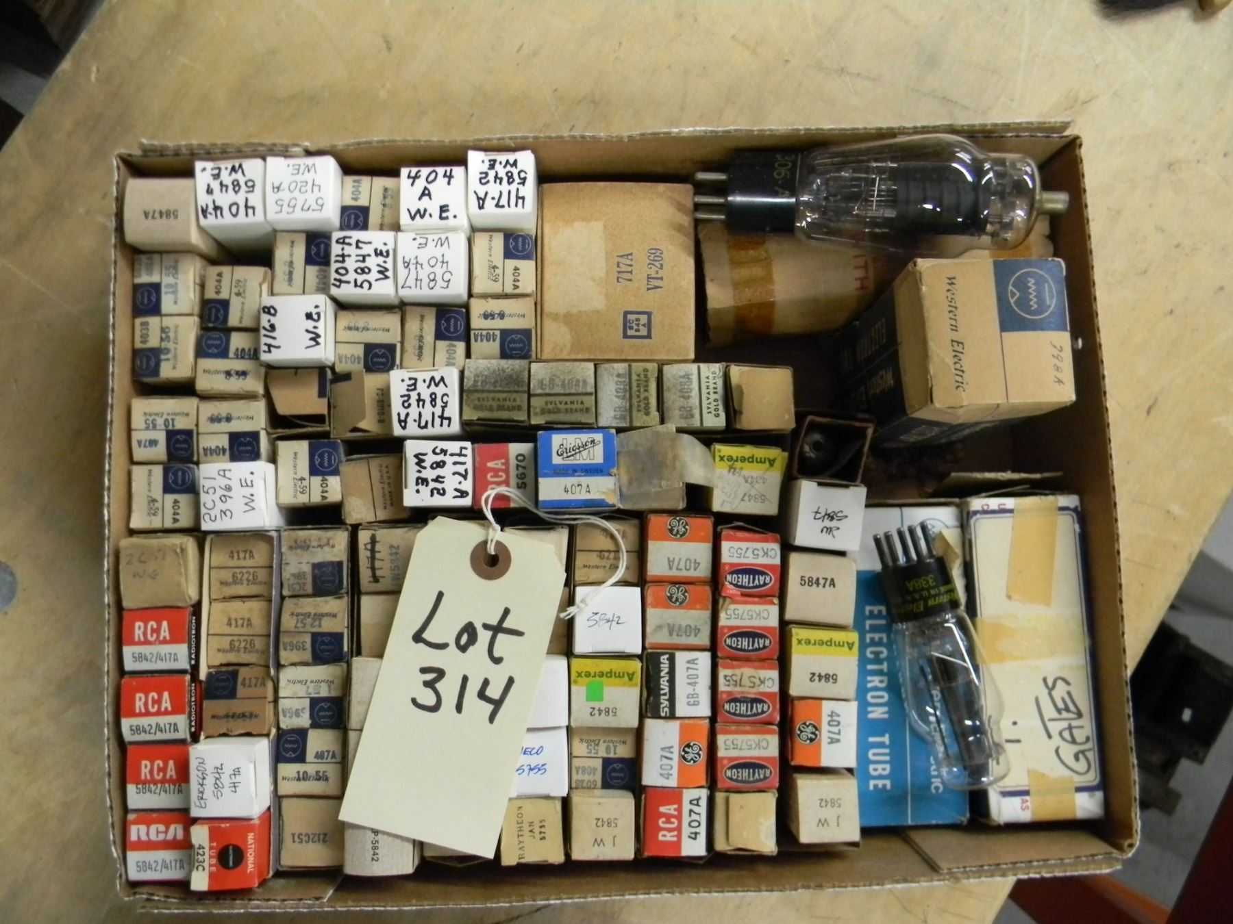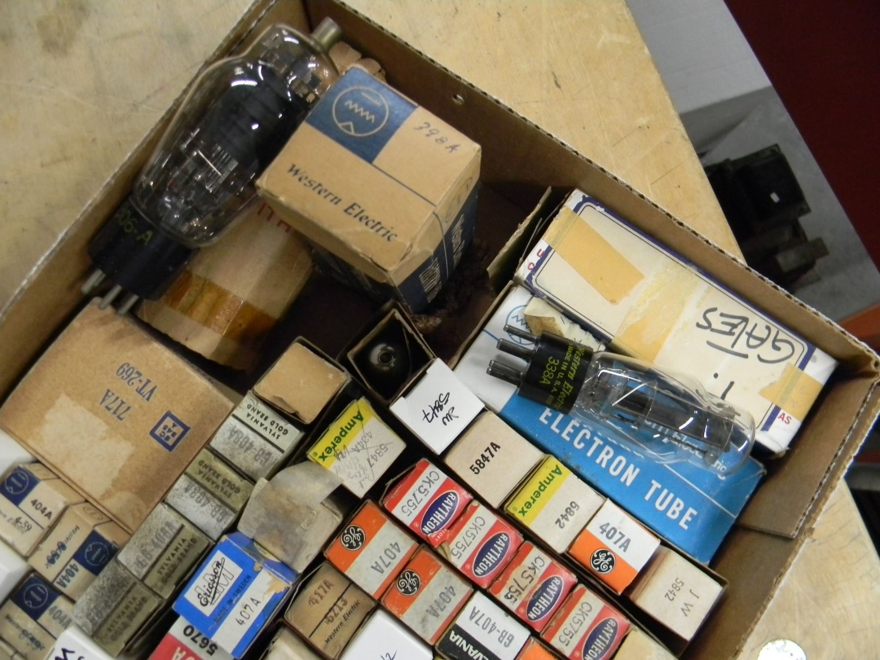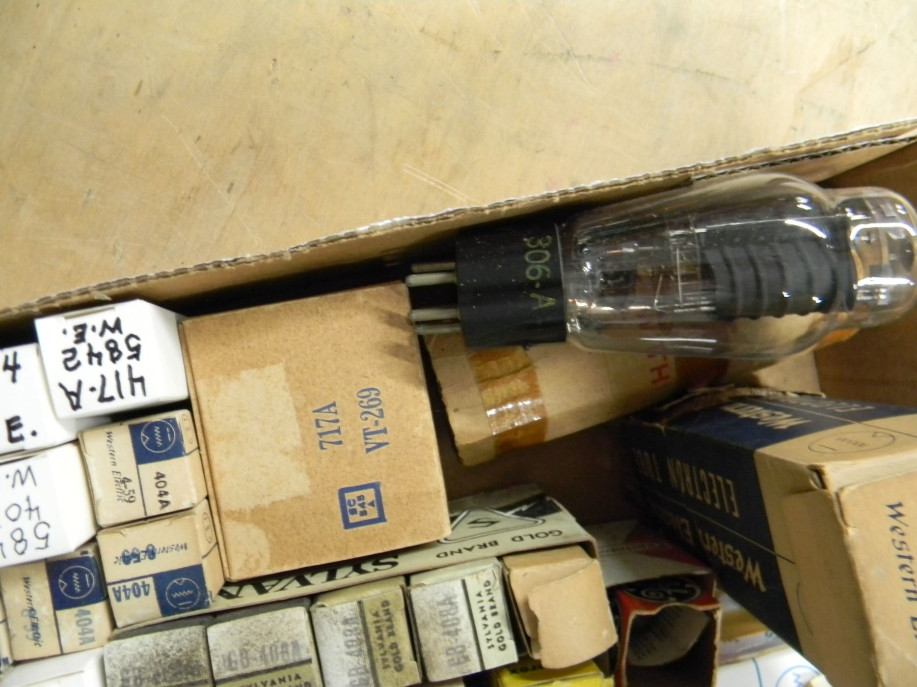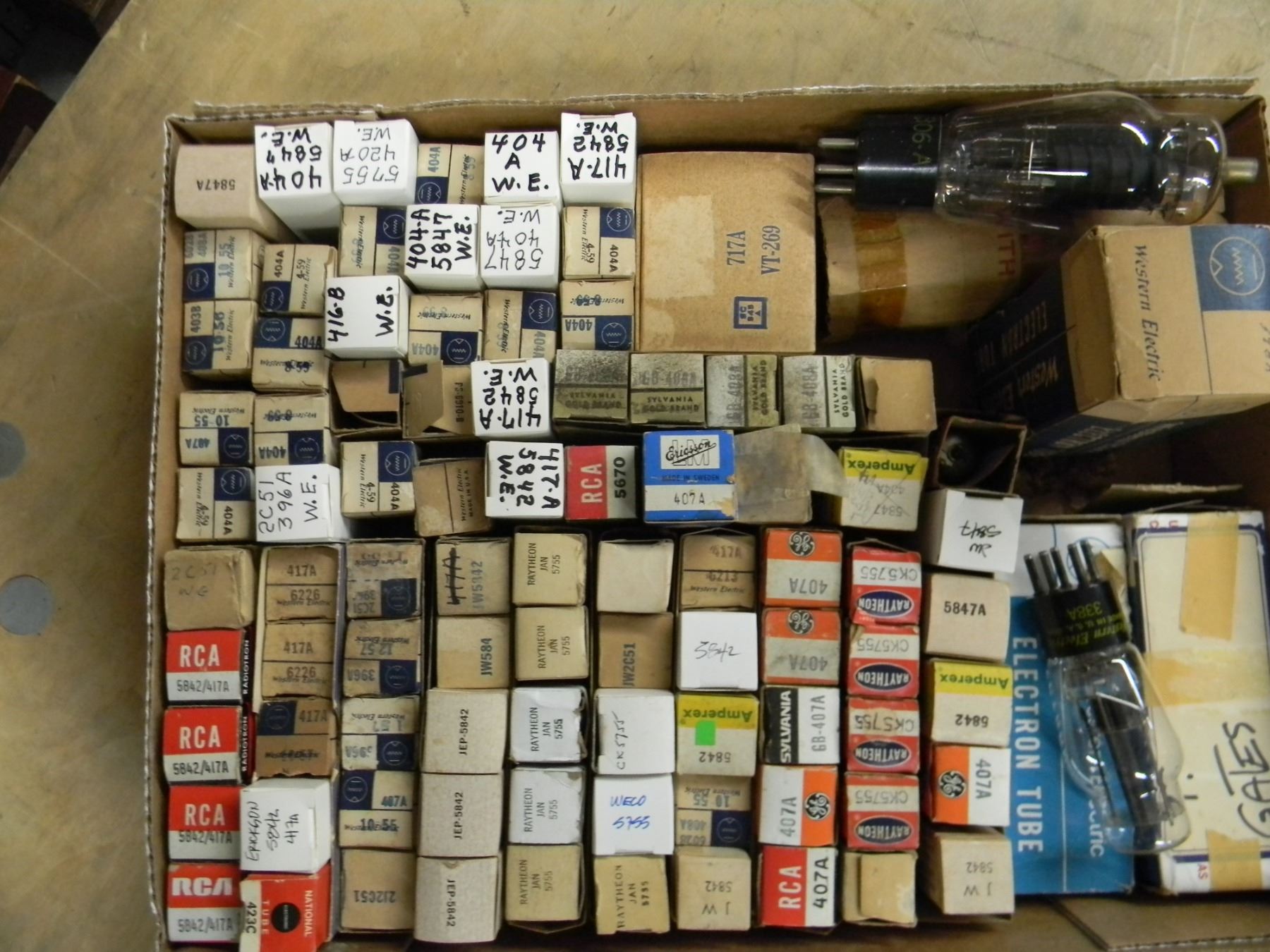 Flat of tubes; mostly NOS and good tested Western Electric; type 417A, 408A, 5755, etc.