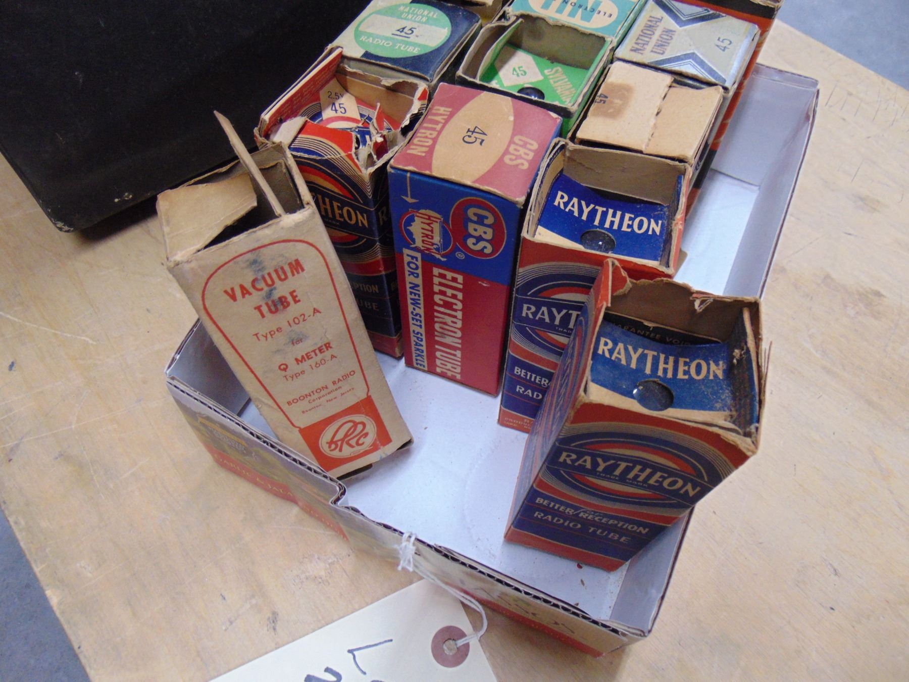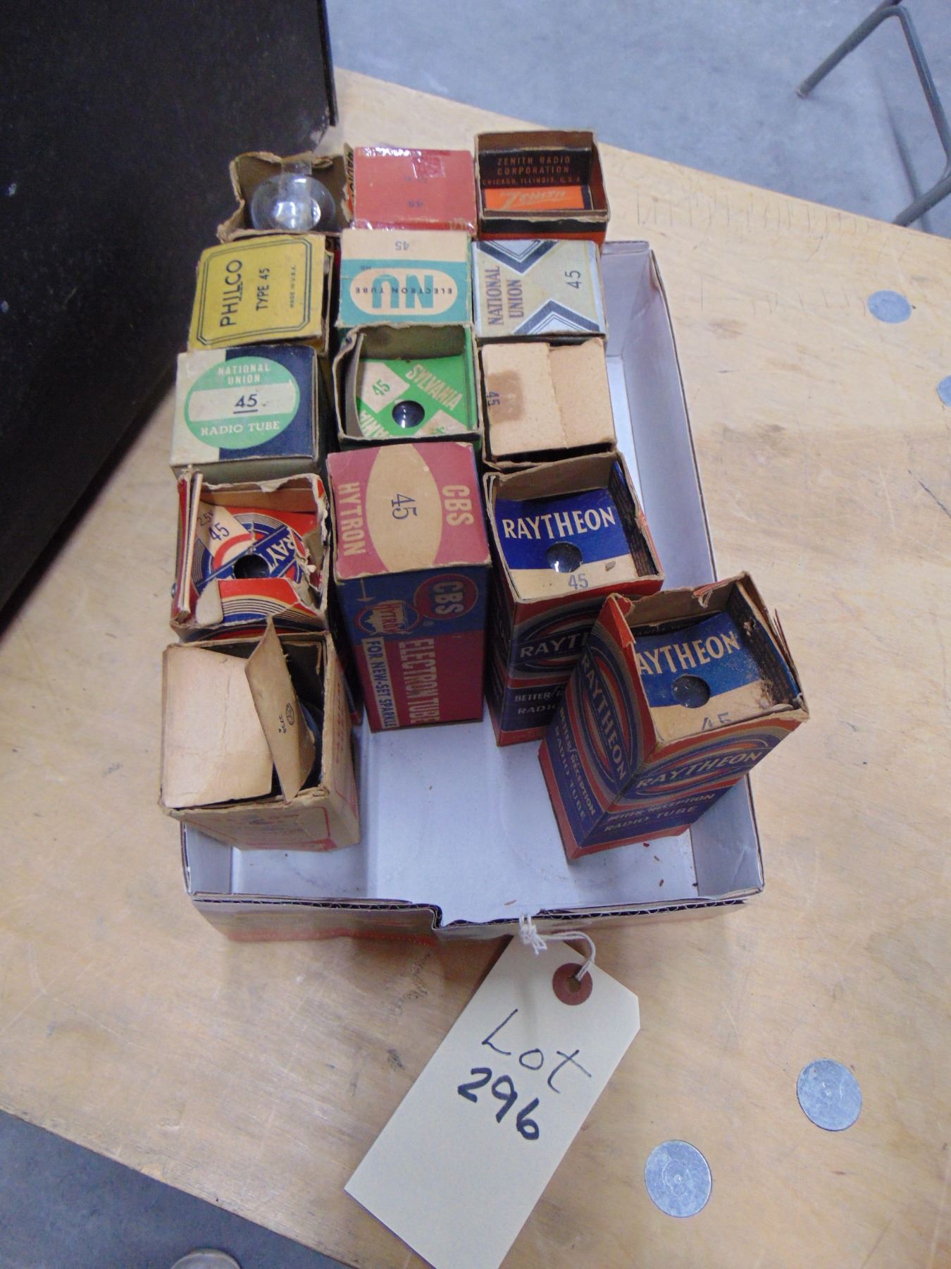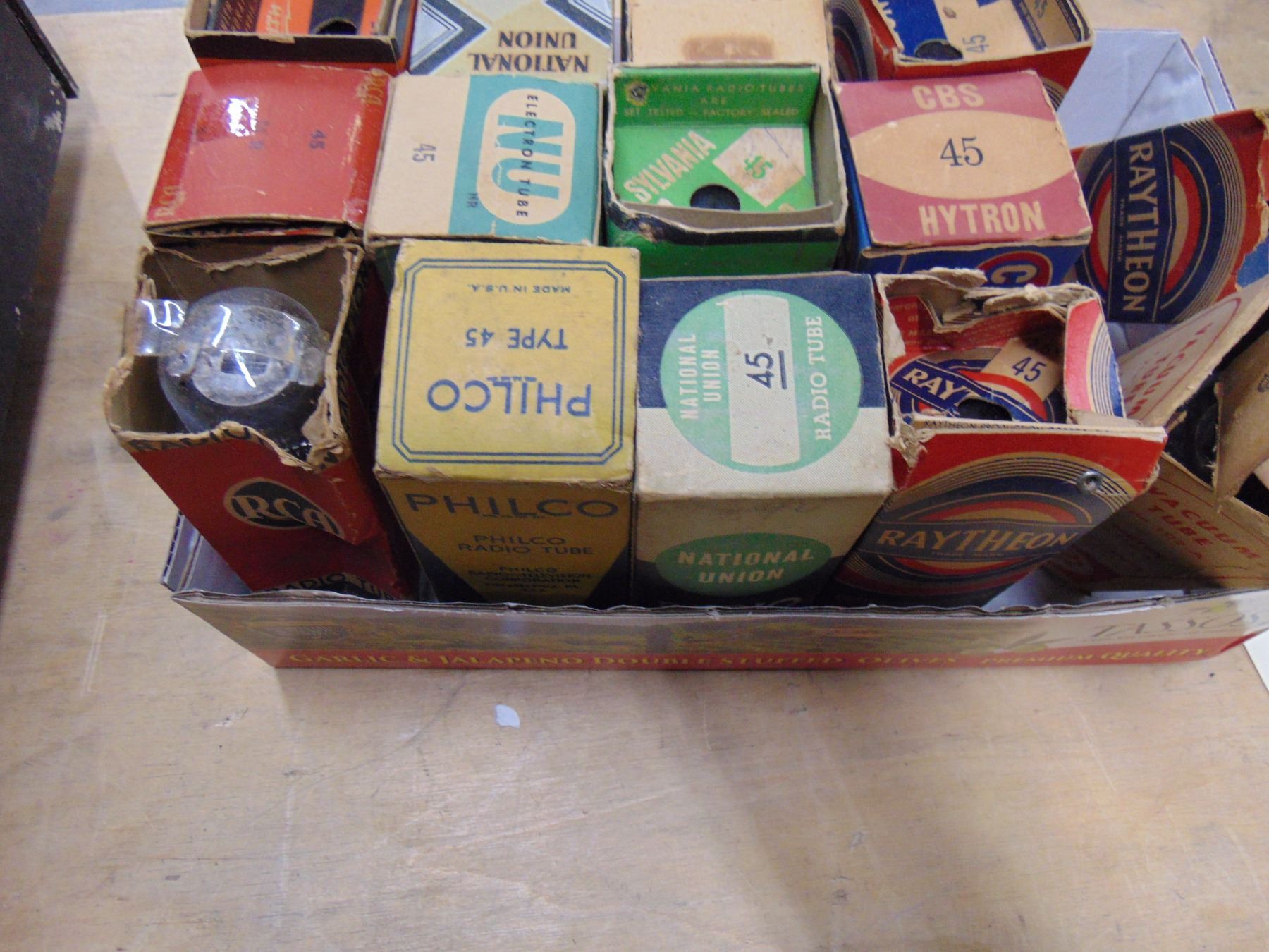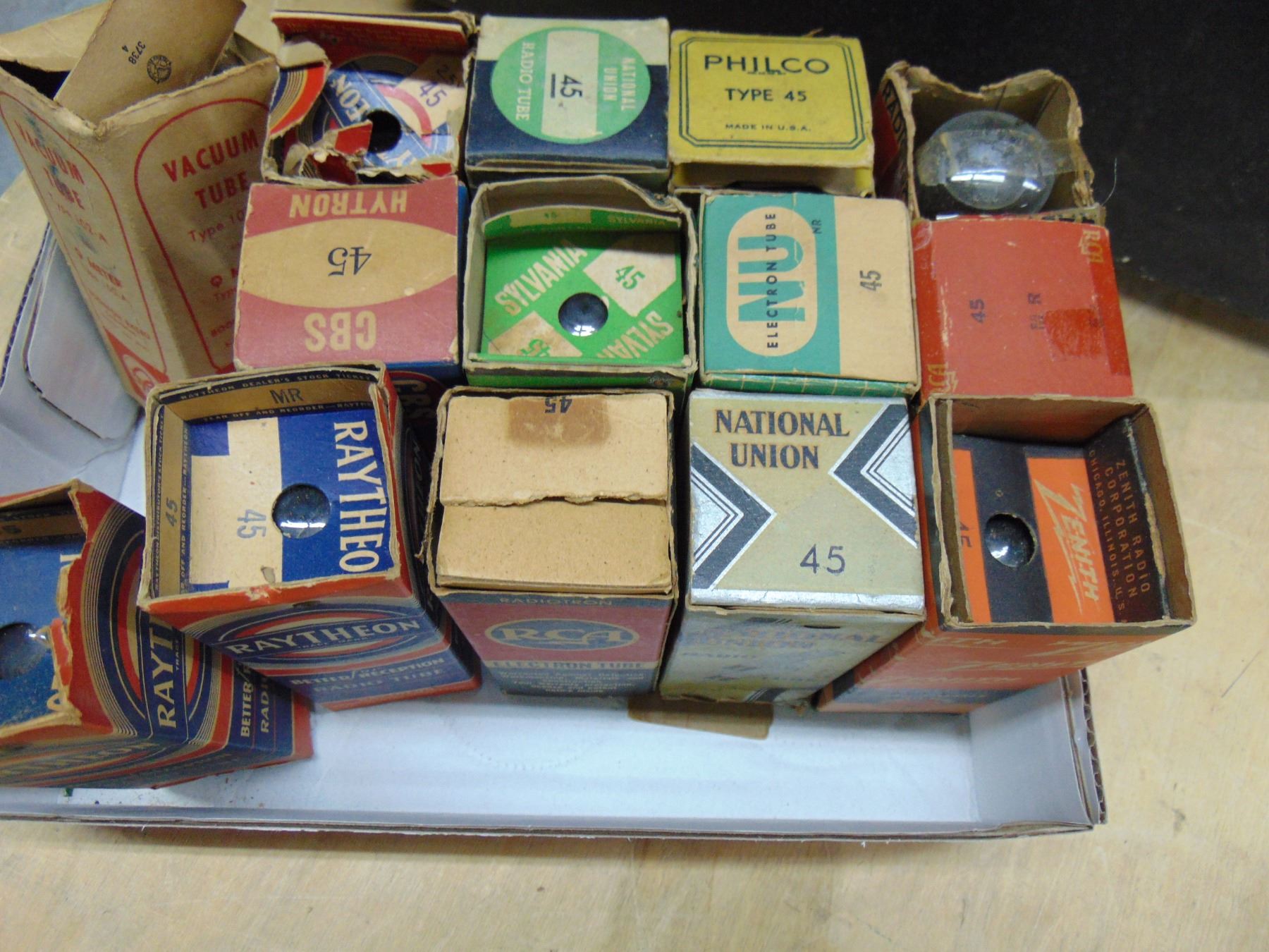 Flat of tubes; mostly NOS type 45 tubes; also NOS type 102-A; approximately 14 tubes