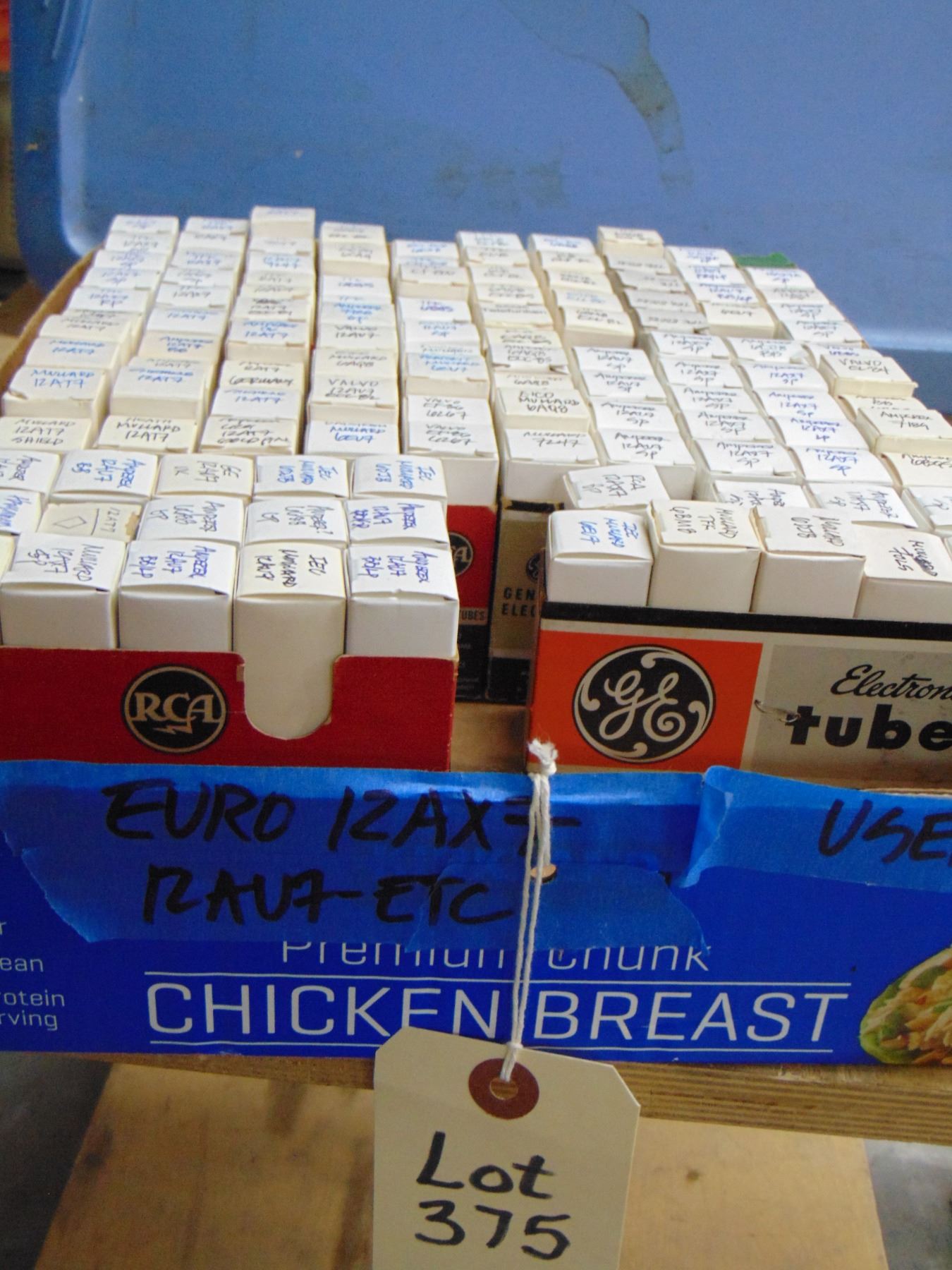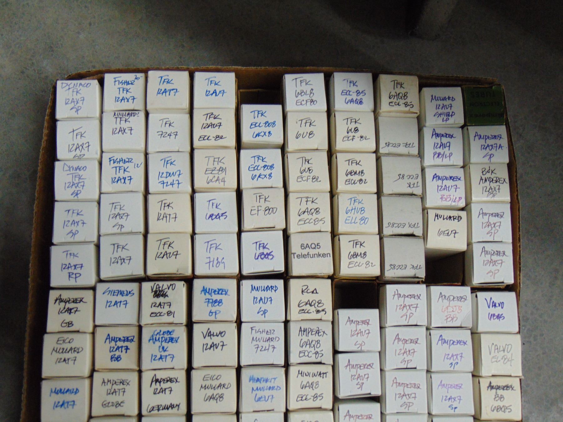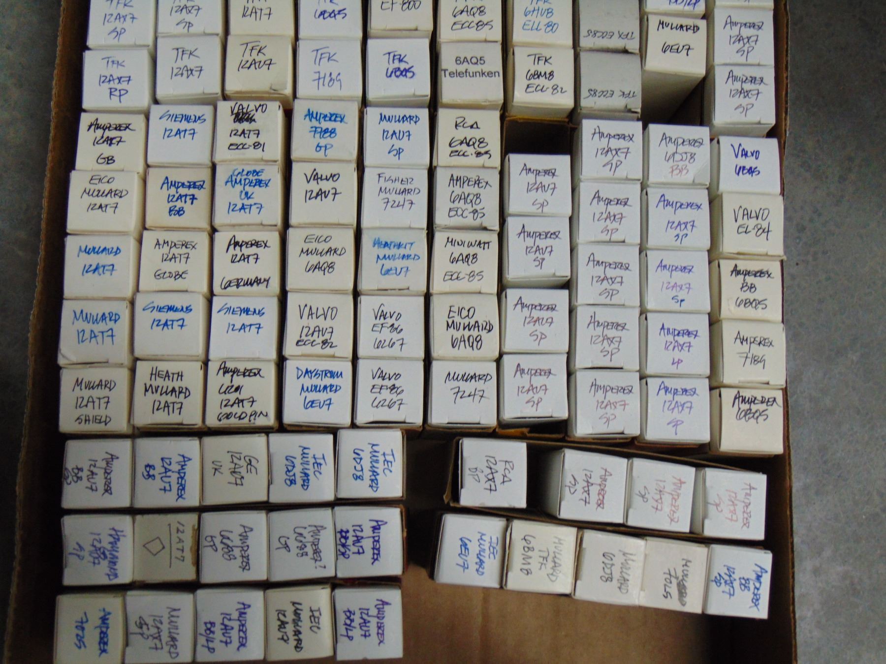 Flat of tubes; mostly good tested audio miniature tubes; includes 12AX7, 6BQ5, 6AQ8, 6DJ8, etc.; mostly European; approximately 120