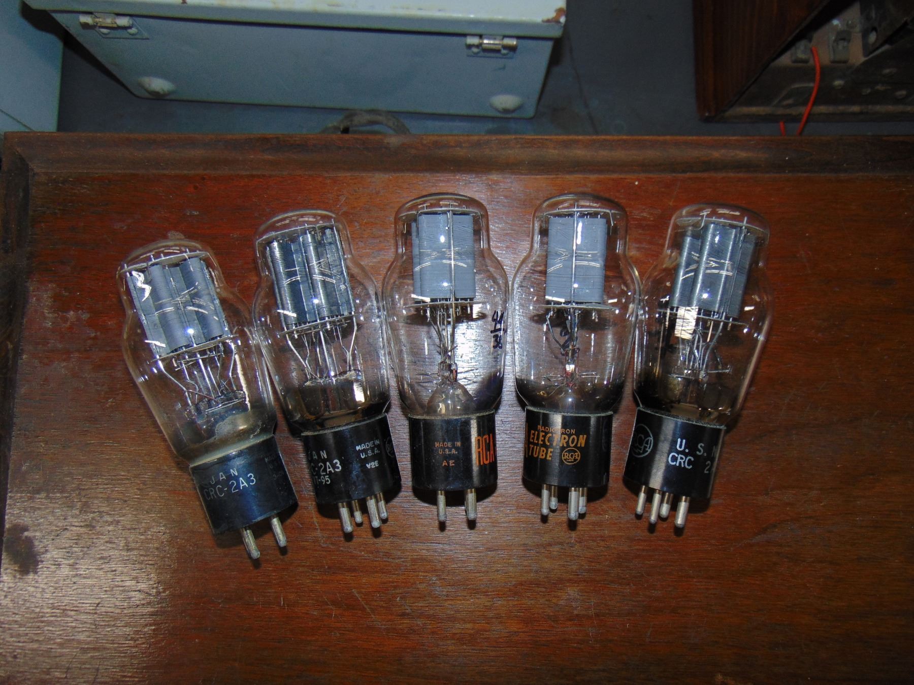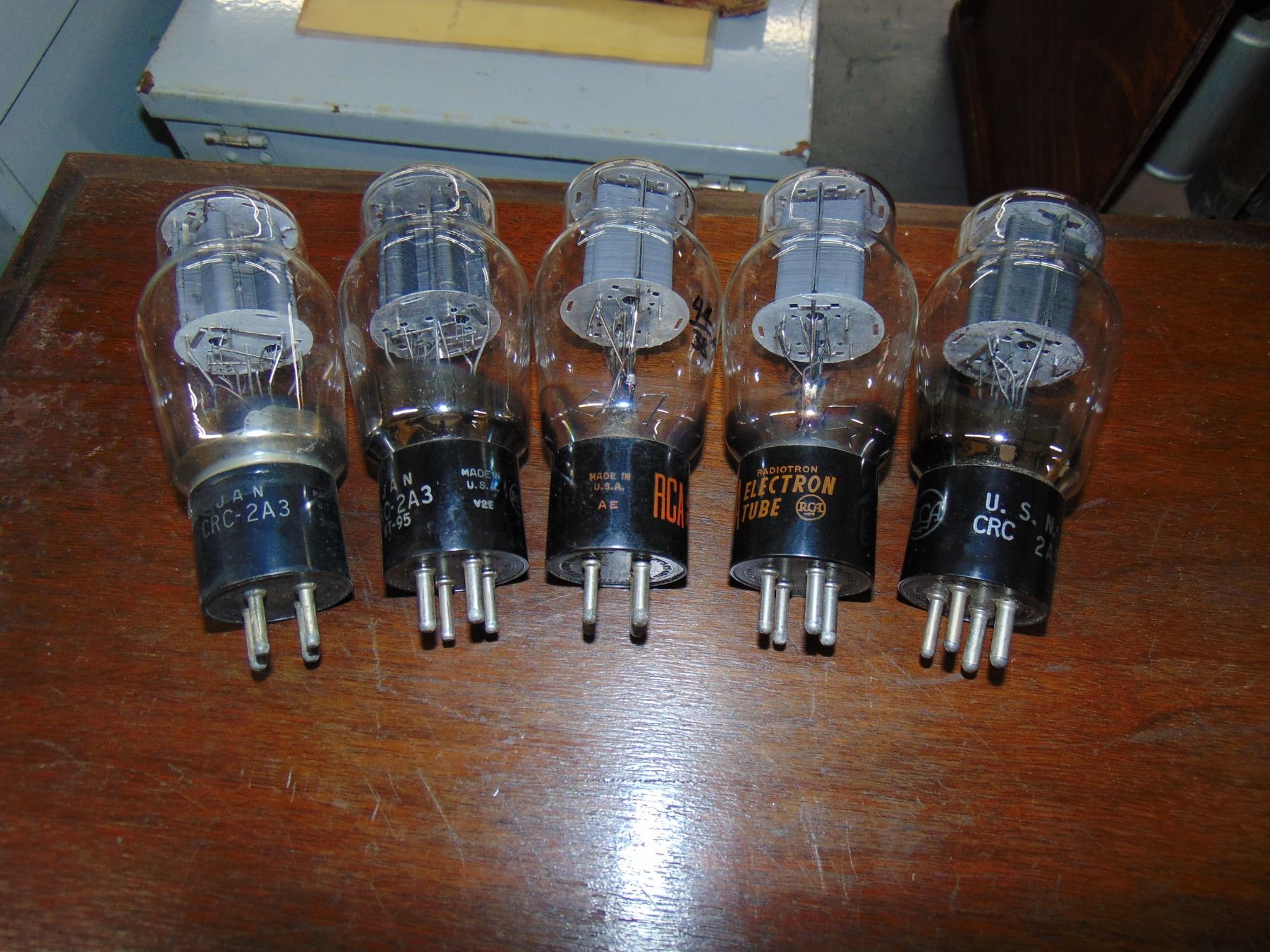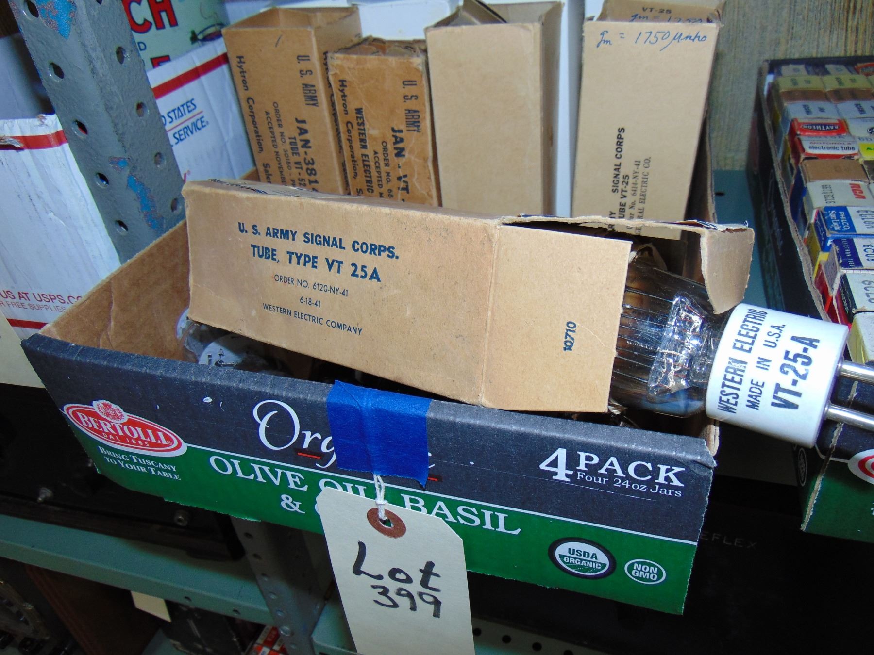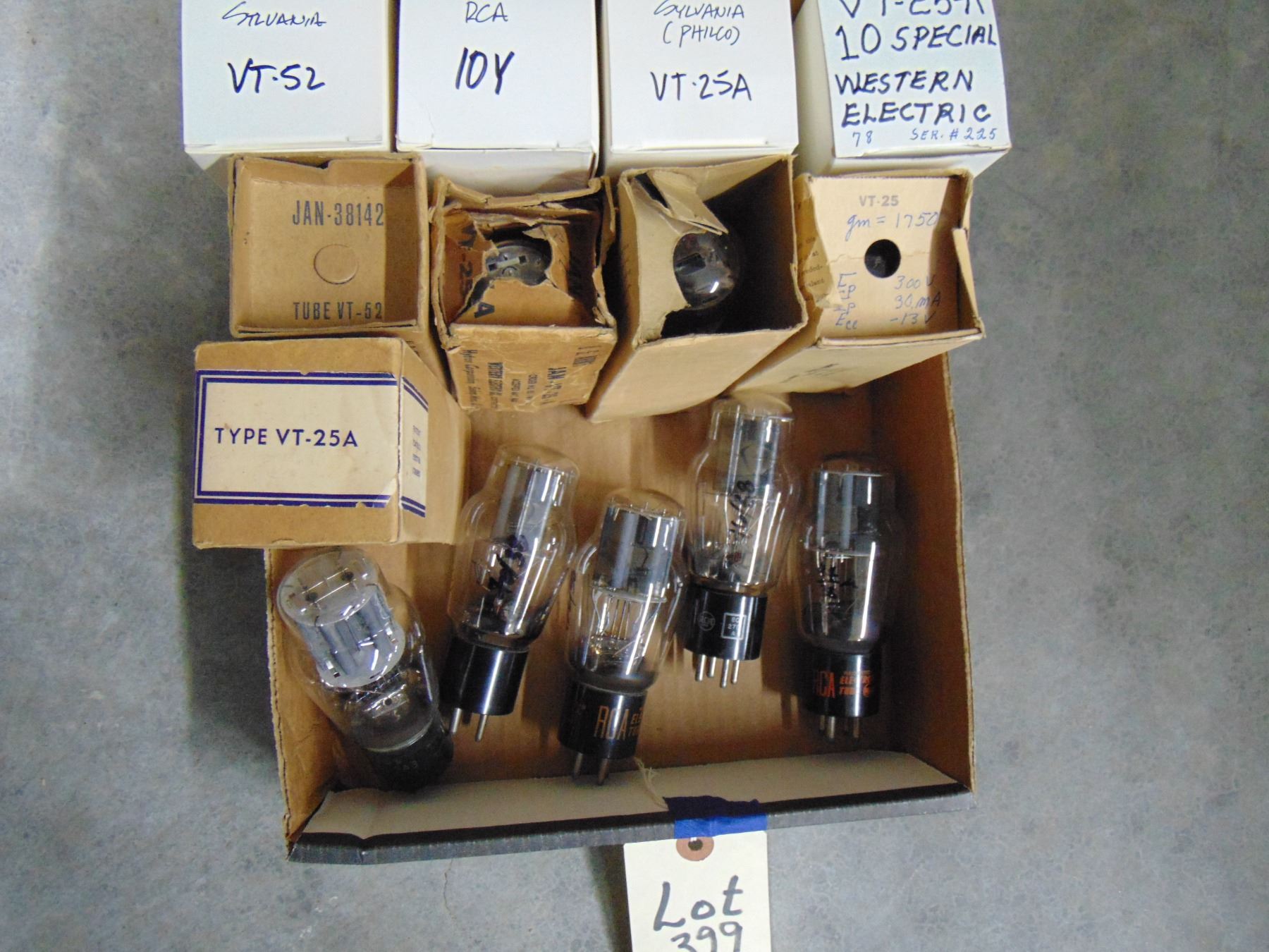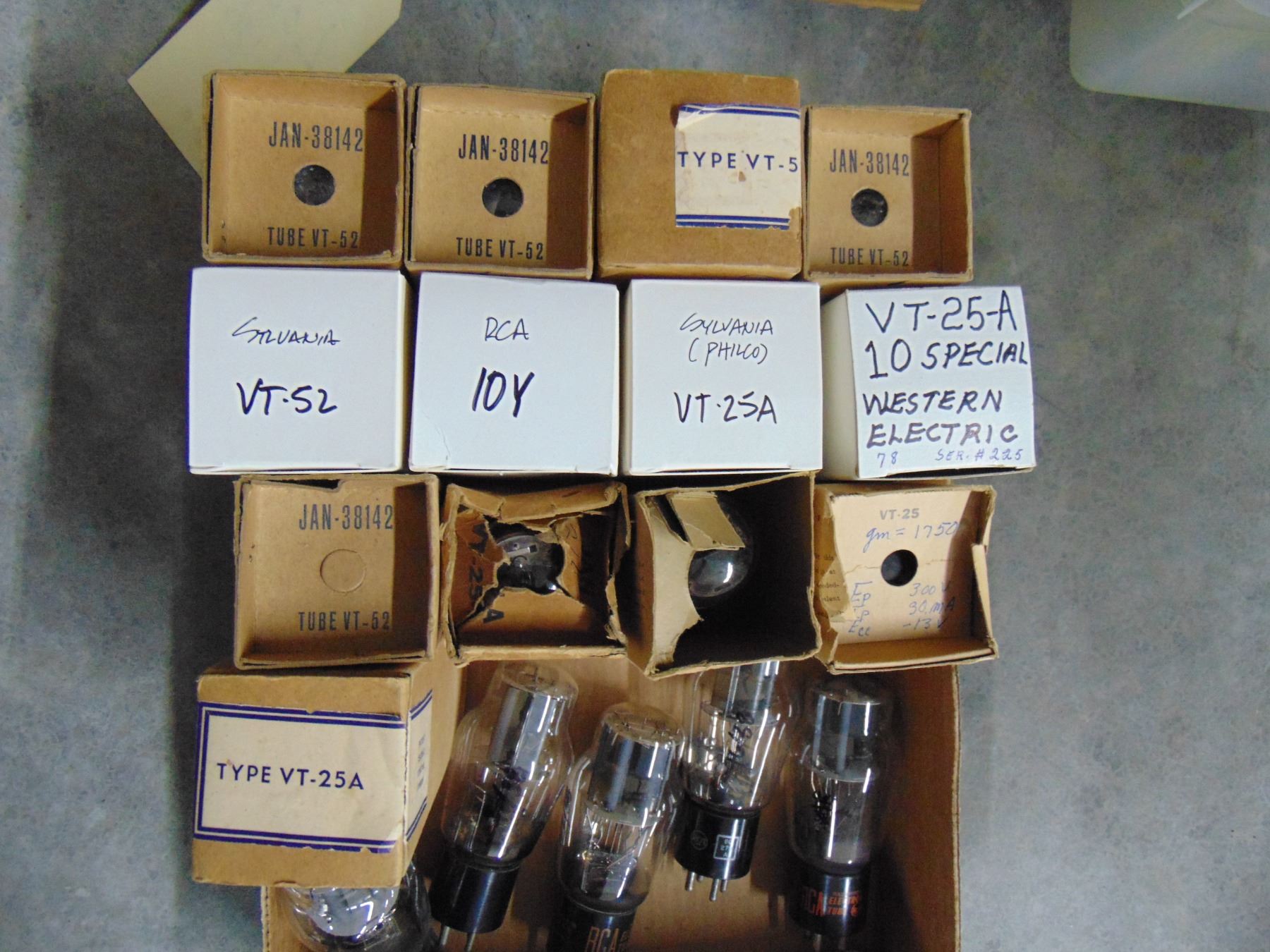 Flat of tubes; new and good tested type VT25A, 10Y, VT52, and RCA 2A3 tubes; 18 tubes; The 38142s are both NOS Hytron. There are two blue label VT-52's, one is black base WE with etching other is WE porcelain base.