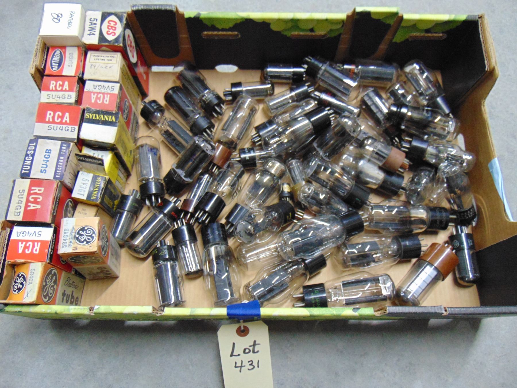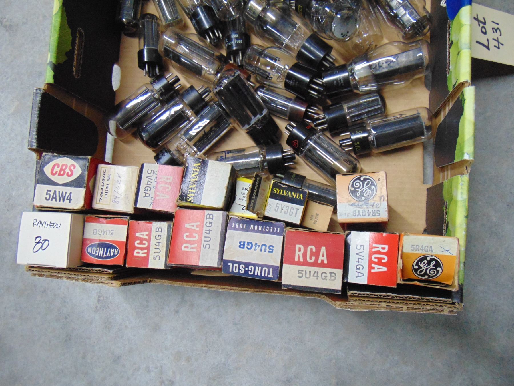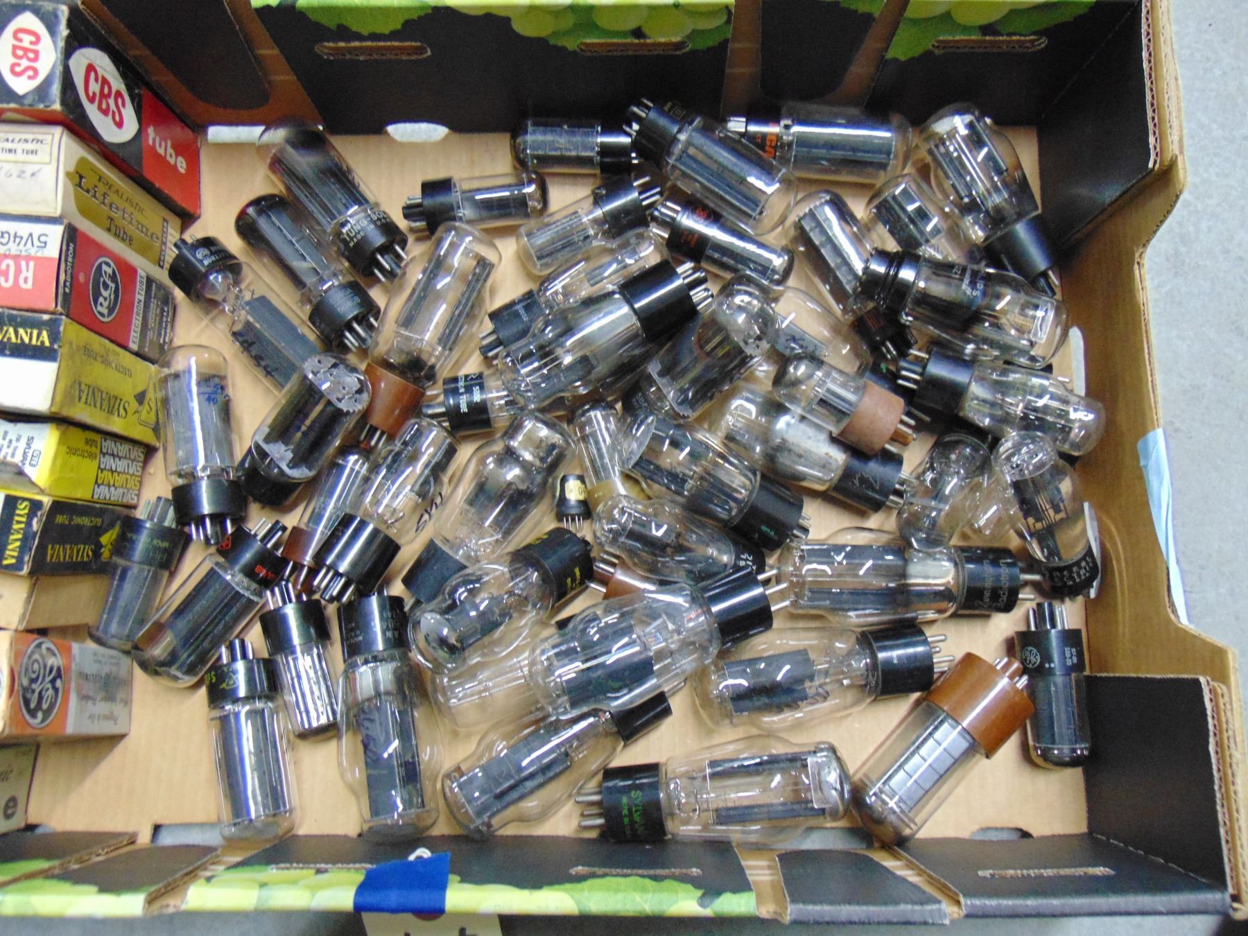 Flat of tubes; new and good used rectifier tubes; approximately 55
