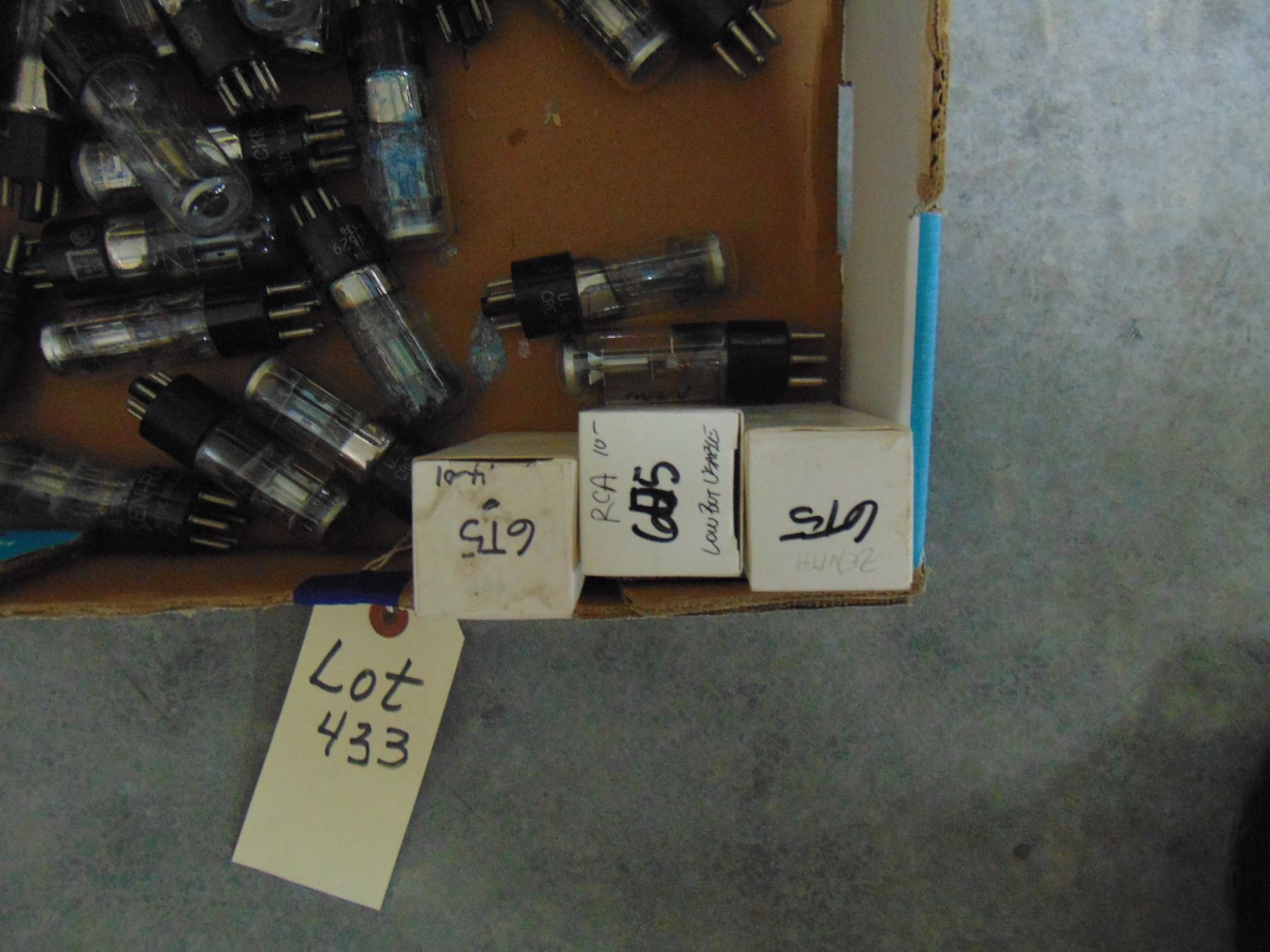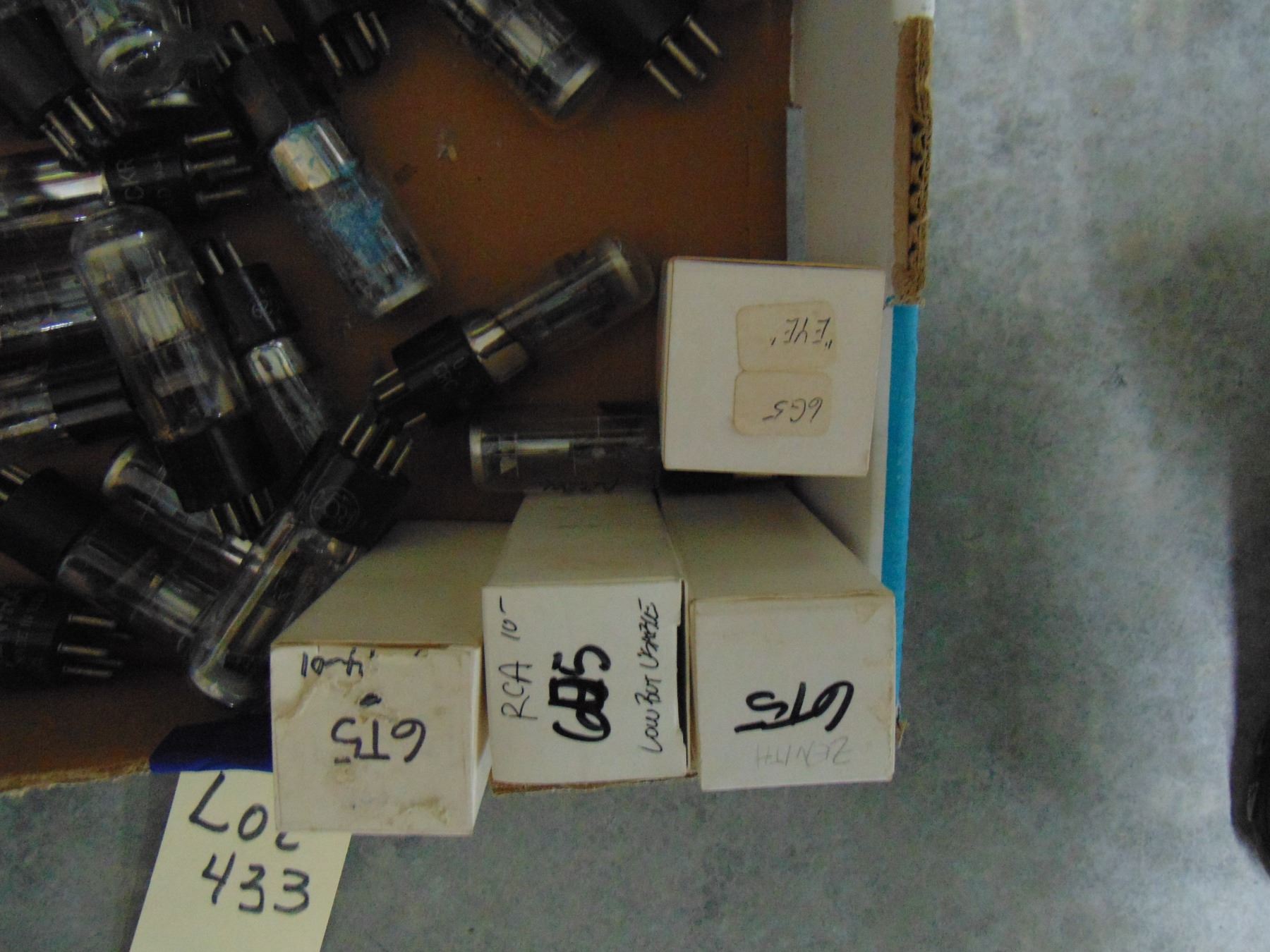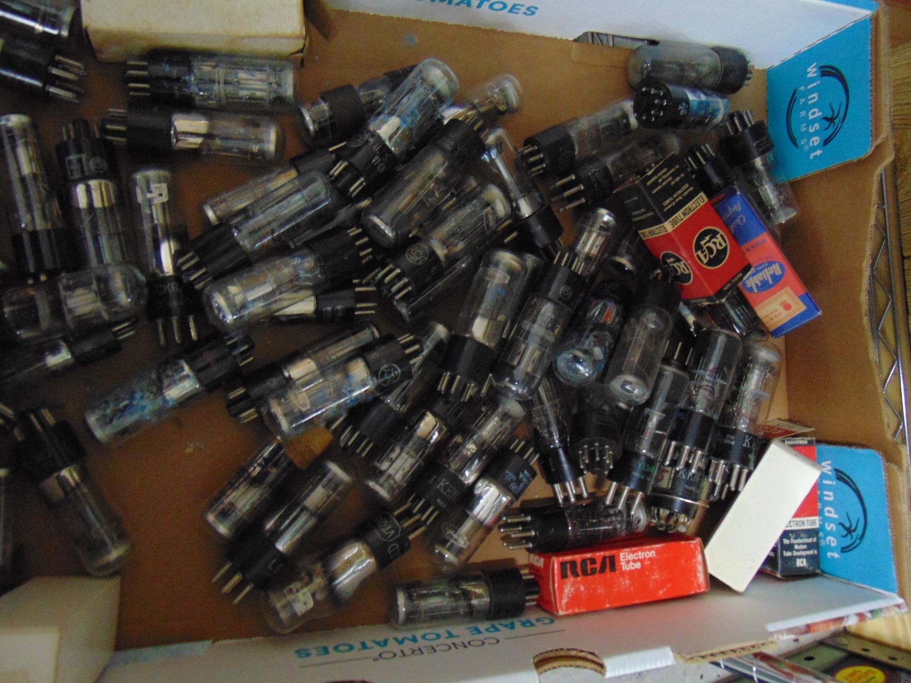 Flat of tubes; eye tubes; including 6E5 (about 30), 1629, 6U5, etc; most good to very good and bright. Includes two 6T5 good usable eye tubes used in Zenith radios. This is a good box.