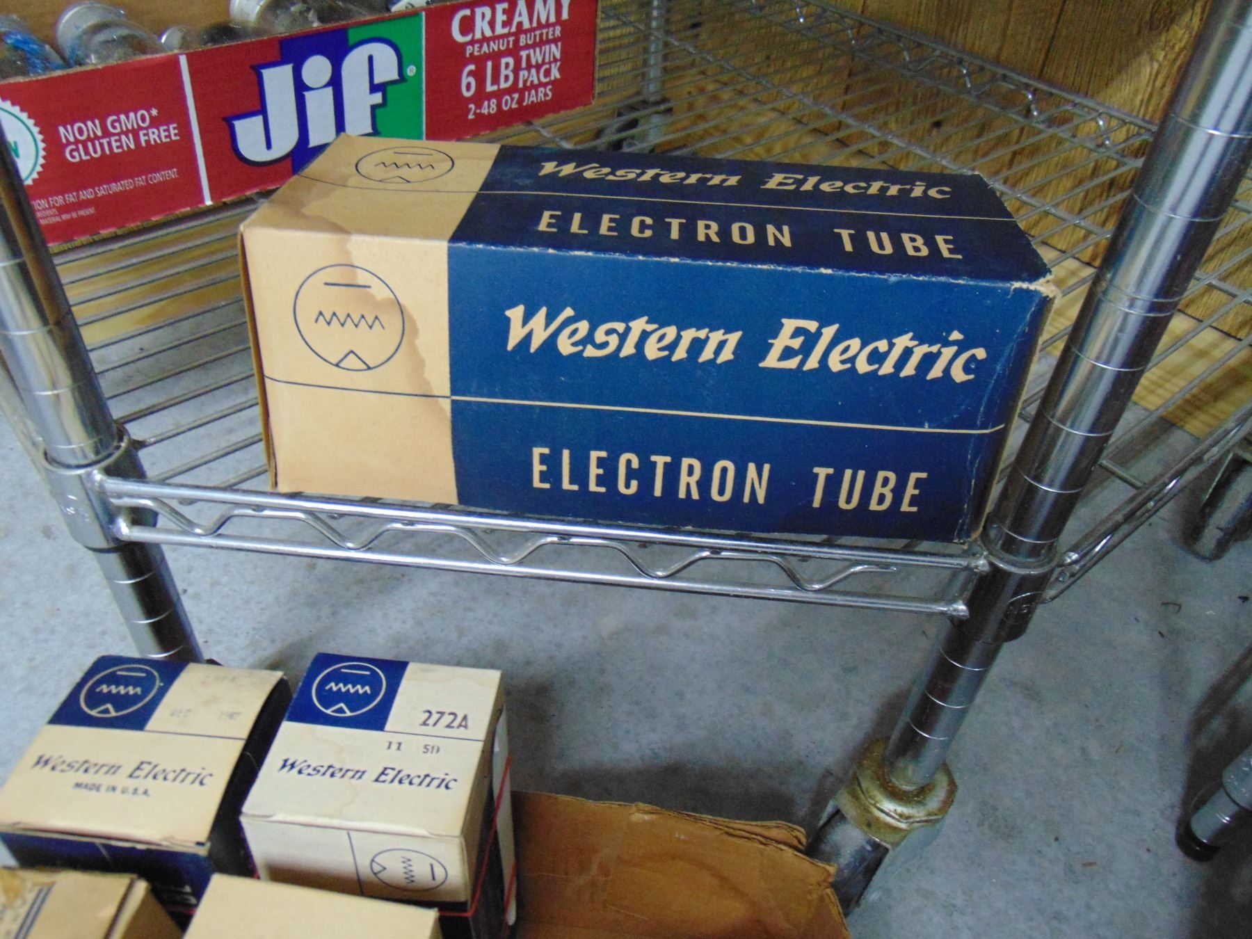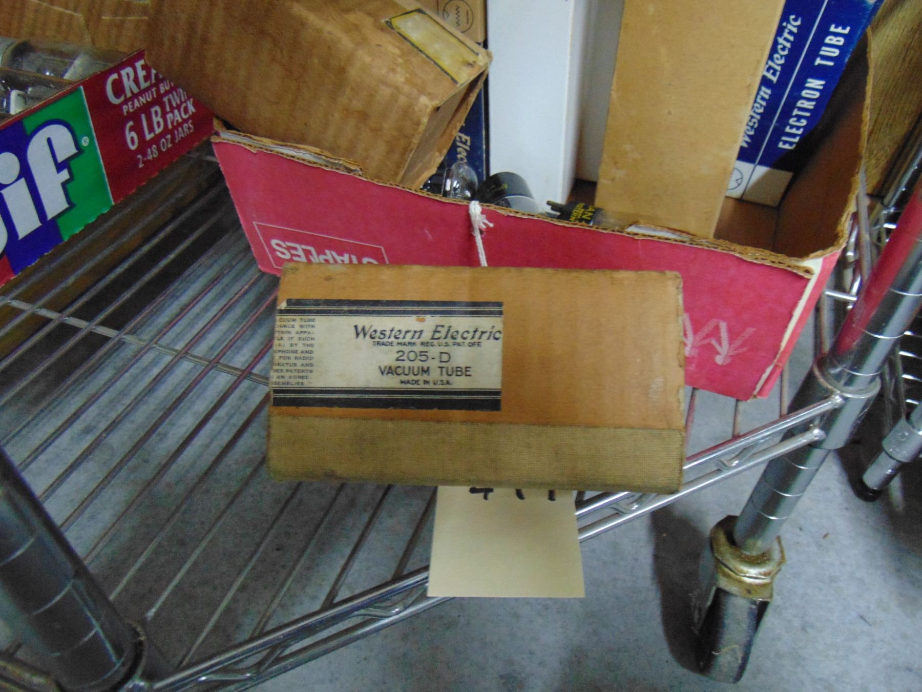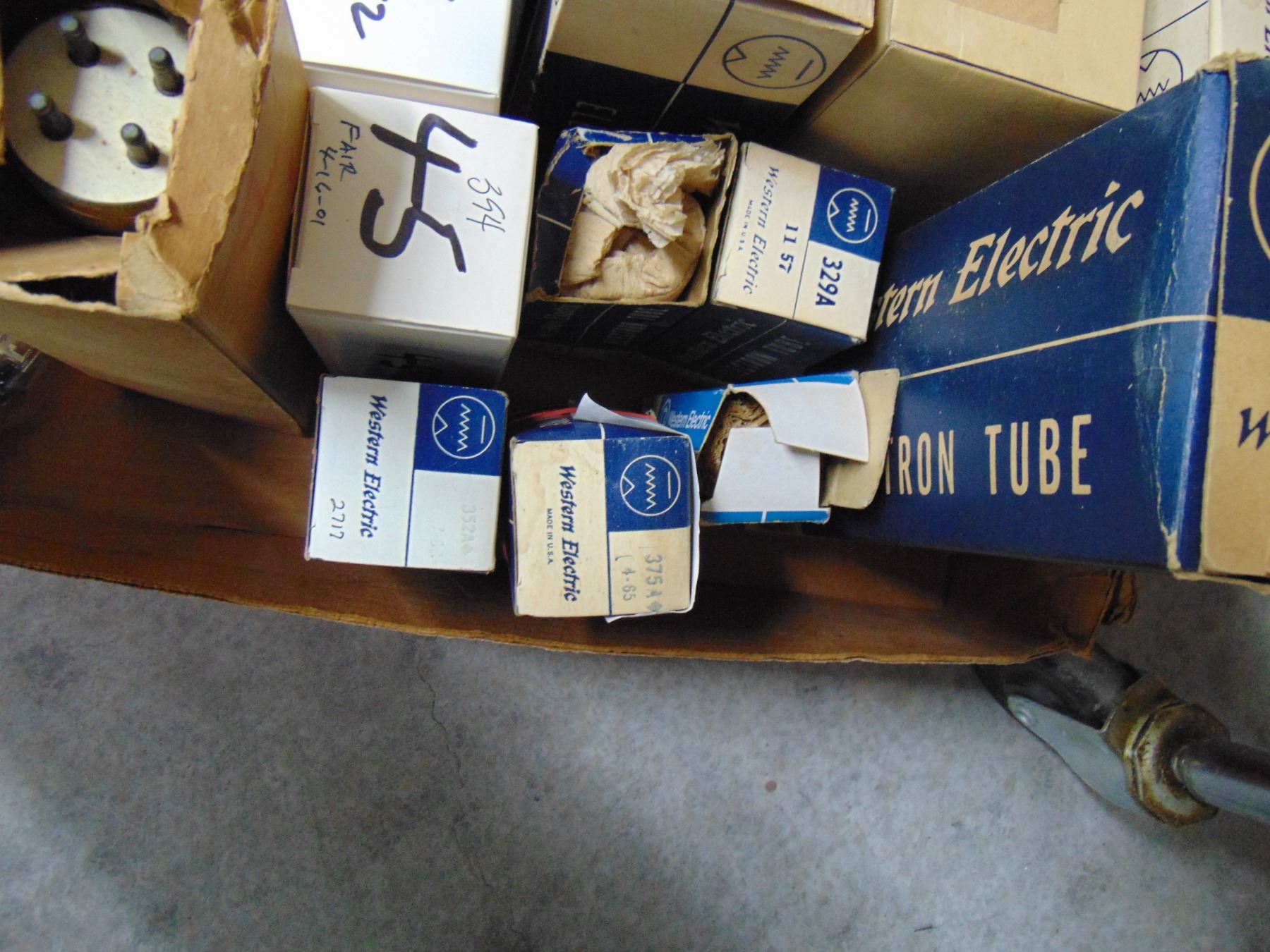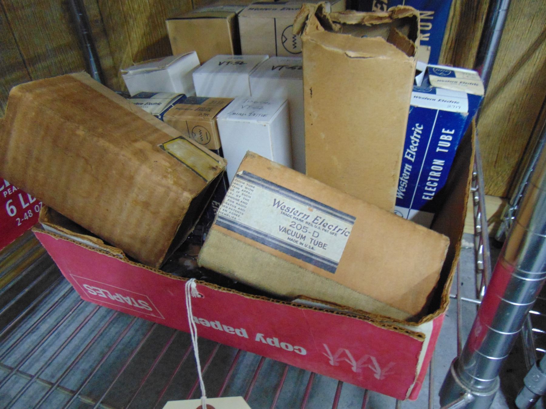 Flat of tubes; mostly Western Electric tubes; many NOS; also 2 Western Electric original boxes for 205-D (empty boxes); The loose tubes are all WE as follows: 306A etched, 102L, 101F, 311A