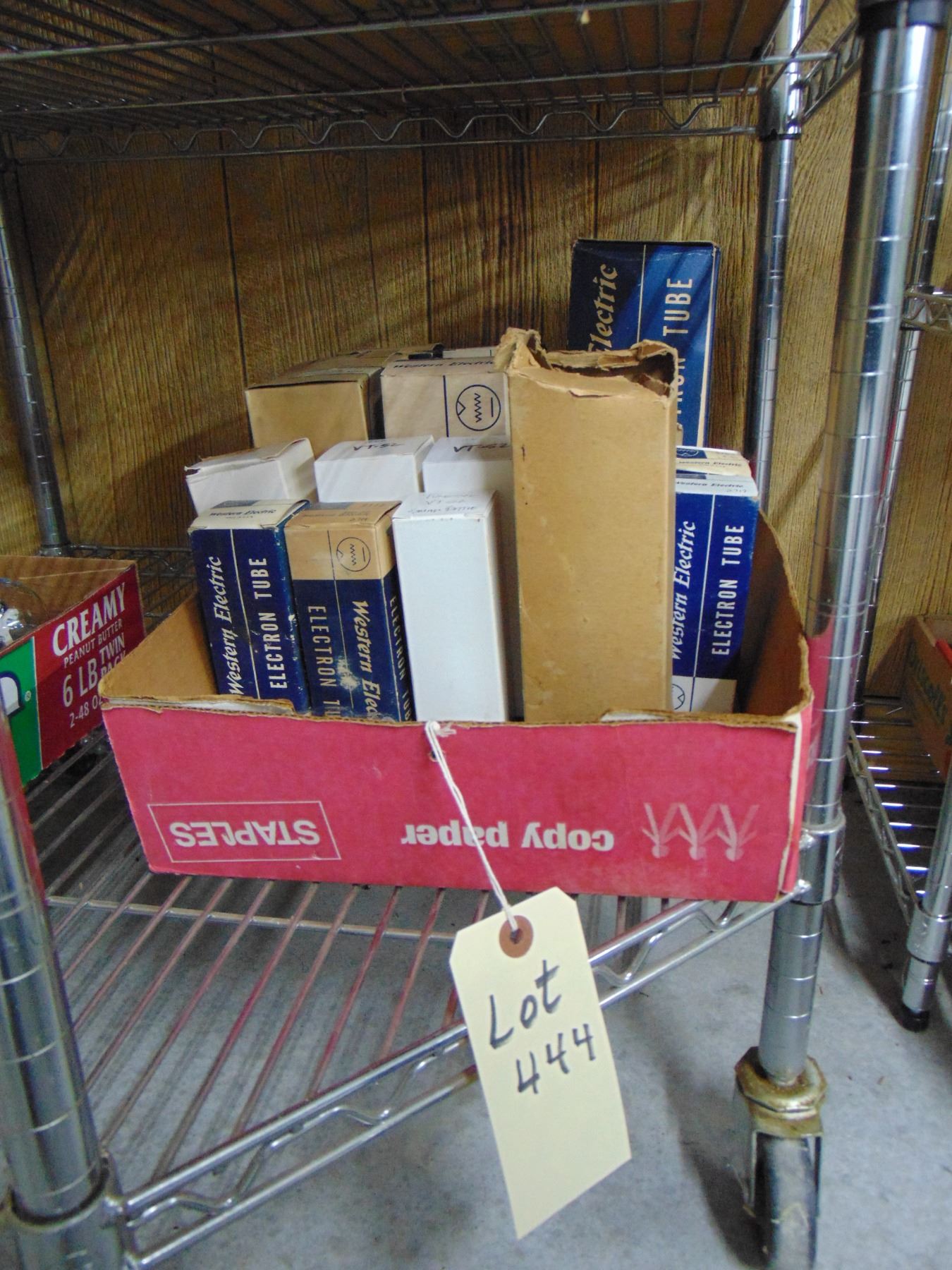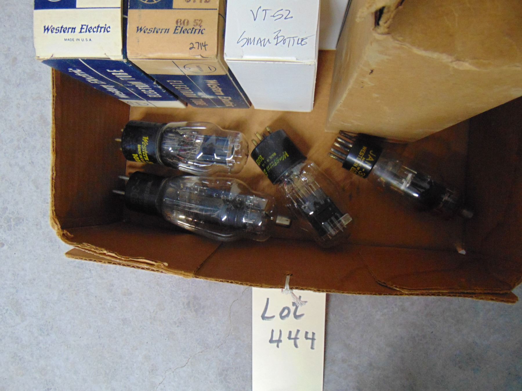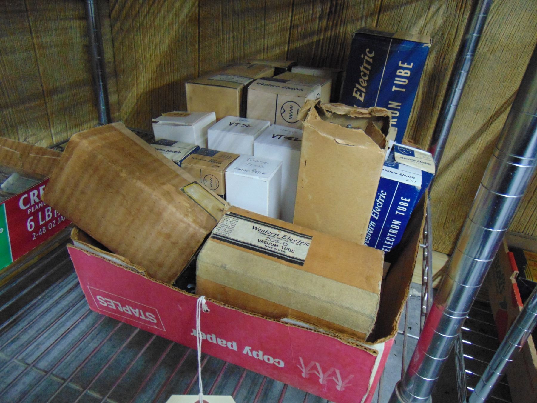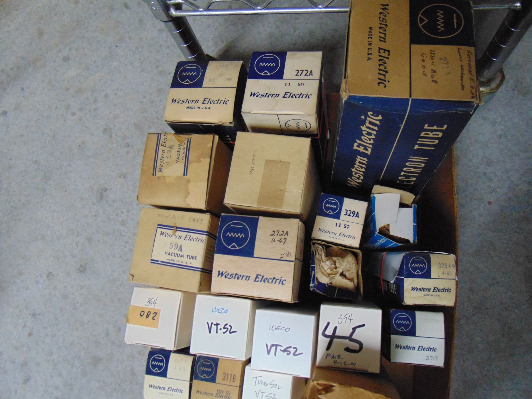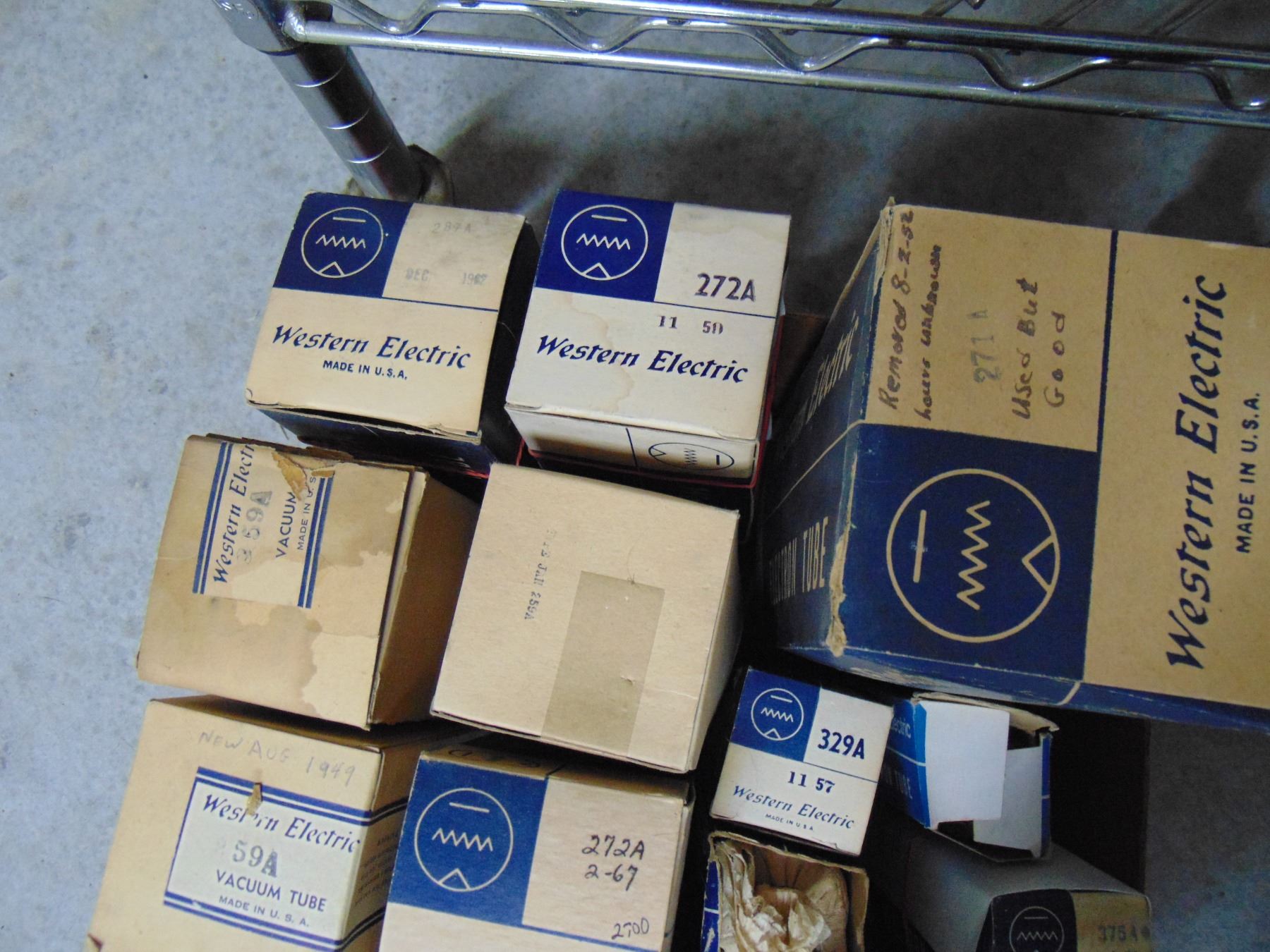 Flat of tubes; mostly Western Electric tubes; many NOS; also 2 Western Electric original boxes for 205-D (empty boxes); The loose tubes are all WE as follows: 306A etched, 102L, 101F, 311A