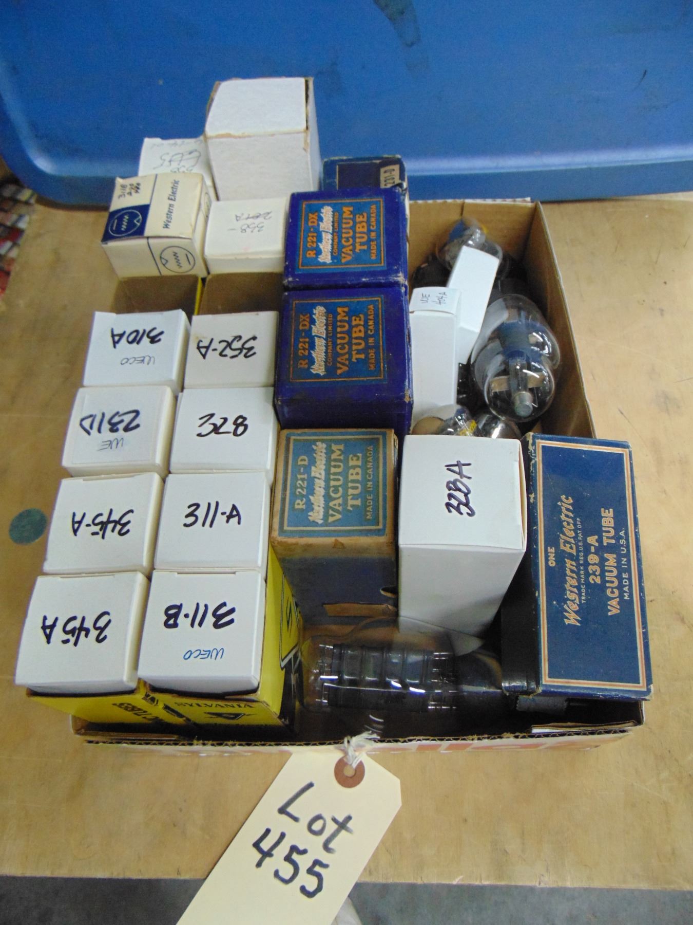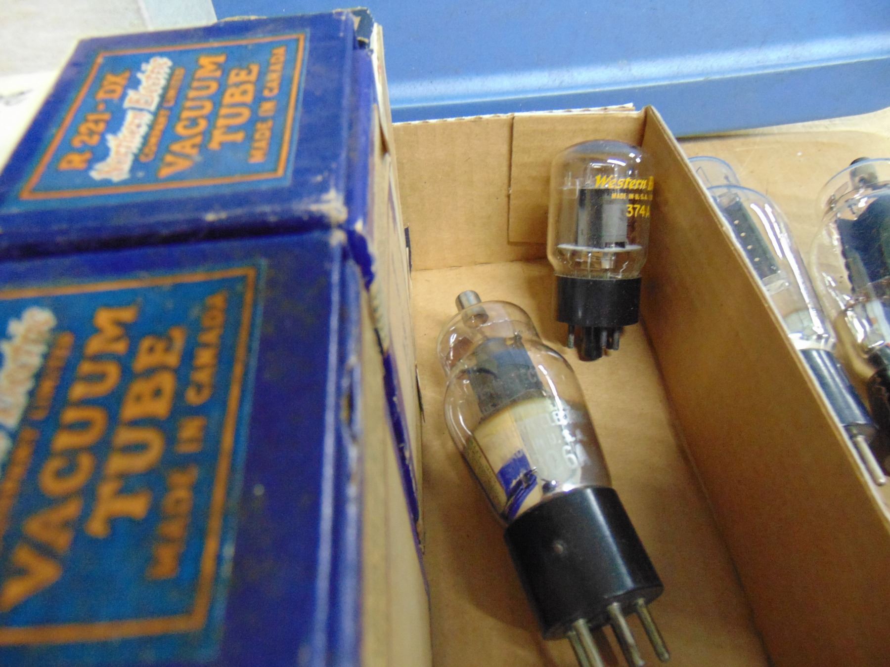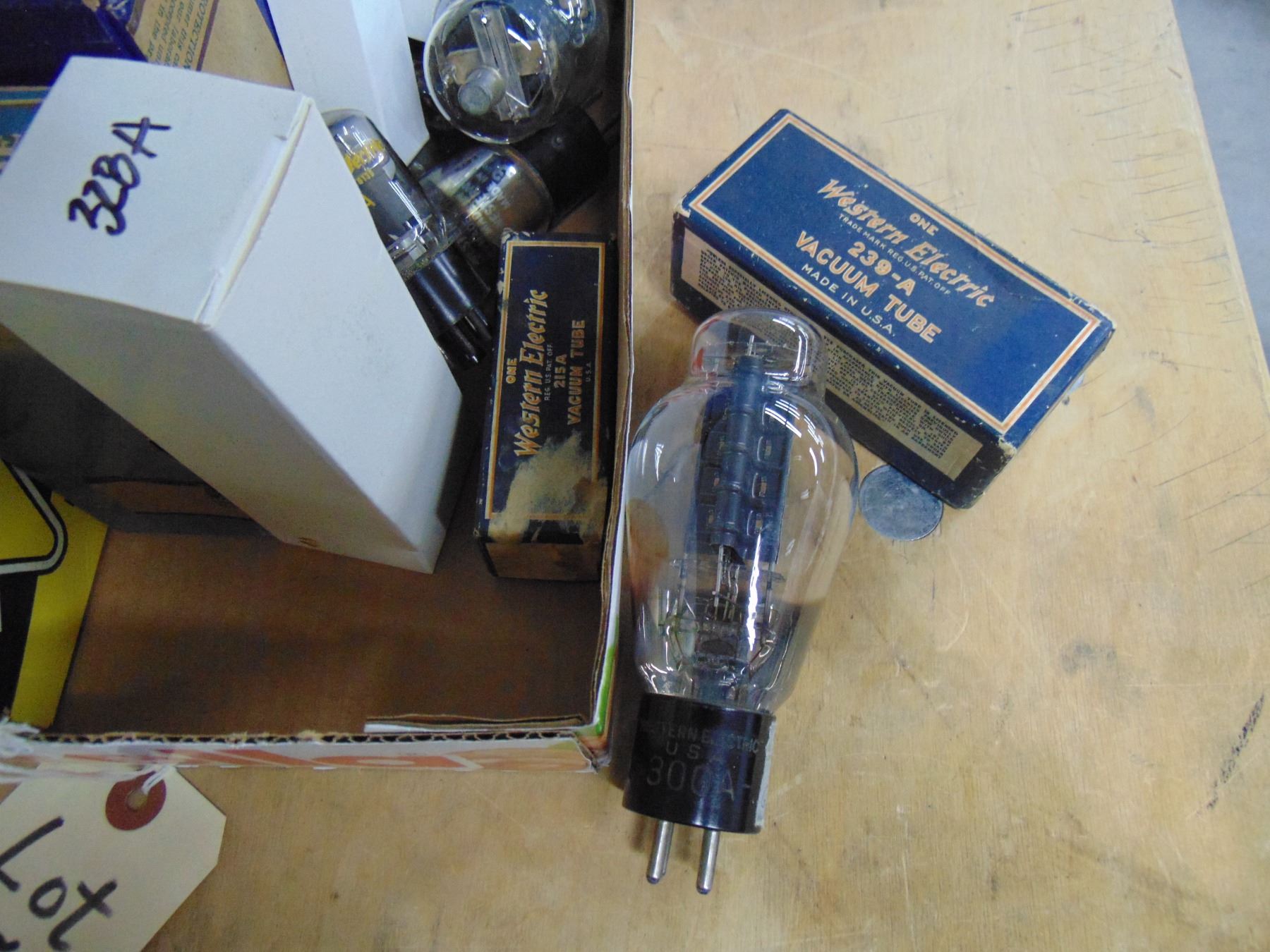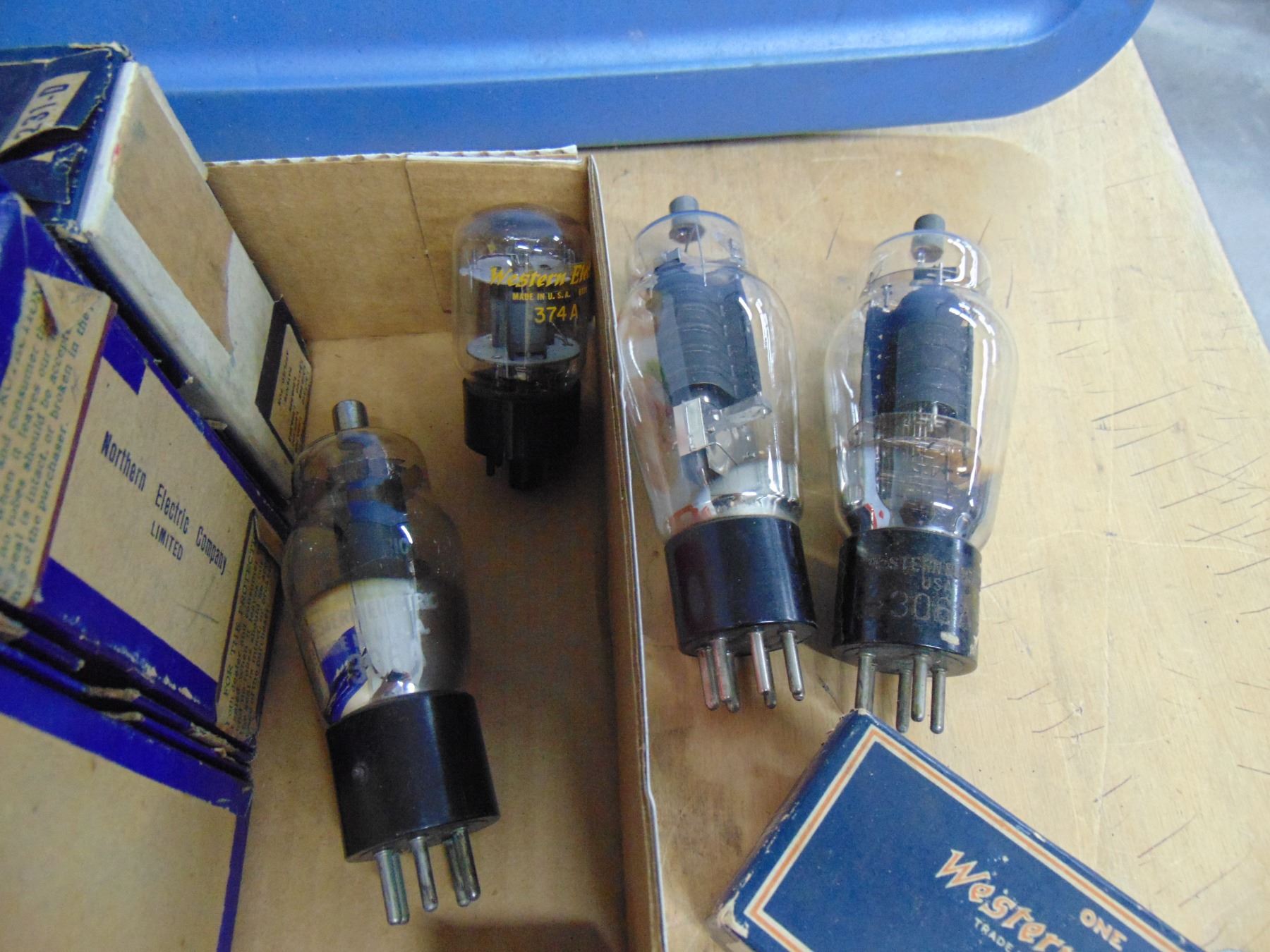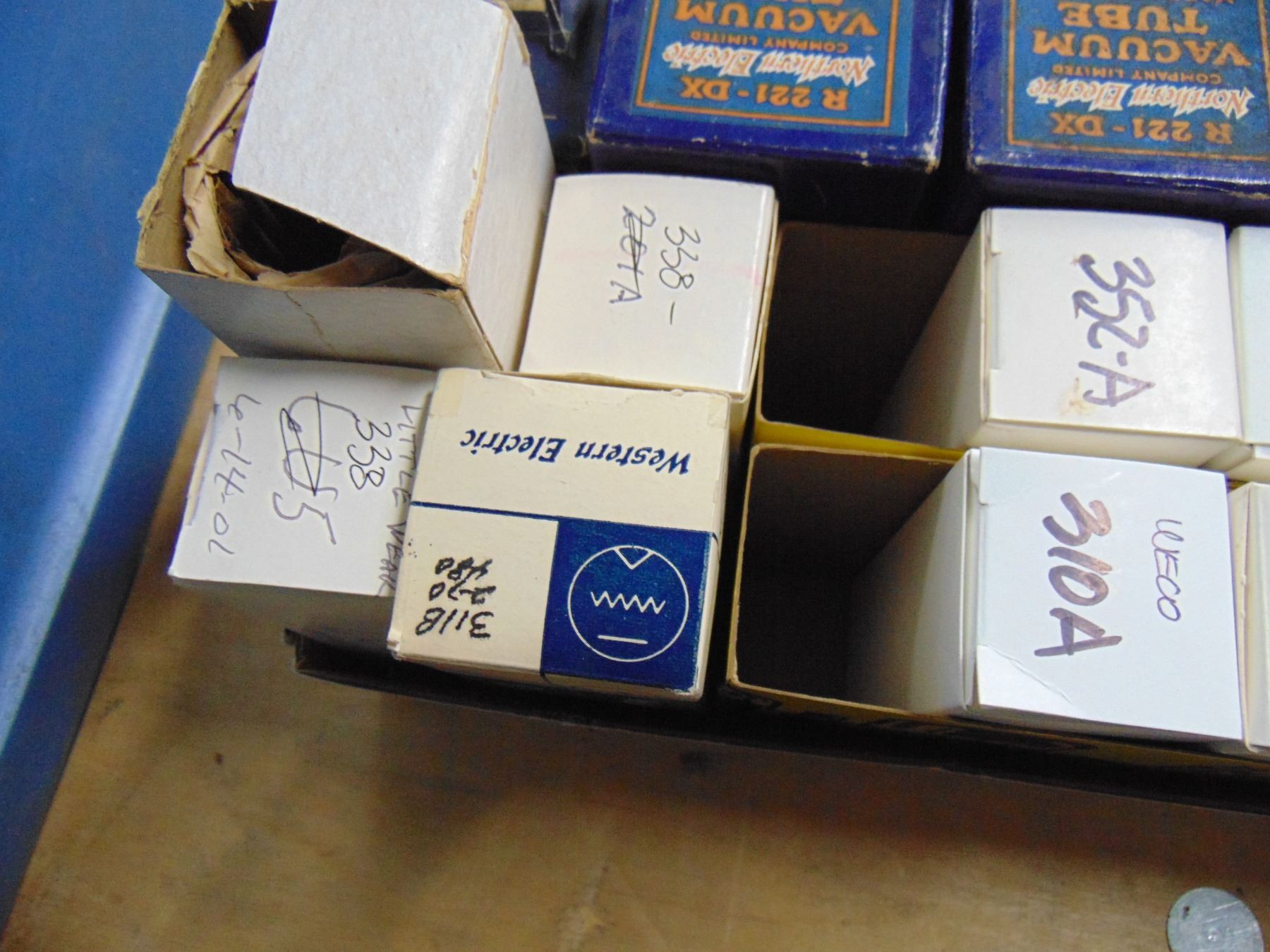 Flat of tubes; mostly Western Electric tubes; some NOS; includes a 300A that tests gassy; approximately 25; Loose tubes include: two 374A, 300A etched (tag says the emission is 81/58 but the tube tests gassy), 306A; only marking I can find on the next tube is X96012; tall tube standing without box is an etched 306A. Tube in tall white box is 311A. All tubes are WE
