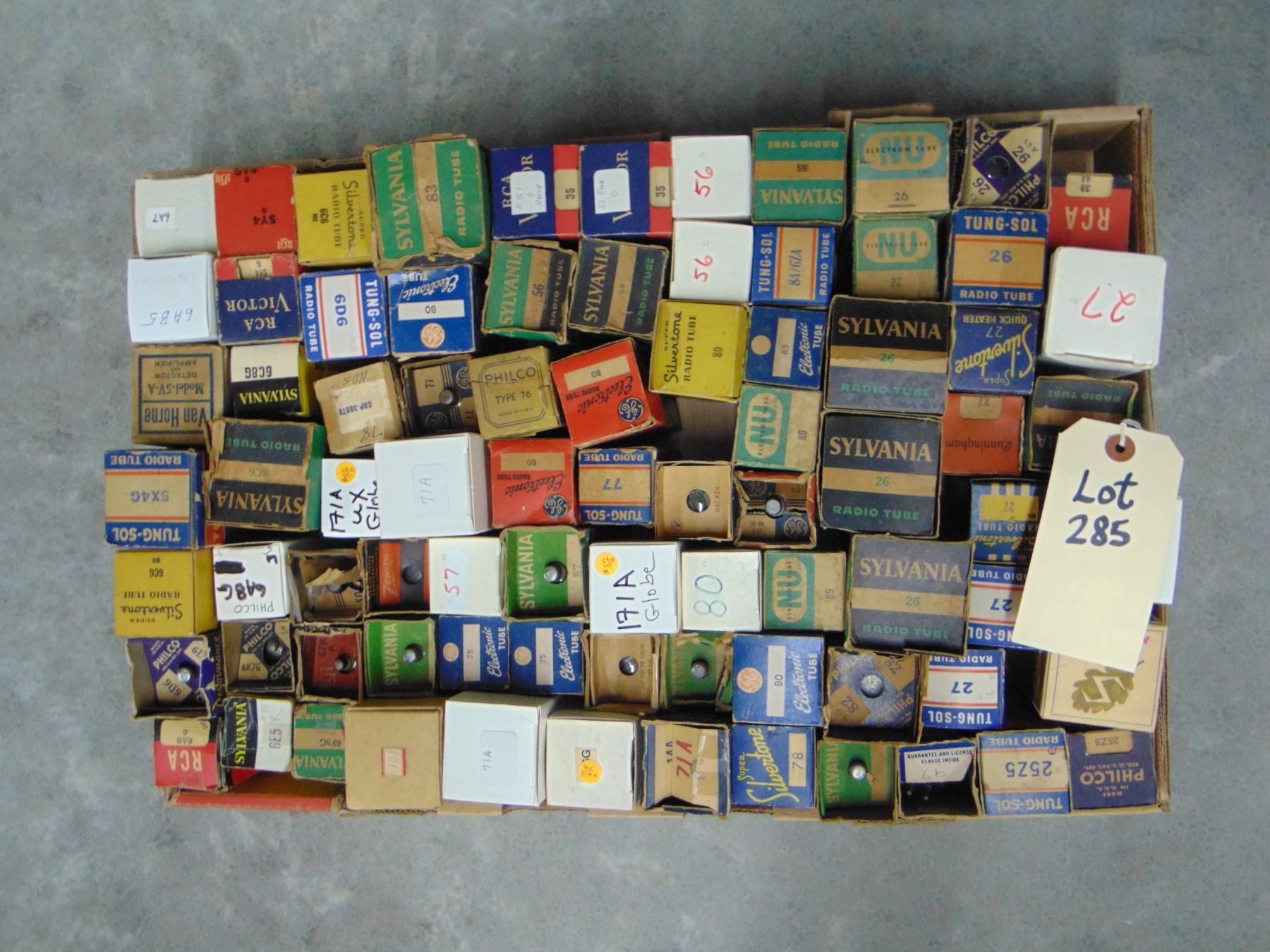 Flat of tubes; mostly NOS; approximately 80; UPDATE: The Sylvania 6E5 tube in this lot test marginal at best. It appears to be NOS, but does not test that way.