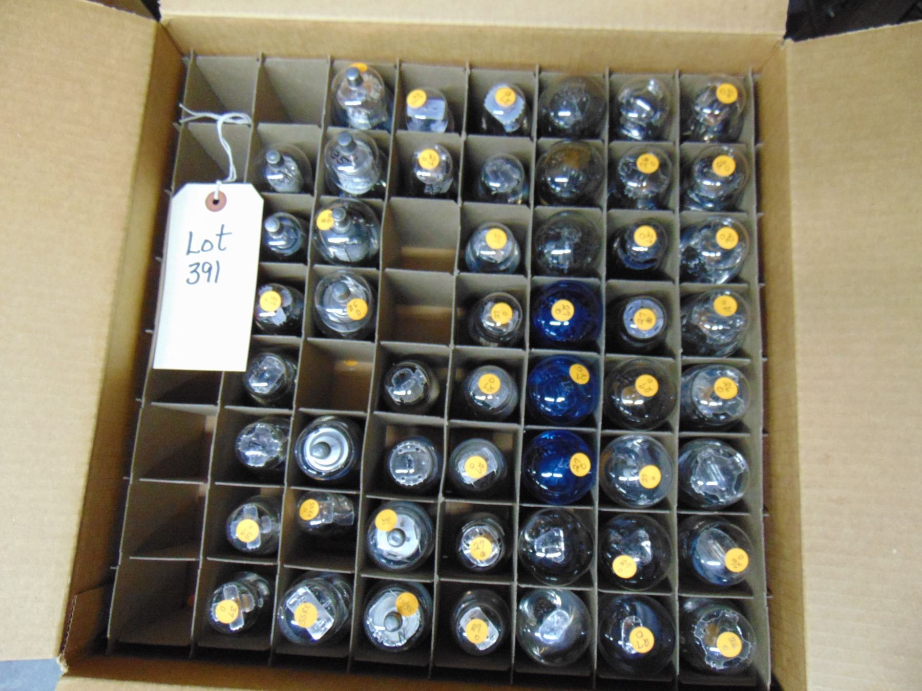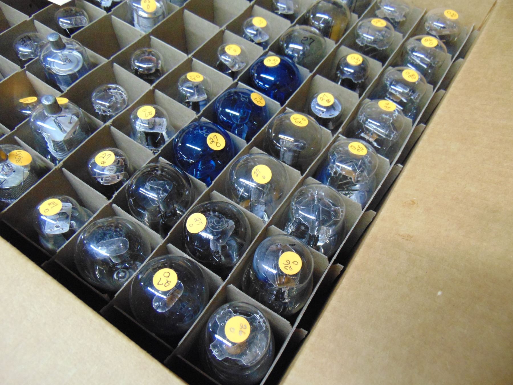 Box of tubes; mostly tested pulls, including 26, 27, etc.; has 3 blue arcturus type 27 tubes, tested good