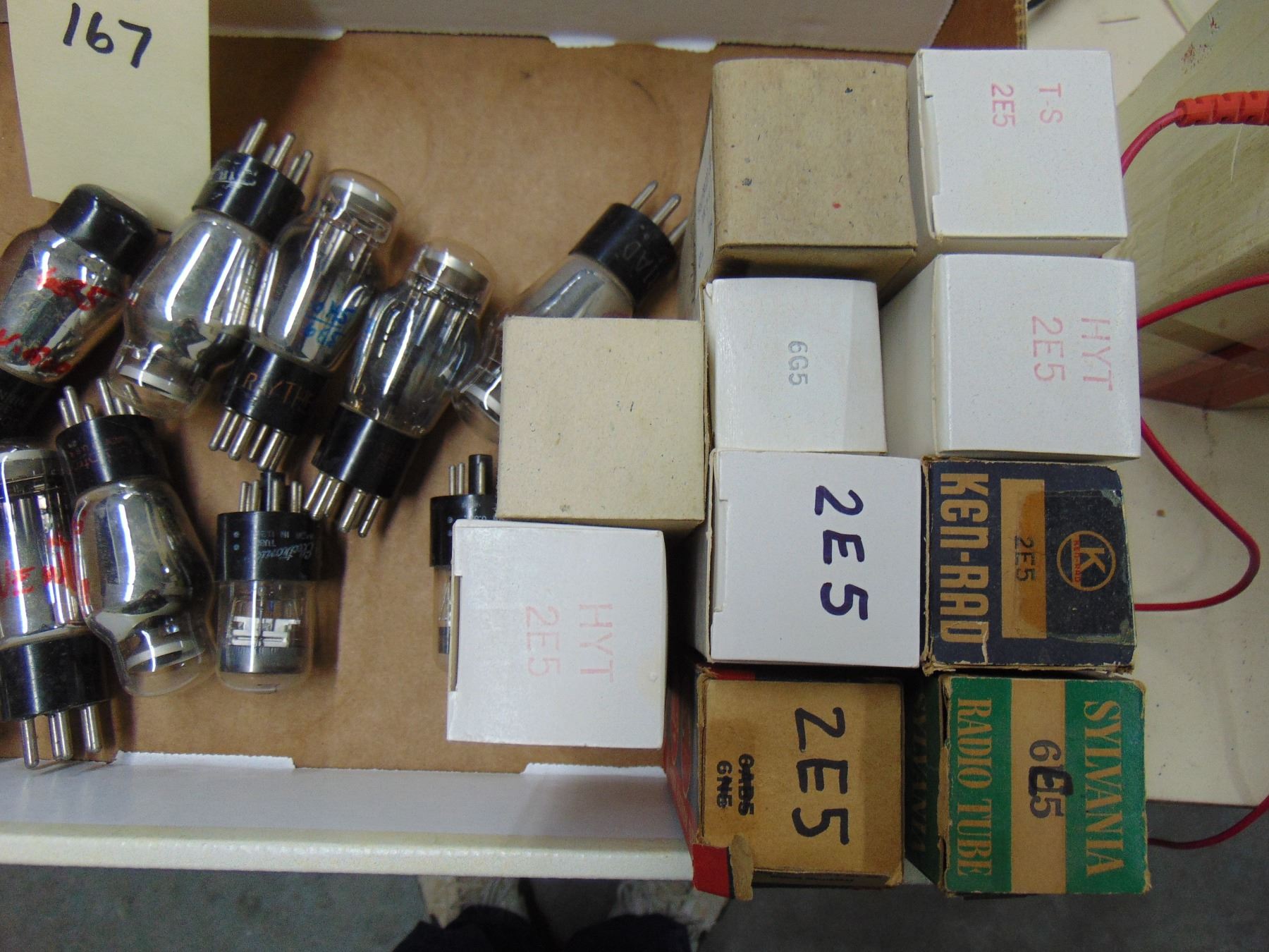 Flat of eye tubes; some NOS; includes 2E5, 6E5, 6G5, 6AB5, CV51, etc.; all tested; some weak; 20 tubes