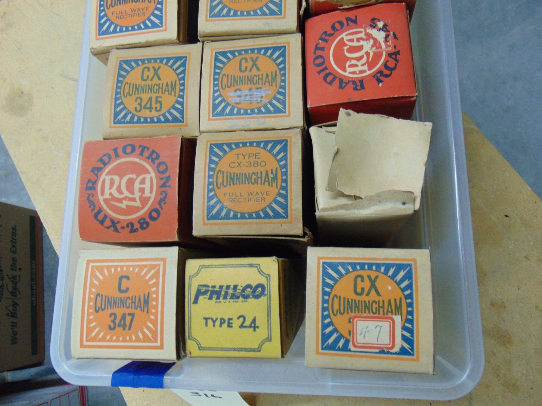 Flat of tubes; 15 tubes; There is a globe type 50 in this lot. It measures 62/38 on TV-7D; mostly used that have been reboxed, not tested; some are new