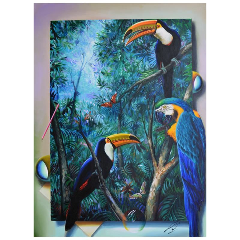 "Tucans and Parrots" is an original painting, oil on canvas, by Ferjo. Hand signed by the artist, this piece comes with a letter of authenticity. Measures approx. 40" x 30" (image).