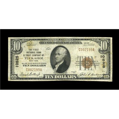 <B>Tuckahoe, NY</B></I> - $10 1929 Ty. 1 <B>The First NB & TC </B></I> Ch. # 10525<BR>Another Westchester County 1929 note. This new addition to the census becomes the ninth survivor of its type and denomination documented. <B>Fine,</B></I> with a few light discolorations on the face, it should sell for about...
