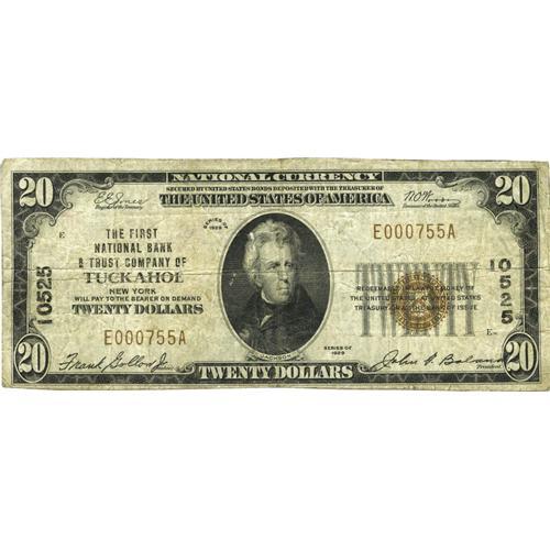 <B>Tuckahoe, NY</B></I> - $20 1929 Ty. 1 <B>The First NB & TC</B></I> Ch. # 10525<BR>Although the census now stands at 32 with the discovery of this example, just seven are of the $20 Type 2 variety. A nice <B>Fine</B></I> from strongly collected Westchester County.
