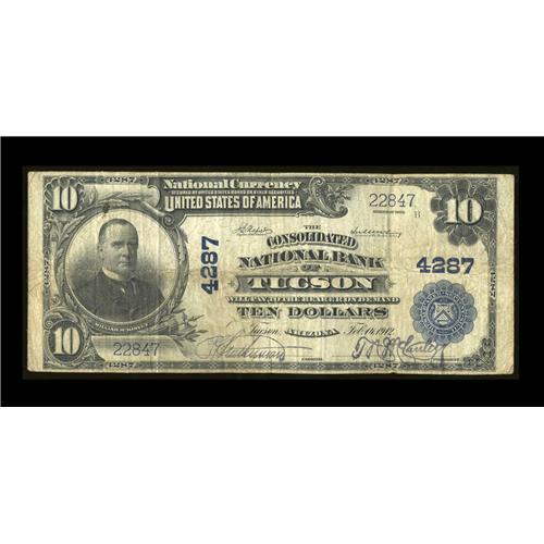 <B>Tucson, AZ</B></I> - $10 1902 Plain Back Fr. 628 <B>The Consolidated NB</B></I> Ch. # 4287<BR>A more than decent large size note from a state where material of this kind has simply disappeared from the marketplace in recent years. <B>Fine,</B></I> with strong signatures.
