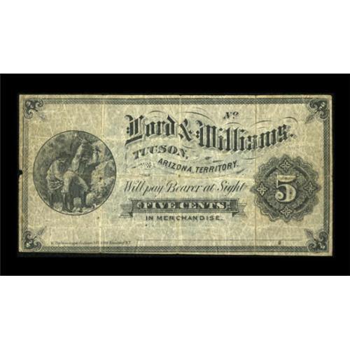 <B>Tucson, AZ</B></I> <B>Territory - Lord & Williams</B></I> 5c<BR> From our 2004 Central States sale, "A very rare piece of Arizona Territorial scrip, the first we have had to offer from this issuer in many years. <B>Fine-Very Fine,</B></I> with a tiny chip out of the left margin, a great western item which will likely reach or even exceed..."<BR><BR><b>Shipping:</b> Coins & Currency (<a target="_blank" href="http://www.heritageauctions.com/common/shipping.php">view shipping information</a>)