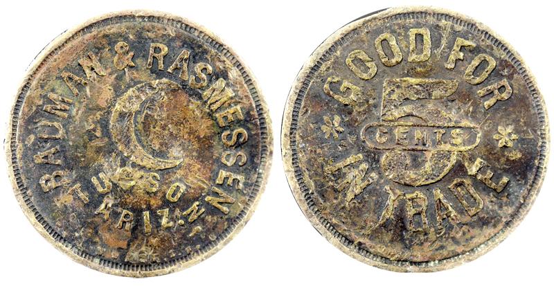 Obverse: Bauman & Rasmessen / (crescent) / Tucson / Ariz.; Reverse: Good For / 5 cents / In Trade. R10. Good condition, but a dug token.