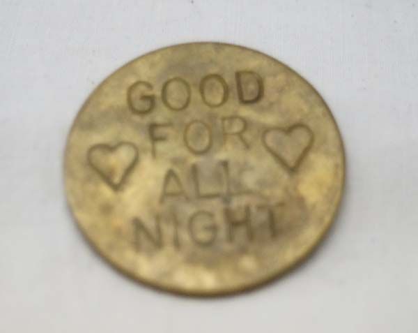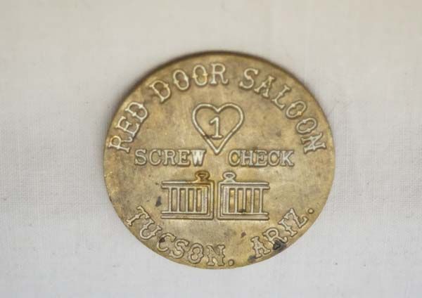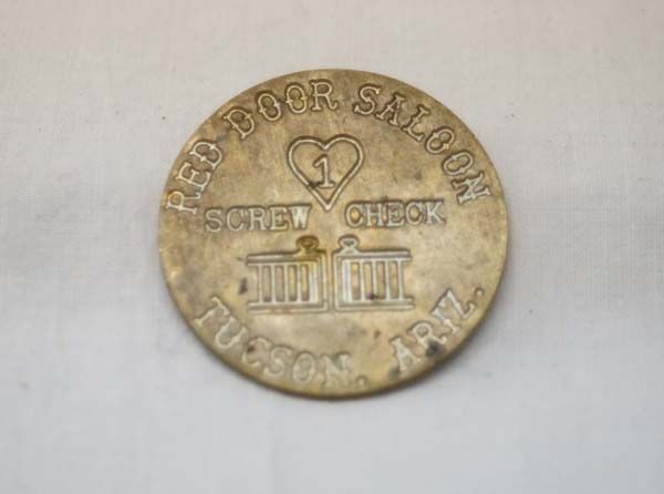 Tucson, Arizona Red Door Saloon Token Replica, on one side it says ''Red Door Saloon Screw Check Tucson, Ariz.'' and on the other side it says ''Good For All Night''